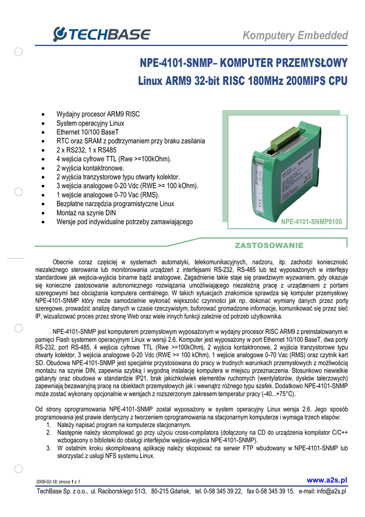 Komputery Embedded NPE-4101-SNMP– KOMPUTER PRZEMYSŁOWY Linux ARM9 32-bit RISC 180MHz 200MIPS CPU Wydajny procesor ARM9 RISC System operacyjny Linux Ethernet 10/100 BaseT RTC oraz SRAM z podtrzymaniem przy braku zasilania 2 x RS232, 1 x RS485 4 wejścia cyfrowe TTL (Rwe >=100kOhm). 2 wyjścia kontaktronowe. 2 wyjścia tranzystorowe typu otwarty kolektor. 3 wejścia analogowe 0-20 Vdc (RWE >= 100 kOhm). 1 wejście analogowe 0-70 Vac (RMS). Bezpłatne narzędzia programistyczne Linux Montaż na szynie DIN Wersje pod indywidualne potrzeby zamawiającego NPE-4101-SNMP9100 ZASTOSOWANIE Obecnie coraz częściej w systemach automatyki, telekomunikacyjnych, nadzoru, itp. zachodzi konieczność niezależnego sterowania lub monitorowania urządzeń z interfejsami RS-232, RS-485 lub też wyposażonych w interfejsy standardowe jak wejścia-wyjścia binarne bądź analogowe. Zagadnienie takie staje się prawdziwym wyzwaniem, gdy okazuje się konieczne zastosowanie autonomicznego rozwiązania umożliwiającego niezależną pracę z urządzeniami z portami szeregowymi bez obciążania komputera centralnego. W takich sytuacjach znakomicie sprawdza się komputer przemysłowy NPE-4101-SNMP który może samodzielnie wykonać większość czynności jak np. dokonać wymiany danych przez porty szeregowe, prowadzić analizę danych w czasie rzeczywistym, buforować gromadzone informacje, komunikować się przez sieć IP, wizualizować proces przez stronę Web oraz wiele innych funkcji zależnie od potrzeb użytkownika. NPE-4101-SNMP jest komputerem przemysłowym wyposażonym w wydajny procesor RISC ARM9 z preinstalowanym w pamięci Flash systemem operacyjnym Linux w wersji 2.6. Komputer jest wyposażony w port Ethernet 10/100 BaseT, dwa porty RS-232, port RS-485, 4 wejścia cyfrowe TTL (Rwe >=100kOhm), 2 wyjścia kontaktronowe, 2 wyjścia tranzystorowe typu otwarty kolektor, 3 wejścia analogowe 0-20 Vdc (RWE >= 100 kOhm), 1 wejście analogowe 0-70 Vac (RMS) oraz czytnik kart SD. Obudowa NPE-4101-SNMP jest specjalnie przystosowana do pracy w trudnych warunkach przemysłowych z możliwością montażu na szynie DIN, zapewnia szybką i wygodną instalację komputera w miejscu przeznaczenia. Stosunkowo niewielkie gabaryty oraz obudowa w standardzie IP21, brak jakichkolwiek elementów ruchomych (wentylatorów, dysków talerzowych) zapewniają bezawaryjną pracę na obiektach przemysłowych jak i wewnątrz różnego typu szafek. Dodatkowo NPE-4101-SNMP może zostać wykonany opcjonalnie w wersjach z rozszerzonym zakresem temperatur pracy (-40...+75°C). Od strony oprogramowania NPE-4101-SNMP został wyposażony w system operacyjny Linux wersja 2.6. Jego sposób programowania jest prawie identyczny z tworzeniem oprogramowania na stacjonarnym komputerze i wymaga trzech etapów: 1. Należy napisać program na komputerze stacjonarnym. 2. Następnie należy skompilować go przy użyciu cross-compilatora (dołączony na CD do urządzenia kompilator C/C++ wzbogacony o biblioteki do obsługi interfejsów wejścia-wyjścia NPE-4101-SNMP). 3. W ostatnim kroku skompilowaną aplikację należy skopiować na serwer FTP wbudowany w NPE-4101-SNMP lub skorzystać z usługi NFS systemu Linux. 2008-02-18; strona 1 z 1 www.a2s.pl TechBase Sp. z o.o., ul. Raciborskiego 51/3, 80-215 Gdańsk, tel. 0-58 345 39 22, fax 0-58 345 39 15, e-mail: [email protected] Komputery Embedded Konstrukcja sprzętowa NPE-4101-SNMP jest oparta na procesorze ARM9 32-bit RISC CPU 180MHz, 32MB SDRAM, 8MB Flash. NPE-4101-SNMP posiada zegar czasu rzeczywistego oraz pamięć SRAM podtrzymywaną przez okresy braku napięcia zasilającego, czytnik kart SD oraz Watch Dog Timer zabezpieczający przez zawieszeniem się komputera. Jako interfejsy wejścia-wyjścia komputer posiada dwa porty RS232, port RS485, cztery wejścia cyfrowe TTL (Rwe >=100kOhm), dwa wyjścia kontaktronowe, dwa wyjścia tranzystorowe typu otwarty kolektor, trzy wejścia analogowe 0-20 Vdc (RWE >= 100 kOhm), jedno wejście analogowe 0-70 Vac (RMS). Opcjonalnie NPE-4101-SNMP może zostać wyposażony w większą ilość pamięci SDRAM oraz Flash zależnie od wymagań użytkownika, a producent, firma TechBase Sp. z o.o., oferuje możliwość zamówienia wersji dedykowanych wyposażonych w niestandardowe wersje interfejsów oraz zasobów wewnętrznych. NPE-4101-SNMP wraz z pozostałymi komputerami tej rodziny to seria przemysłowych komputerów wbudowanych charakteryzujących się: pełną, gotową platformą (sprzęt + zainstalowany system operacyjny Linux + darmowe narzędzia i biblioteki programistyczne dla C/C++) przystosowaną do pracy w trudnych warunkach otoczenia (zakres temperatury pracy nawet od -40 ~ +75°C) oraz wysoką niezawodnością działania. PARAMETRY TECHNICZNE Typ: NPE-4101-SNMP System CPU ARM9 32-bit RISC CPU, 180 MHz, 200 MIPS SDRAM 32 MB (opcjonalnie do 128 MB) Flash 8 MB (opcjonalnie do 16 MB) Czytnik kart SD x 1 System operacyjny Linux v 2.6 RTC, SRAM 240 bajtów, Watch Dog Timer Interfejs Ethernet Ethernet 10/100 Mbps (złącze RJ45) 1.5 KV magnetic isolation Porty szeregowe 2 x RS-232, 1 x RS485, wbudowane zabezpieczenie 15 KV ESD Bity danych: 5, 6, 7, 8 Bity stopu: 1, 1.5, 2 Parzystość: None, Even, Odd, Space, Mark Prędkość: 50 bps do 921.6 Kbps Kontrolki LED, klawiatura, wejścia-wyjścia LED: Gotowość systemu x 1, użytkownika x 1 LAN 100M/Link x 2 (zintegrowana z gniazdem RJ45) 1 x Switch monostabilny (dostęp od czoła obudowy) 8 x DI, 6 x DO obciążalność 100 mA każde Parametry Mechaniczne Wymiary (Szerokość x Głębokość x Wysokość) 35 x 120 x 101 mm Waga 300g. Obudowa: ABS, montaż na szynie DIN Zasilanie Napięcie zasilające: 12 ~ 36 Vdc (opcjonalnie 12 ~ 48 Vdc – zakres telekomunikacyjny) Pobór mocy: 7W max Warunki pracy i przechowywania Temperatura pracy: -10 ~ 60°C wilgotność: 5 ~ 95% RH (bez kondensacji) opcjonalnie: -40 to 75°C (dla NPE-4101-SNMP-E). Temperatura przechowywania: -20 ~ 80°C wilgotność: 5 ~ 95% RH (bez kondensac