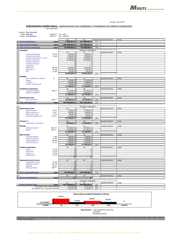 Wrocław, 2011-08-30 Indywidualny budżet domu - opracowywany przy współpracy z Inwestorem po ankiecie inwestycyjnej stan wykończony Inwestor: Piotr Kowalski Adres: Wrocław Projekt: Indywidualny 2 220,00 m 2 198,00 m pow. netto pow. użytkowa od do tolerancja decyzja inwestora 97% 1. Prace projektowe netto: 3 500,00 zł 111 000,00 zł 2. Stan surowy otwarty netto: 198 000,00 zł 272 800,00 zł 27% 3. Stan surowy zamknięty netto: 70 400,00 zł 94 600,00 zł 26% robocizna z materiałem do 3 000,00 zł 9 000,00 zł 16 500,00 zł 15 000,00 zł - zł - zł - zł 8 100,00 zł 7 425,00 zł 787,50 zł 59 812,50 zł 33% Instalacje wodno-kanalizacyjna centralne ogrzewanie zasilanie ogrzewania ( np. piec) kominek wewnętrzny kominek zewnętrzny kolektory słoneczne rekuperator elektryczna alarmowa (*) RTV Posadzki pow. dodatkowe np. bakony izolacje ocieplenie warstwy wyrównawcze Ocieplenie wewnętrzne ocieplenie poddasza zabudowa poddasza od 2 6 11 10 50 mb 15 pkt 000,00 zł 000,00 zł 000,00 zł 000,00 zł - zł - zł - zł 5 400,00 zł 4 950,00 zł 525,00 zł 39 875,00 zł 180 pkt 45 pkt 7,5 pkt 0 od 1 540,00 zł 2 200,00 zł 7 700,00 zł 11 440,00 zł do 2 310,00 zł 3 300,00 zł 11 550,00 zł 17 160,00 zł od 17 160,00 zł 20 020,00 zł 37 180,00 zł do 25 740,00 zł 30 030,00 zł 55 770,00 zł 33% od 16 500,00 zł do 24 750,00 zł 33% 104 995,00 zł 157 492,50 zł 33% 2 286 m Wykończenie ścian tynki wewnętrzne 2 550 m 4. Stan deweloperski netto: Wykończenie ścian glazura kuchnia glazura łazienki, wc glazura pom. gosp. malowanie podstawowe 10 20 5 515 Schody (*) konstrukcja i wykończenie Podłogi 2 40% m 2 60% m podłogi drewniane glazura Biały montaż ceramika sanitarna armatura sanitarna osprzęt elektryczny drzwi wewnętrzne 8 8 180 15 pkt pkt pkt szt od 8 000,00 zł do 12 000,00 zł od 15 840,00 zł 18 480,00 zł 34 320,00 zł do 23 760,00 zł 27 720,00 zł 51 480,00 zł od 1 840,00 zł 2 000,00 zł 5 400,00 zł 9 000,00 zł 18 240,00 zł do 2 760,00 zł 3 000,00 zł 8 100,00 zł 13 500,00 zł 27 360,00 zł od Przyłącza budowlane wodne elektryczne gazowe (*) kanalizacyjne 10 10 10 10 - zł zł zł zł zł 25 121 20 936 mb mb m2 m2 - zł zł zł zł zł - 70 660,00 zł netto: zł - 447 555,00 zł netto: cena netto/m 2 pow. netto budynku 2 cena netto/m pow. użytkowej budynku 2 034,34 zł 2 260,38 zł uwagi decyzja inwestora uwagi decyzja inwestora uwagi decyzja inwestora uwagi decyzja inwestora uwagi decyzja inwestora uwagi decyzja inwestora uwagi decyzja inwestora uwagi decyzja inwestora uwagi decyzja inwestora uwagi zł robocizna z materiałem do 741 882,50 zł 40% 3 372,19 zł 40% 3 746,88 zł 40% od Razem budżet domu decyzja inwestora 33% do - netto: zł zł zł zł zł uwagi 33% 105 990,00 zł od 6. Rezerwa budżetowa - decyzja inwestora 33% do - 5. Prace wykończeniowe zł zł zł zł zł - od Zagospodarowanie terenu ogrodzenie frontowe ogrodzenie boczne podjazdy prace ogrodnicze - uwagi 33% do mb mb mb mb decyzja inwestora 33% robocizna z materiałem do 2 250,00 zł 4 500,00 zł 675,00 zł 7 725,00 zł 15 150,00 zł 33% od 1 500,00 zł 3 000,00 zł 450,00 zł 5 150,00 zł 10 100,00 zł m2 m2 m2 m2 uwagi Szacunkowy podział kosztów budowy 43,21% 24,09% 15,15% 16,21% 0 0,013309621 projekt sso ssz dew Opracowanie: wyk rezerwa Multi przyjemność budowania 512138227 [email protected] Multi PB Sp. z o.o. informuje, że dane podane w niniejszym opracowaniu nie stanowią wiążącej oferty jakichkolwiek usług, w tym usług doradczych, świadczonych klientom i partnerom spółki i podane zostały wyłącznie w celach informacyjnych.