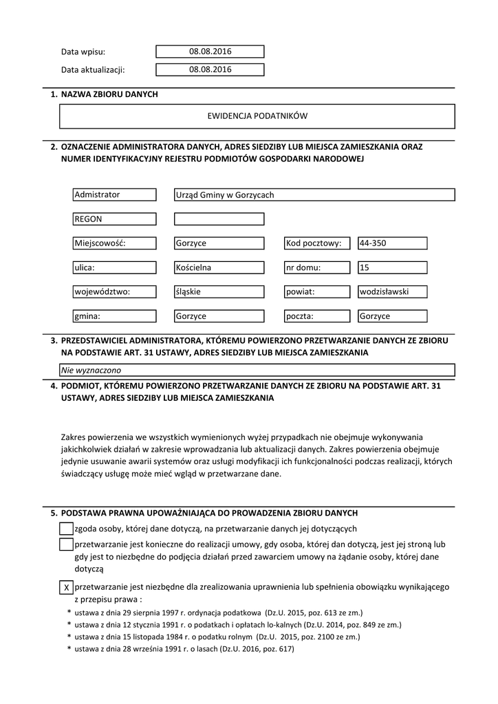 Data wpisu: 08.08.2016 Data aktualizacji: 08.08.2016 1. NAZWA ZBIORU DANYCH EWIDENCJA PODATNIKÓW 2. OZNACZENIE ADMINISTRATORA DANYCH, ADRES SIEDZIBY LUB MIEJSCA ZAMIESZKANIA ORAZ NUMER IDENTYFIKACYJNY REJESTRU PODMIOTÓW GOSPODARKI NARODOWEJ Admistrator Urząd Gminy w Gorzycach REGON Miejscowość: Gorzyce Kod pocztowy: 44-350 ulica: Kościelna nr domu: 15 województwo: śląskie powiat: wodzisławski gmina: Gorzyce poczta: Gorzyce 3. PRZEDSTAWICIEL ADMINISTRATORA, KTÓREMU POWIERZONO PRZETWARZANIE DANYCH ZE ZBIORU NA PODSTAWIE ART. 31 USTAWY, ADRES SIEDZIBY LUB MIEJSCA ZAMIESZKANIA Nie wyznaczono 4. PODMIOT, KTÓREMU POWIERZONO PRZETWARZANIE DANYCH ZE ZBIORU NA PODSTAWIE ART. 31 USTAWY, ADRES SIEDZIBY LUB MIEJSCA ZAMIESZKANIA Zakres powierzenia we wszystkich wymienionych wyżej przypadkach nie obejmuje wykonywania jakichkolwiek działań w zakresie wprowadzania lub aktualizacji danych. Zakres powierzenia obejmuje jedynie usuwanie awarii systemów oraz usługi modyfikacji ich funkcjonalności podczas realizacji, których świadczący usługę może mieć wgląd w przetwarzane dane. 5. PODSTAWA PRAWNA UPOWAŻNIAJĄCA DO PROWADZENIA ZBIORU DANYCH zgoda osoby, której dane dotyczą, na przetwarzanie danych jej dotyczących przetwarzanie jest konieczne do realizacji umowy, gdy osoba, której dan dotyczą, jest jej stroną lub gdy jest to niezbędne do podjęcia działań przed zawarciem umowy na żądanie osoby, której dane dotyczą X przetwarzanie jest niezbędne dla zrealizowania uprawnienia lub spełnienia obowiązku wynikającego z przepisu prawa : * * * * ustawa z dnia 29 sierpnia 1997 r. ordynacja podatkowa (Dz.U. 2015, poz. 613 ze zm.) ustawa z dnia 12 stycznia 1991 r. o podatkach i opłatach lo-kalnych (Dz.U. 2014, poz. 849 ze zm.) ustawa z dnia 15 listopada 1984 r. o podatku rolnym (Dz.U. 2015, poz. 2100 ze zm.) ustawa z dnia 28 września 1991 r. o lasach (Dz.U. 2016, poz. 617) 6. CEL PRZETWARZANIA DANYCH W ZBIORZE Dopełnienie obowiązków okreśonych w przepisach prawa 7. OPIS KATEGORII OSÓB, KTÓRYCH DANE SĄ PRZETWARZANE W ZBIORZE 8. ZAKRES DANYCH PRZETWARZANYCH W ZBIORZE X Nazwisko i imię NIP X imiona rodziców miejsce pracy X data urodzenia miejsce urodzenia X adres zamieszkania X Nr PESEL zawód wykształcenie X nr telefonu X adres e-mail Seria i nr dowodu tożsamości Inne przetwarzane dane: Nazwizko panieńskie, Numer konta bankowego 9. SPOSÓB ZBIERANIA DANYCH ZE ZBIORU 10. SPOSÓB UDOSTĘPNIANIA DANYCH ZE ZBIORU 11. ODBIORCY DANYCH LUB KATEGORIE ODBIORCÓW, KTÓRYM DANE MOGĄ BYĆ PRZEKAZYWANE Podmioty upoważnione na podstawie przepisów prawa 12. INFORMACJA DOTYCZĄCA EWENTUALNEGO PRZEKAZYWANIA DANYCH DO PAŃSTWA TRZECIEGO (NAZWA PAŃSTWA) Dane nie są przekazywane do państw trzecich.