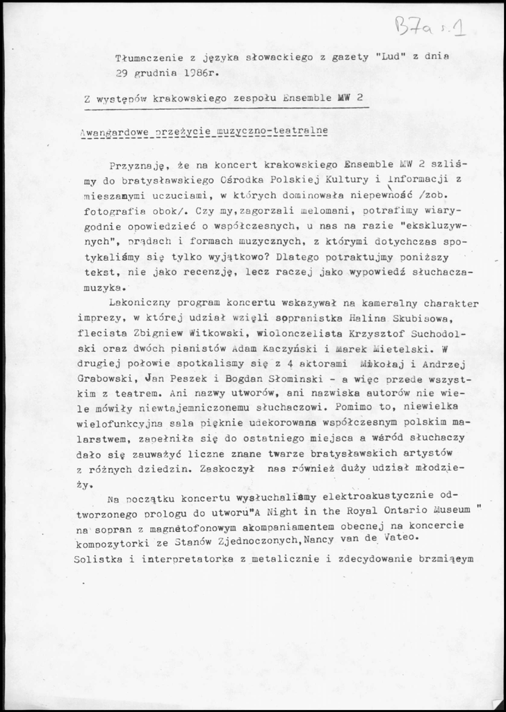 Tłumaczenie z języka słowackiego z gazety "Lud" z dnia 29 grudnia 1986r. Z wystęnów krakowskiego zespołu Ensemble MW 2 Awangardowe nrze^ciejcuz^czno^teatralne Przyznaję, że na koncert krakowskiego Ensemble isdW 2 szliśmy do bratysławskiego Ośrodka Polskiej Kultury i Informacji z mieszanymi uczuciami, w których dominowała niepewność /zob. fotografia obok/. Czy my,zagorzali melomani, potrafimy wiarygodnie opowiedzieć o współczesnych, u nas na razie "ekskluzywnych", or^dach i formach muzycznych, z którymi dotychczas spotykaliśmy się tylko wyjątkowo? Dlatego potraktujmy poniższy tekst, nie jako recenzję, lecz raczej jako wypowiedź słuchaczamuzyka. Lakoniczny program koncertu wskazywał na kameralny charakter imprezy, w której udział wzięli sopranistka Halina Skubisowa, flecista Zbigniew Witkowski, wiolonczelista Krzysztof Suchodolski oraz dwóch pianistów Adam Kaczyński i Marek Mietelski. W drugiej połowie spotkalismy się z 4 aktorami Mikołaj i Andrzej Grabowski, Jan Peszek i Bogdan Słominski - a więc Drzede wszystkim z teatrem. Ani nazwy utworów, ani nazwiska autorów nie wiele mówiły niewtajemniczonemu słuchaczowi. Pomimo to, niewielka wielofunkcyjna sala pięknie udekorowana współczesnym polskim malarstwem, zapełniła się do ostatniego miejsca a wśród słuchaczy dało się zauważyć liczne znane twarze bratysławskich artystów z różnych dziedzin. Zaskoczył nas również duży udział młodzieży. Na noczątku koncertu wysłuchaliśmy elektroakustycznie odtworzonego orologu do utworu'*A Night in the Royal Ontario iiuseum " na sopran z magnetofonowym akomoaniamentem obecnej na koncercie komoozytorki ze Stanów Zjednoczonych,Nancy van de /ateo. Solistka i interpretatorka z metalicznie i zdecydowanie brzmiąeym sopranem słowem i gestem aktorskim sugestywnie opisała własne nrzeżycia i wizje artystyczne z wizyty w muzem polinezyjskiej kultury materialnej. Mimo woli nasunęło się nam skojarzenie z "Obrazami z wystawy" Mussorgskiego, tym razem co prawda wyrażonymi we wsDÓłczesnym języku muzycznym. Interoretacja utworu wywołała duże wrażenie emocjonalne u publiczności . Ani kolejne Diotico l.na flet i forteoian - dzieło czołowego wsoółczesnego komoozytora meksykańskiego Manuela Enruqueza, nie orzekroczyło co do treści koncertu jego zewnętrznych ram, chociaż konwencjonalne możliwości odtwarzania obu instrumentów zostały znacznie rozszerzone i urozmaicone /wirtuoz owsk ic6rząkanie na strunach wewnątrz soreoarowanego forteoianu, wykorzystanie obudowy instrumentu jako perkusji; orz.y flecie wykorzystanie mechanizmu klapkowego do watwarzania dźwięków nodobnych do stukania czcionek maszyny do pisania tzw. Dizzicato lub ustne wydawanie głębokich dźwięków i szumów orzypominajacych pracę silnika itp./. Brawurowe wykonanie nrzez obu solistów przekonywująco ożywiło cyfrowy i graficzny skomolikowany zanis nutowy autora, urozmaicony w części środkowej odtworzonym nagraniem muzycznym. Utwór II /1980/ na sopran, wiolonczelę i fortepian, jednego z czołowych protagonistów polskiej "nowej muzyki", teoretyka i profesora kompozycji na krakowskiej Akademii.Muzycznej dr Bogusława Schaeffera /1929/ stworzył pomost pomiędzy muzyczną a teatralną częścią programu. Oprowadził nas na grunt wsoółczesnego syntetyzującego kameralnego teatru muzycznego, w którym kompozytor i reżyser wprowadza słuchacza od nastroju ooważnego do uśmiechu. Przy interpretacji utworu wrażenia wizualne są równorzędne z wrażeniami akustycznymi. Wszystkie środki- włącznie z kostiumami, grą aktorską i gagami służą podkreślenia celu - w tym nrzypadku do wyrażenia negatywnego stosunku do własnej pracy orzez odtwarzających aktorów /utwór Rozstrojony/, Ta forma wymaga, oprócz różnych technicznych niuansów, opanowania instrumentu muzycznego lub głosu, jak również komediowych zdolności aktorskich . A/ahlarz środków wyrazu jest niemal nieograniczony. Zależy więc od reżysera i wykonawców, żeby nie orzekroczyli dopuszczalnej granicy. Roześmiane twarze widzów stanowiły dowód na to, że interpretacja utworu /znudzony wiolonczelista, spbcony pianista, senna śpiewaczka/ udała się. Podczas gdy pierwsza połowa koncertu była prawie przysmakiem muzycznym, druga połowa stała się atrakcyjnym koncertem aktorskim - muzyką słów. Schaeffer, jako autor orawie godzinowego "Kwartetu na czterech aktorów"/1960/ naoisał o nim:...Muzyków kwartetu smyczkowego mogą zastąpić aktorzy. Każdemu z aktorów odebrałem instrument muzyczny oozostawiając tylko stojak i partyturę. Idea utworu oolega na inwersji, która w istocie inwersją nie jest. Czy muzycy w kwartecie są jeszcze ludźmi? Dlaczego przez całe lata spotykają się i starają się za wszelką cenę stworzyć jednolity, jednorodny zespół! Czy to jest w porządku? Czy to jest potrzebne? Kto tego potrzebuje - czy oni sami? A takim przyoadku nie istnieje między nimi harmonia. Każdy z czterech muzyków stanowi inną osobowość, każdy ma inny stosunek do życia, inne zainteresowania, inne hobby. Moi muzycy chcieliby być wolni - ale to im się nie udaje. .» końcu zgadzają się tylko z jednym: najważniejsza jest intencja." A z konsekwentnie bezkompromisową intencją /zamiarem/ orzystępował do realizacji myśli Schaeffera również reżyser mikołaj Grabowski /równocześnie jeden z aktorów/ wraz ze swoimi kolegami-aktorami z aktorskiego kwartetu. Staliśmy się świadkami wirtuozowskiego orzedstawienia, które w soosób wyczerpujący i z wielkim temperamentem wykorzystało cały arsenał awangardowych możliwości komediowych i dla którego nadawały się wszystkie środki do wyrażenia treści. Od statycznej mimiki, przez wypracowane etiudy aktorskie i wymagające akcje ruchowe, aż do estradowo-klownowskich sztuczek cyrkowych symbolicznie orzedstawiających jedność czterech członków kwartetu smyczkowego. Chociaż wszystkie cechy charakteru c