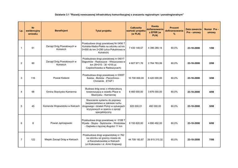 Działanie 3.1 "Rozwój nowoczesnej infrastruktury komunikacyjnej o znaczeniu regionalnym i ponadregionalnym" Kwota Całkowita Procent dofiansowania Data zawarcia wartość projektu dofinansowania z EFRR (w Pre - umowy (w PLN) % PLN) Nr ewidencyjny wniosku Beneficjent Tytuł projektu 61 Zarząd Dróg Powiatowych w Końskich Przebudowa drogi powiatowej Nr 0456 T Końskie-Niebo-Piekło na odcinku od km 0+000 do km 2+290 (ulica Południowa w Końskich) 7 430 148,57 4 396 289,14 60,0% 23-10-2008 1/08 2 60 Zarząd Dróg Powiatowych w Końskich Przebudowa drogi powiatowej nr 0401T Stąporków - Radoszyce - Włoszczowa w km 29+015 - 30 +018 (ul. Częstochowska w Radoszycach) 4 607 971,76 2 764 783,06 60,0% 23-10-2008 2/08 3 116 Powiat Kielecki Przebudowa drogi powiatowej nr 0355T Suków - Borków - Pierzchnica Chmielnik , ETAP I 10 700 000,00 6 420 000,00 60,0% 23-10-2008 3/08 4 68 Gmina Skarżysko Kamienna Budowa dróg wraz z infratsrukturą towarzszyącą w osiedlu Place w Skarżysku - Kamiennej 6 460 000,00 3 876 000,00 60,0% 23-10-2008 4/08 820 000,01 492 000,00 60,0% 23-10-2008 5/08 Lp. 1 Numer Pre umowy 5 45 Komenda Wojewódzka w Kielcach Stworzenie systemu do poprawy bezpieczeństwa w zakresie ruchu drogowego i działań Policji w sytuacjach kryzysowych w oparciu o sprzęt specjalistyczny 6 8 Powiat Jędrzejowski Przebudowa drogi powiatowej nr 0188 T Wywła - Słupia - Sędziszów - Wodzisław - Gajówka o łącznej długości 11 km 8 150 820,00 4 890 492,00 60,0% 23-10-2008 6/08 Miejski Zarząd Dróg w Kielcach Przebudowa drogi wojewódzkiej nr 762 na odcinku od granicy miasta do ul.Kaczówkowskiej w Kielcach (ul.Krakowska i ul. Armii Krajowej) 44 709 183,87 26 815 310,32 60,0% 23-10-2008 7/08 7 122 8 9 10 11 69 97 121 14 Gmina Skarżysko Kamienna Budowa dróg wraz z infrastrukturą towarzyszącą w osiedlu Dolna Kamienna w Skarżysku Kamiennej - Etap I 6 800 000,00 4 080 000,00 60,0% 23-10-2008 8/08 Powiat Ostrowiecki Rozbudowa ulicy Waryńskiego na długości ok. 0,755 km wraz z ze skrzyżowaniem z ulicą Sienkiewicza w Ostrowcu Świętokrzyskim - I etap 16 481 260,00 9 817 020,00 60,0% 23-10-2008 9/08 Miejski Zarząd Dróg w Kielcach Rozbudowa ulic usprawniających powiązania komunikacyjne miasta Kielce - rozbudowa ul. 1 Maja wraz z budową mostu Herbskiego ( po uprzedniej rozbiórce) oraz rozbudową skrzyżowań i przyległych ulic 10 623 744,72 6 369 446,84 60,0% 23-10-2008 10/08 Powiat Starachowicki Rozbudowa ciągu drogi powiatowej nr 0617T (15921) Starachowice-Lubienia odcinek od drogi nr 42 do ulicy Krańcowej 10 894 033,51 6 536 420,11 60,0% 23-10-2008 11/08 4 019 964,00 2 411 978,40 60,0% 23-10-2008 12/08 12 65 Powiat Pińczowski Poprawa warunków rozwoju gospodarczego powiatu pińczowskiego poprzez przebudowę drogi powiatowej nr 0021T Chmielnik - Pińczów na odc. Szarbków - Włochy dł. 4,3 km etap I 13 67 Gmina Starachowice Przebudowa skrzyżowania ul. Radomska /1 Maja/Krzosa w Starchowicach 4 800 000,00 2 880 000,00 60,0% 23-10-2008 13/08 Gmina Starachowice Poprawa komunikacji terenów przemysłowych z drogą wojewódzką przebudowa ul. Bema i 1 Maja w Starachowicach 15 000 000,00 9 000 000,00 60,0% 23-10-2008 14/08 151 497 126,44 90 749 739,87 14 66 Suma: