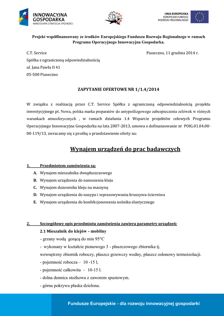 Projekt współfinansowany ze środków Europejskiego Funduszu Rozwoju Regionalnego w ramach Programu Operacyjnego Innowacyjna Gospodarka. C.T. Service Piaseczno, 11 grudnia 2014 r. Spółka z ograniczoną odpowiedzialnością ul. Jana Pawła II 41 05-500 Piaseczno ZAPYTANIE OFERTOWE NR 1/1.4/2014 W związku z realizacją przez C.T. Service Spółka z ograniczoną odpowiedzialnością projektu inwestycyjnego pt. Nowa, polska marka preparatów do antypoślizgowego zabezpieczenia zelówek w różnych warunkach atmosferycznych , w ramach działania 1.4 Wsparcie projektów celowych Programu Operacyjnego Innowacyjna Gospodarka na lata 2007-2013, umowa o dofinansowanie nr POIG.01.04.0000-119/13, zwracamy się z prośbą o przedstawienie oferty na: Wynajem urządzeń do prac badawczych 1. Przedmiotem zamówienia są: A. Wynajem mieszalnika dwupłaszczowego B. Wynajem urządzenia do nanoszenia kleju C. Wynajem dozownika kleju na maszynę D. Wynajem urządzenia do nasypu i wprasowywania kruszywa-ścierniwa E. Wynajem urządzenia do konfekcjonowania nośnika elastycznego 2. Szczegółowy opis przedmiotu zamówienia zawiera parametry urządzeń: 2.1 Mieszalnik do klejów - mobilny - grzany wodą gorącą do min 95°C - wykonany w kształcie pionowego 3 - płaszczowego zbiornika tj. wewnętrzny zbiornik roboczy, płaszcz grzewczy wodny, płaszcz osłonowy termoizolacji. - pojemność robocza – 10 -15 l, - pojemność całkowita – 10-15 l. - dolna dennica stożkowa z zaworem spustowym. - górna pokrywa płaska dzielona. Fundusze Europejskie - dla rozwoju innowacyjnej gospodarki Projekt współfinansowany ze środków Europejskiego Funduszu Rozwoju Regionalnego w ramach Programu Operacyjnego Innowacyjna Gospodarka. - zainstalowane mieszadło o stałych ok. 100 obr/min napędzane motoreduktorem. - płaszcz grzewczy wypełniony wodą, podgrzewany elektrycznie (grzałki). - założona temperatura podgrzewania wody do min. 95°C. - nastawy i regulacja temperatury wody - czujnik i regulator temperatury z cyfrowym wyświetlaczem. - pomiar temperatury kleju wewnątrz mieszalnika - czujnik z cyfrowym wyświetlaczem. - płaszcz osłonowy termoizolacji: Przestrzeń pomiędzy płaszczem grzewczym ( dno i pobocznica ) wypełniona izolacją termiczną wełną mineralną i przykryta płaszczem osłonowym. - wykonanie materiałowe mieszalnika: stal zwykła, zewnętrzne malowany. - szafka sterownicza tworzywowa umieszczona przy mieszalniku. - wyposażenie szafki: - elementy zabezpieczenia i sterownia mieszadłem, pompą, - regulator temperatury z wyświetlaczem cyfrowym, - Naczynie wyrównawcze dla kompensowania rozszerzalności wody.. - Całość na wspólnej ramie, przejezdna na kółkach tworzywowych - Rama jezdna ok. 650 mm. - Szczegóły konstrukcyjne do ew. uzgodnienia. 2.2 Urządzenie do nanoszenia kleju Urządzenie topiące wyposażone w panel sterujący: - Zakres temperatury pracy urządzenia: min 700 C, max nie mniej niż 2000 C - Zakres temperatury otoczenia: 0-400 C - Zakres lepkości min 800 CPS, max. co najmniej 30 000 CPS - Objętość zbiornika: nie mniej niż 3 litry - Wymiary zbiornika: nie więcej niż 150 x 150 mm - szybkość nanoszenia: nie mniej niż 3,5kg/h Fundusze Europejskie - dla rozwoju innowacyjnej gospodarki Projekt współfinansowany ze środków Europejskiego Funduszu Rozwoju Regionalnego w ramach Programu Operacyjnego Innowacyjna Gospodarka. 2.3 Dozownik kleju na maszynę - opis: przenośny dozownik klejów - pojemność zbiornika, na materiał suchy 100-150 g / płynny min. 150-200 g - czas nagrzewania: max 15min - szybkość dozowania: min 100gr/min - zakres temperatur: max. co najmniej 180o C - waga: 1-2 kg - zawiera różne dysze dozujące (średnica 1.0mm, 1,8mm, 2,5mm) 2.4 Urządzenie do nasypu i wprasowywania kruszywa-ścierniwa - stanowisko do nasypu i wprasowywania składające się z: - > stół do nasypu, nie dłuższy niż 220cm, nie krótszy niż 160cm - wysokość stołu: nie mniej niż 80cm i nie więcej niż 110cm - zawierający ruchome ramię przesuwne przez stół - stół musi zawierać a) sekcję nanoszenia kruszywa (ruchoma we wszystkich pozycjach, góra-dół, prawolewo, wraz z możliwością zamiany całej sekcji) b) sekcję wibracyjną c) sekcję – system grzania (ruchoma we wszystkich pozycjach, góra-dół, prawo-lewo, wraz z możliwością zamiany całej sekcji), możliwość grzania do 150O C d) sekcję wprasowywania (ruchoma w pozycjach góra-dół, prawo-lewo), powinna zawierać co najmniej dwa wałki (jeden wykonany z metalu, drugi wykonany z PCV, silikony/poliuretanu/bądź innego tworzywa sztucznego), najlepiej trzy wałki (poza dwoma poprzednimi trzeci wałek drewniany/bądź szklany) - stanowisko musi zawierać również: - > ruchomą taśmę (sztywną) – najlepiej metalową, umożliwiającą przesuw materiału roboczego o wymiarach max 30x40cm - stanowisko sterowane elektrycznie z falownikiem zasilane prądem trójfazowym - pod stołem zamontowana rynienka umożliwiająca zbiór nadmiaru posypki Fundusze Europejskie - dla rozwoju innowacyjnej gospodarki Projekt współfinansowany ze środków Europejskiego Funduszu Rozwoju Regionalnego w ramach Programu Operacyjnego Innowacyjna Gospodarka. 2.5 Urządzenie do konfekcjonowania nośnika elastycznego - składające się z: - > automatycznej szafy sterowniczej, która pozwala uruchamiać i zatrzymywać linię technologiczną, wyposażona w magistralę CAN, zawierająca wyświetlacz, przyciski sterujące oraz sterownik PLC - > prasy hydraulicznej z napędem servo, Parametry: - czas cyklu – min. 35/min - siła do 500 kN - wysokość ładowania 800- 950 mm - przestrzeń robocza: 400-500 mm - całkowita powierzchnia: nie więcej niż 750x450 mm - szerokość: do 1000 mm - wysokość – 2200-2400 mm - waga: nie więcej niż 2000kg - moc: 5kW - ciśnienie max 250 bar - urządzenie które pozwala w pełni kontrolować: prędkość, ciśnienie, pozycję, obrót. - > narzędzi do cięcia/wytłaczania 
