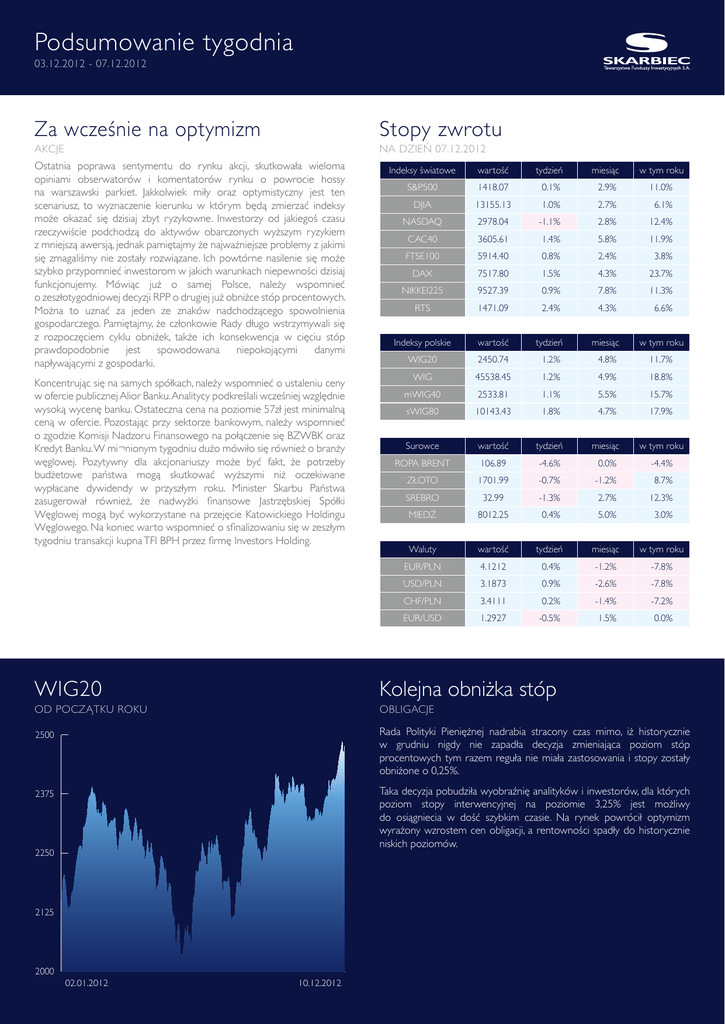 Podsumowanie tygodnia 03.12.2012 - 07.12.2012 Za wcześnie na optymizm Stopy zwrotu AKCJE NA DZIEŃ 07.12.2012 Ostatnia poprawa sentymentu do rynku akcji, skutkowała wieloma opiniami obserwatorów i komentatorów rynku o powrocie hossy na warszawski parkiet. Jakkolwiek miły oraz optymistyczny jest ten scenariusz, to wyznaczenie kierunku w którym będą zmierzać indeksy może okazać się dzisiaj zbyt ryzykowne. Inwestorzy od jakiegoś czasu rzeczywiście podchodzą do aktywów obarczonych wyższym ryzykiem z mniejszą awersją, jednak pamiętajmy że najważniejsze problemy z jakimi się zmagaliśmy nie zostały rozwiązane. Ich powtórne nasilenie się może szybko przypomnieć inwestorom w jakich warunkach niepewności dzisiaj funkcjonujemy. Mówiąc już o samej Polsce, należy wspomnieć o zeszłotygodniowej decyzji RPP o drugiej już obniżce stóp procentowych. Można to uznać za jeden ze znaków nadchodzącego spowolnienia gospodarczego. Pamiętajmy, że członkowie Rady długo wstrzymywali się z rozpoczęciem cyklu obniżek, także ich konsekwencja w cięciu stóp prawdopodobnie jest spowodowana niepokojącymi danymi napływającymi z gospodarki. Koncentrując się na samych spółkach, należy wspomnieć o ustaleniu ceny w ofercie publicznej Alior Banku. Analitycy podkreślali wcześniej względnie wysoką wycenę banku. Ostateczna cena na poziomie 57zł jest minimalną ceną w ofercie. Pozostając przy sektorze bankowym, należy wspomnieć o zgodzie Komisji Nadzoru Finansowego na połączenie się BZWBK oraz Kredyt Banku. W mi¬nionym tygodniu dużo mówiło się również o branży węglowej. Pozytywny dla akcjonariuszy może być fakt, że potrzeby budżetowe państwa mogą skutkować wyższymi niż oczekiwane wypłacane dywidendy w przyszłym roku. Minister Skarbu Państwa zasugerował również, że nadwyżki finansowe Jastrzębskiej Spółki Węglowej mogą być wykorzystane na przejęcie Katowickiego Holdingu Węglowego. Na koniec warto wspomnieć o sfinalizowaniu się w zeszłym tygodniu transakcji kupna TFI BPH przez firmę Investors Holding. Indeksy światowe wartość tydzień miesiąc w tym roku S&P500 1418.07 0.1% 2.9% 11.0% DJIA 13155.13 1.0% 2.7% 6.1% NASDAQ 2978.04 -1.1% 2.8% 12.4% CAC40 3605.61 1.4% 5.8% 11.9% FTSE100 5914.40 0.8% 2.4% 3.8% DAX 7517.80 1.5% 4.3% 23.7% NIKKEI225 9527.39 0.9% 7.8% 11.3% RTS 1471.09 2.4% 4.3% 6.6% Indeksy polskie wartość tydzień miesiąc w tym roku WIG20 2450.74 1.2% 4.8% 11.7% WIG 45538.45 1.2% 4.9% 18.8% mWIG40 2533.81 1.1% 5.5% 15.7% sWIG80 10143.43 1.8% 4.7% 17.9% Surowce wartość tydzień miesiąc w tym roku ROPA BRENT 106.89 -4.6% 0.0% -4.4% ZŁOTO 1701.99 -0.7% -1.2% 8.7% SREBRO 32.99 -1.3% 2.7% 12.3% MIEDŹ 8012.25 0.4% 5.0% 3.0% Waluty wartość tydzień miesiąc w tym roku EUR/PLN 4.1212 0.4% -1.2% -7.8% USD/PLN 3.1873 0.9% -2.6% -7.8% CHF/PLN 3.4111 0.2% -1.4% -7.2% EUR/USD 1.2927 -0.5% 1.5% 0.0% WIG20 Kolejna obniżka stóp OD POCZĄTKU ROKU OBLIGACJE 2500 Rada Polityki Pieniężnej nadrabia stracony czas mimo, iż historycznie w grudniu nigdy nie zapadła decyzja zmieniająca poziom stóp procentowych tym razem reguła nie miała zastosowania i stopy zostały obniżone o 0,25%. 2375 Taka decyzja pobudziła wyobraźnię analityków i inwestorów, dla których poziom stopy interwencyjnej na poziomie 3,25% jest możliwy do osiągniecia w dość szybkim czasie. Na rynek powrócił optymizm wyrażony wzrostem cen obligacji, a rentowności spadły do historycznie niskich poziomów. 2250 2125 2000 02.01.2012 10.12.2012 Podsumowanie tygodnia 03.12.2012 - 07.12.2012 Negatywne tendencje Mikołajki SUROWCE OTOCZENIE MAKROEKONOMICZNE Pierwszy tydzień grudnia przyniósł spadki cen większości surowców, do czego przyczyniły się słabsze dane makroekonomiczne ze strefy euro oraz cięcia prognoz wzrostu gospodarczego na przyszły rok. Negatywne tendencje spotęgowało sine umocnienie dolara końcem tygodnia. W rezultacie indeks Reuters Jefferies CRB stracił 1,43% po zniżce cen 13 spośród 19 komponentów. Silne spadki zaliczyły ceny surowców energetycznych. Za baryłkę ropy WTI płacono w piątek poniżej 86 USD (-3,4%), a notowane w Nowym Jorku kontrakty na benzynę i olej opałowy zakończyły tydzień pięcioprocentową przeceną. Europejski benchmark – ropa Brent kosztowała w piątek blisko 107 USD (-3,8%). Ponownie lepiej zachowywały się metale bazowe. Miedź w trzymiesięcznych kontraktach podrożała do 8035 USD/t, cena aluminium pozostała na poziomie sprzed tygodnia (2095 USD/t) a pozostałe metale poza niklem (-2,4%) zanotowały umiarkowane spadki. Również nieznacznie pod kreską zakończyły tydzień kruszce. Za uncję złota płacono w piątek 1705 USD, srebro kosztowało ponad 33 USD. Spadły również ceny większości surowców miękkich: kakao (-3,5%), kukurydzy (-2%), cukru (-0,7%), pszenicy (-0,3%) i bawełny (-0,2%). Ponad dwuprocentowe wzrosty zanotowały kontrakty na soję oraz kawę. Według wierzeń Holendrów Święty Mikołaj mieszka w Hiszpanii. Być może dlatego kraj ten jako pierwszy otrzymał prezent – dofinansowanie banków. Mikołaj pamiętał także o polskich kredytobiorcach. Natomiast kilka krajów dostało na mikołajki rózgi… od agencji ratingowych. Wzrosty i spadki tygodnia Spółka wartość RUBICON 0.39 tydzień w tym roku 34.5% -27.8% GANT 4.06 33.1% -37.1% DECORA 9.30 22.7% 10.7% AWBUD 0.70 20.7% -59.8% NOVA KREDITNA 4.65 -15.3% -69.0% PLAZA CENTERS 1.45 -15.2% -25.6% AGROTON 8.83 -15.0% -52.5% ATLANTIS 0.12 -14.3% -73.3% Nota prawna Niniejszy dokument jest jedynie materiałem informacyjnym do użytku odbiorcy. Nie powinien być rozumiany jako materiał o charakterze doradczym lub jako podstawa do podejmowania decyzji inwestycyjnych. Nie powinien też być rozumiany jako rekomendacja inwestycyjna. Wszystkie opinie i prognozy przedstawione w tym opracowaniu są jedynie wyrazem opinii autorów w dniu publikacji i mogą ulec zmianie bez zapowiedzi. Skarbiec TFI S
