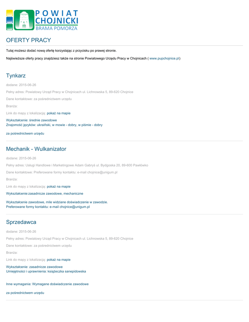 OFERTY PRACY Tutaj możesz dodać nową ofertę korzystając z przycisku po prawej stronie. Najświeższe oferty pracy znajdziesz także na stronie Powiatowego Urzędu Pracy w Chojnicach ( www.pupchojnice.pl) Tynkarz dodane: 2015-06-26 Pełny adres: Powiatowy Urząd Pracy w Chojnicach ul. Lichnowska 5, 89-620 Chojnice Dane kontaktowe: za pośrednictwem urzędu Branża: Link do mapy z lokalizacją: pokaż na mapie Wykształcenie: średnie zawodowe Znajomość języków: ukraiñski, w mowie - dobry, w piśmie - dobry za pośrednictwem urzędu Mechanik - Wulkanizator dodane: 2015-06-26 Pełny adres: Usługi Handlowe i Marketingowe Adam Gabryś ul. Bydgoska 20, 89-600 Pawłówko Dane kontaktowe: Preferowane formy kontaktu: e-mail [email protected] Branża: Link do mapy z lokalizacją: pokaż na mapie Wykształcenie:zasadnicze zawodowe, mechaniczne Wykształcenie zawodowe, mile widziane doświadczenie w zawodzie. Preferowane formy kontaktu: e-mail [email protected] Sprzedawca dodane: 2015-06-26 Pełny adres: Powiatowy Urząd Pracy w Chojnicach ul. Lichnowska 5, 89-620 Chojnice Dane kontaktowe: za pośrednictwem urzędu Branża: Link do mapy z lokalizacją: pokaż na mapie Wykształcenie: zasadnicze zawodowe Umiejętności i uprawnienia: książeczka sanepidowska Inne wymagania: Wymagane doświadczenie zawodowe za pośrednictwem urzędu Mechanik Pojazdów samochodowych dodane: 2015-06-26 Pełny adres: AUTO-MAROL Marek Singer Okrzei 12, 89-600 Chojnice Dane kontaktowe: Preferowane formy kontaktu: telefon 604 552 920 Branża: Link do mapy z lokalizacją: pokaż na mapie Zakres obowiązków: zgodnie ze stanowiskiem Preferowane formy kontaktu: telefon 604 552 920 Kierowca C+E dodane: 2015-06-26 Pełny adres: Przedsiębiorstwo Produkcyjno Usługowo Handlowe Jan Piesik 89-652 Łąg-Kolonia 52 Dane kontaktowe: Preferowane formy kontaktu: telefon 606 760 573 Branża: Link do mapy z lokalizacją: pokaż na mapie Wykształcenie: zasadnicze zawodowe Umiejętności i uprawnienia: kurs na przewóz rzeczy, prawo jazdy kat. C+E Miejsce wykonywania pracy: kraj i Europa, mile widziane doświadczenie zawodowe Preferowane formy kontaktu: telefon 606 760 573 Pomocniczy robotnik budowlany dodane: 2015-06-25 Pełny adres: MOLEWSKI SPÓŁKA Z OGRANICZONĄ ODPOWIEDZIALNOŚCIĄ Płocka 164, 87-800 Włocławek Dane kontaktowe: tel. 691048801 Branża: Link do mapy z lokalizacją: pokaż na mapie Wykształcenie: brak lub niepełne podstawowe tel. 691048801 Cieśla - zbrojarz dodane: 2015-06-25 Pełny adres: MOLEWSKI SPÓŁKA Z OGRANICZONĄ ODPOWIEDZIALNOŚCIĄ Płocka 164, 87-800 Włocławek Dane kontaktowe: Preferowane formy kontaktu: osobiście, telefon: 691048801 Branża: Link do mapy z lokalizacją: pokaż na mapie Wykształcenie: podstawowe Preferowane formy kontaktu: osobiście, telefon: 691048801 Asystent biura sprzedaży dodane: 2015-06-25 Pełny adres: Firma Handlowo Usługowa ,,NATUR- BIOS" Adam Ostrycharz ul. Książąt Pomorskich 42/7, 89-604 Chojnice Dane kontaktowe: Preferowane formy kontaktu: telefon 531 22 44 22 Branża: Link do mapy z lokalizacją: pokaż na mapie Wykształcenie: średnie zawodowe Umiejętności i uprawnienia: prawo jazdy kat. B Wykształcenie średnie, prawo jazdy kat. B, obsługa komputera, dyspozycyjność, mile widziana znajomośc j. angielskiego. Preferowane formy kontaktu: telefon 531 22 44 22 Asystent Projektanta dodane: 2015-06-25 Pełny adres: "ARCHISTYL" Pracownia Projektowa Kornelia Żywicka ul. Ceynowy 13B, 89-600 Chojnice Dane kontaktowe: Preferowane formy kontaktu: telefon 608-577-688 Branża: Link do mapy z lokalizacją: pokaż na mapie Znajomość języków: angielski, w mowie - podstawowy, w piśmie - podstawowy Wykształcenie: wyższe (w tym licencjat), budowlane, wyższe (w tym licencjat), inne Umiejętności i uprawnienia: kurs: projektowanie w AutoCAD 2D i 3D Umiejętność obsługi programów do projektowania i kosztorysowania m.in. ArchiCAD, CAD-DECOR Preferowane formy kontaktu: telefon 608-577-688 Rejestratorka medyczna dodane: 2015-06-25 Pełny adres: Powiatowy Urząd Pracy w Chojnicach ul. Lichnowska 5, 89-620 Chojnice Dane kontaktowe: za pośrednictwem urzędu Branża: Link do mapy z lokalizacją: pokaż na mapie Wykształcenie: średnie zawodowe za pośrednictwem urzędu Magazynier dodane: 2015-06-25 Pełny adres: Powiatowy Urząd Pracy w Chojnicach ul. Lichnowska 5, 89-620 Chojnice Dane kontaktowe: za pośrednictwem urzędu Branża: Link do mapy z lokalizacją: pokaż na mapie Wykształcenie: zasadnicze zawodowe za pośrednictwem urzędu Pakowacz ręczny dodane: 2015-06-25 Pełny adres: Powiatowy Urząd Pracy w Chojnicach ul. Lichnowska 5, 89-620 Chojnice Dane kontaktowe: za pośrednictwem urzędu Branża: Link do mapy z lokalizacją: pokaż na mapie Wykształcenie: zasadnicze zawodowe za pośrednictwem urzędu Malarz Budowlany dodane: 2015-06-25 Pełny adres: Powiatowy Urząd Pracy w Chojnicach ul. Lichnowska 5, 89-620 Chojnice Dane kontaktowe: za pośrednictwem urzędu Branża: Link do mapy z lokalizacją: pokaż na mapie Wykształcenie: brak lub niepełne podstawowe doświadczenie w zawodzie malarz budowlany za pośrednictwem urzędu Polerowacz łodzi dodane: 2015-06-25 Pełny adres: POLYESTER- YACHT 89-600 Nieżychowice 100a Dane kontaktowe: Preferowane formy kontaktu: telefon: 509702240 e-mail: [email protected] Branża: Link do mapy z lokalizacją: pokaż na mapie Wykształcenie: podstawowe Inne wymagania: Polerowanie, robienie zaprawek Preferowane formy kontaktu: telefon: 509702240 e-mail: [email protected] Tapicer dodane: 2015-06-25 Pełny adres: Polipol Meble Polska sp. z o.o sp.komandytowa ul. Zakładowa 1, 89-620 Chojnice, Dane kontaktowe: Preferowane formy kontaktu: osobiście, telefon: 523965314 Branża: Link do mapy z lokalizacją: pokaż na mapie Umiejętności i uprawnienia: doświadczenie mile widziane Wykształcenie: brak lub niepełne podstawowe Preferowane formy kontaktu: osobiście, telefon: 523965314