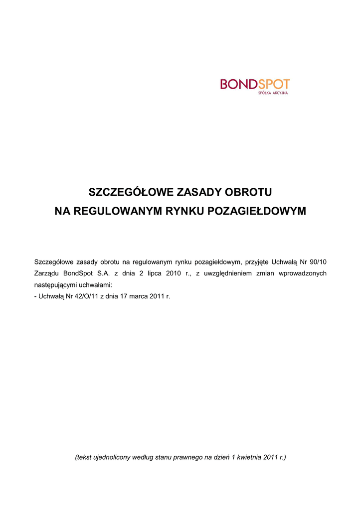 SZCZEGÓŁOWE ZASADY OBROTU NA REGULOWANYM RYNKU POZAGIEŁDOWYM Szczegółowe zasady obrotu na regulowanym rynku pozagiełdowym, przyjęte Uchwałą Nr 90/10 Zarządu BondSpot S.A. z dnia 2 lipca 2010 r., z uwzględnieniem zmian wprowadzonych następującymi uchwałami: - Uchwałą Nr 42/O/11 z dnia 17 marca 2011 r. (tekst ujednolicony według stanu prawnego na dzień 1 kwietnia 2011 r.) Spis treści Rozdział 1. Postanowienia ogólne .................................................................................................. 4 Rozdział 2. Dopuszczenie instrumentów finansowych do obrotu na rynku ...................................... 4 Rozdział 3. Wprowadzenie instrumentów finansowych do obrotu na rynku ..................................... 6 Rozdział 4. Szczegółowe warunki obrotu papierami wartościowymi na rynku ................................. 7 Oddział 1. Instrumenty dłużne ......................................................................................................... 7 Oddział 2. Prawa poboru................................................................................................................. 8 Rozdział 4a. Obowiązki emitentów papierów wartościowych, które są przedmiotem obrotu na rynku ....................................................................................................................................................... 8 Rozdział 5. Szczegółowe warunki działania członków ................................................................... 10 Oddział 1. Dopuszczanie do działania na rynku ............................................................................ 10 Oddział 1a. Udokumentowanie możliwości prawidłowego rozliczania zawieranych na rynku transakcji ...................................................................................................................................... 12 Oddział 1b. Tryb i zasady zawiadamiania Spółki o częściowej lub całkowitej utracie możliwości rozliczania zawieranych przez członka transakcji na rynku ........................................................... 12 Oddział 2. Sposób weryfikacji kwalifikacji maklerów...................................................................... 13 Oddział 3. Szczegółowe zasady oraz zakres dostępu do systemu informatycznego rynku ........... 13 Oddział 4. Animator rynku ............................................................................................................. 15 Oddział 5. Kontrola członków ........................................................................................................ 16 Rozdział 6. Obrót .......................................................................................................................... 16 Oddział 1. Maksymalna rozpiętość cen w ofercie animatora rynku dla danego instrumentu finansowego.................................................................................................................................. 16 Oddział 2. Określenie przedziałów wartości i stopnia dokładności przy określaniu cen instrumentów finansowych ............................................................................................................ 17 Oddział 3. Szczegółowy tryb i sposób realizacji ofert oraz szczegółowy zakres informacji, które powinna zawierać oferta. .............................................................................................................. 17 Oddział 4. Symbole stosowane przez Spółkę................................................................................ 18 Oddział 5. Szczegółowy sposób zawierania transakcji z zastosowaniem terminala ...................... 19 Oddział 6. Transakcje pakietowe .................................................................................................. 20 Oddział 7. Transakcje negocjowane.............................................................................................. 21 Oddział 8. (uchylony) .................................................................................................................... 23 Oddział 9. Publiczne wezwanie ..................................................................................................... 23 Oddział 10. Unieważnianie transakcji w przypadku wystąpienia awarii na rynku ........................... 23 Oddział 11. Procedura anulowania transakcji na wniosek członka ................................................ 23 Rozdział 7. Opłaty ......................................................................................................................... 24 Załącznik D do Szczegółowych zasad obrotu na rynku - Zasady i tryb przeprowadzania kontroli członków ....................................................................................................................................... 29 Załącznik E do Szczegółowych zasad obrotu na rynku - Warunki techniczne dostępu do rynku ... 32 I. Oprogramowanie terminala ........................................................................................................ 32 II. Wymagania w zakresie sprzętu i oprogramowania .................................................................... 32 III. Rodzaje połączeń z rynkiem .................................................................................................... 33 IV. Warunki organizacyjne i techniczne użytkowania terminala ..................................................... 33 tekst ujednolicony według stanu prawnego na dzień 1 kwietnia 2011 r. 2/36 1. Postanowienia ogólne ........................................................................................................ 33 2. Właściwy nadzór techniczny ............................................................................................... 33 3. Logiczna kontrola dostępu do systemu informatycznego rynku .......................................... 34 4. Ciągłość funkcjonowania term