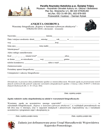 Parafia Rzymsko-Katolicka p.w. Świętej Trójcy Muzeum - Romański Ośrodek Kultury im. Ottona i Bolesława Plac Św. Wojciecha 1/1, 88-320 STRZELNO tel./fax. 052-31-89-281, 602-878-005 Przewodnik i kustosz – Damian Rybak ANKIETA OSOBOWA Warsztaty fotograficzne „Kujawy w lustrzano-cyfrowym obiektywie” STRZELNO 2010 r. (kwiecień – wrzesień) Nazwisko____________________________ imiona____________________ ________________________ Data i miejsce urodzenia: dzień______ miesiąc________ rok_______ w ____________________________ woj. _________________________________________kraj ______________________________________ Imię ojca______________________ imię matki________________________ Szkoła/praca* ___________________________________________________________________________ Adres stałego zameldowania: Kod __ __- __ __ __ miasto/wieś* __________________________ulica_____________________________ nr domu _____ nr mieszkania ______ woj. __________________ gmina ____________________________ telefon kontaktowy ______________________ adres e-mail _____________________________ Zainteresowania: _________________________________________________________________________ Posiadany aparat fotograficzny: _____________________________________________________________ Umiejętności i sukcesy fotograficzne: ________________________________________________________ _______________________________________________________________________________________ Oświadczam, że powyższe dane podałem(am) zgodnie ze stanem faktycznym. Wyrażam zgodę na przetwarzanie moich danych osobowych dla potrzeb wyłącznie warsztatów fotograficznych zgodnie z Ustawą z dnia 29.09.97 o Ochronie Danych Osobowych (Dz. U. Nr 133 po. 883). .................................................................................... Data, czytelny podpis Zgoda rodziców osoby niepełnoletniej na udział w warsztatach fotograficznych: Wyrażamy zgodę na uczestnictwo naszego syna/córki* ………………………..………………. w warsztatach fotograficznych „Kujawy w lustrzano-cyfrowym obiektywie”, w wykładach prowadzonych raz lub dwa razy w miesiącu, oraz w zajęciach studyjnych i plenerowych. Zapoznaliśmy się z warunkami uczestnictwa i programem zajęć i akceptujemy je. .................................................................................... Data, czytelny podpis mamy .................................................................................... Data, czytelny podpis taty Zadanie jest dofinansowane przez Urząd Marszałkowski Województwa Kujawsko-Pomorskiego. Warsztaty fotograficzne „Kujawy w lustrzano-cyfrowym obiektywie”. Warsztaty te adresowane są przede wszystkim do początkujących fotoamatorów, zarówno młodzieży jak i dorosłych. Za każdym razem w zajęciach (wykładach) może brać udział duża liczba uczestników (max. 50 osób). Wykłady będą się odbywały 1 lub 2 razy w miesiącu, a następnie sami uczestnicy będą to sprawdzali w praktyce. Zajęcia poprowadzą ludzie, którzy zajmują się fotografią zawodowo – Pan Remigiusz i Karol Koprowski. Uczestnicy wspólnie będą odkrywać, czym jest fotografowanie pod względem warsztatowym i artystycznym. Na wykładach będzie można dowiedzieć się informacji na następujące tematy: Tajniki sprzętu fotograficznego; Podstawowe i zaawansowane funkcje aparatów fotograficznych cyfrowych i tradycyjnych dla początkujących i zaawansowanych; Obiektywy, cechy, możliwości i zastosowanie; Filtry w fotografii cz-b. i barwnej w fotografii tradycyjnej i cyfrowej; Statywy, głowice i dodatkowe oprzyrządowanie; Makrofotografia; Odmienne użycie oświetlenia w fotografii; Związki fotografii ze sztuką itp. Warsztaty kończą się wystawą we wrześniu – wybór ok. 100 najciekawszych zdjęć. Warsztaty Fotograficzne „Kujawy w lustrzano-cyfrowym obiektywie” w parafii w Strzelnie dadzą Wam więcej niż niejeden roczny kurs fotografowania. Dzielenie się wiedzą i doświadczeniem z Wami sprawia nam przyjemność i dlatego nasze warsztaty nie mają charakteru „masówki”. Kameralna atmosfera zajęć buduje niepowtarzalny nastrój, który na długo pozostaje w pamięci uczestników i jest impulsem do pracy twórczej. My zbieramy siły by za rok znów spotkać się z wybrańcami losu i przeżyć wspaniałą przygodę z fotografią. Uczestnicy warsztatów fotograficznych „Kujawy w lustrzano-cyfrowym obiektywie: • Początkujący i średnio zaawansowani miłośnicy fotografii. Ci wszyscy, którzy chcą robić lepsze zdjęcia. • Ograniczenie wiekowe – od 13 lat wzwyż!!! Uczestnicy niepełnoletni muszą mieć zgodę rodziców podpisaną na odpowiednim formularzu. Uczestnicy powinni ze sobą zabrać: • aparat fotograficzny cyfrowy najlepiej lustrzankę cyfrową, ale może być też kompakt cyfrowy (wyjątkowo tradycyjny aparat fotograficzny na błonę światłoczułą) • warto mieć szczególnie statyw oraz dodatkowe obiektywy, lampę błyskową, wężyk spustowy lub zdalny wyzwalacz aparatu • karty pamięci, dodatkowe akumulatorki do aparatu fotograficznego i koniecznie ładowarkę, bardzo wskazany choć niekonieczny jest laptop lub dysk przenośny • swoje prace w postaci wyłącznie odbitek na papierze fotograficznym w ilości maksymalnie 20szt. Format odbitek dowolny. Mogą być zdjęcia pojedyncze, ale mile widziane (choć niekonieczne) są zestawy zdjęć w formie serii lub sekwencji zdjęciowych • zeszyt, długopis (wykłady) buty gumowe, kurtka lub płaszcz przeciwdeszczowy (zajęcia plener)