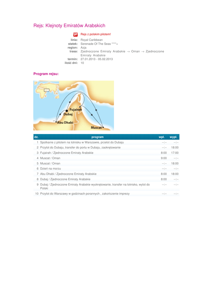 Rejs: Klejnoty Emiratów Arabskich Rejs z polskim pilotem! linia: statek: region: trasa: termin: ilość dni: Royal Caribbean Serenade Of The Seas ****+ Azja Zjednoczone Emiraty Arabskie → Oman → Zjednoczone Emiraty Arabskie 27.01.2013 - 05.02.2013 10 Program rejsu: dz. program wpł. wypł. 1 Spotkanie z pilotem na lotnisku w Warszawie, przelot do Dubaju --:-- --:-- 2 Przylot do Dubaju, transfer do portu w Dubaju, zaokrętowanie --:-- 18:00 3 Fujairah / Zjednoczone Emiraty Arabskie 8:00 17:00 4 Muscat / Oman 9:00 --:-- 5 Muscat / Oman --:-- 18:00 6 Dzień na morzu --:-- --:-- 7 Abu Dhabi / Zjednoczone Emiraty Arabskie 8:00 18:00 8 Dubaj / Zjednoczone Emiraty Arabskie 8:00 --:-- --:-- --:-- --:-- --:-- 9 Dubaj / Zjednoczone Emiraty Arabskie wyokrętowanie, transfer na lotnisko, wylot do Polski 10 Przylot do Warszawy w godzinach porannych , zakończenie imprezy 27 styczeń 2013 (niedziela) - 5 luty 2013 (wtorek) kategoria* cena katalogowa cena promocyjna kabina wewnętrzna 625 kabina zewnętrzna z oknem 730 kabina zewnętrzna z balkonem opłaty portowe bilet lotniczy Zobacz pozostałe terminy: 895 ÷ 925 210 ok. 2500 PLN/os. * Ceny za osobę w EUR w kabinie dwuosobowej 27.01.2013 | 03.03.2013 Informacje dodatkowe: cena za rejs obejmuje: rejs statkiem Serenade of the Seas ****+; zakwaterowanie w kabinie wybranej kategorii (7 noclegów); serwis bagażowy i kabinowy; wyżywienie – 3 główne posiłki, przekąski między posiłkami, bufet lub przekąski o północy; korzystanie z basenu i innych urządzeń sportowo-rekreacyjnych; udział we wszystkich imprezach organizowanych na statku, transfer lotnisko – port - lotnisko, opiekę polskiego pilota. cena nie obejmuje: opłat portowych i podatków, ubezpieczenia KL, NW, bagażu (210 EUR/os); kosztu przelotu ok. 2500PLN/os.; wycieczek fakultatywnych; korzystania z punktów usługowych (pralnia, fotograf, salon piękności i odnowy biologicznej, internet); napojów do obiadów i kolacji, drinków oraz napiwków obowiązkowych dla obsługi statku (ok. 60 EUR/rejs/osobę dorosłą) kosztu wiz do Emiratów ok. 140 EUR/os. uwagi: wymagana wiza do Zjednoczonych Emiratów Arabskich koszt ok. 140 EUR/os.