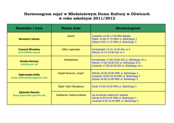 Harmonogram zajęć w Młodzieżowym Domu Kultury w Gliwicach w roku szkolnym 2011/2012 Nazwisko i imię Borowicz Janusz Czeczot Mirosław [email protected] Dradra Dariusz [email protected] Dąbrowska Zofia [email protected] Ejmocka Danuta [email protected] Nazwa koła Szachy Kółko regionalne Modelarstwo Harmonogram Czwartek 14:30-17:00 MDK Bojków Piątek 15:00-17:15 MDK ul. Barlickiego 3 Sobota 9:00-11:15 MDK ul. Barlickiego 3 Poniedziałek 14:15-15:45 Gim nr 4 Wtorek 14:15-15:00 Gim nr 4 Poniedziałek 17:00-20:00 ZSS ul. Kilińskiego 24 a Wtorek 17:00-20:00 ZSS ul. Kilińskiego 24 a Czwartek 17:00-20:00 ZSS ul. Kilińskiego 24 a Zespół taneczny „Iluzja” Wtorek 18:30-20:00 MDK ul. Barlickiego 3 Czwartek 18:00-19:30 MDK ul. Barlickiego 3 Sobota 10:00-12:00 MDK ul. Barlickiego 3 Śląski Teatr Obrzędowy Środa 14:30-16:00 MDK ul. Barlickiego 3 Spotkania z kulturą ludową wg wcześniej ustalonych zapisów wtorek 8:30-10:45 MDK ul. Barlickiego 3 czwartek 8:30-10:45 MDK ul. Barlickiego 3 Jarawka Ewa [email protected] Karpacka Ludmiła [email protected] Karpacka Ludmiła [email protected] Matematyka dla szkół podst. Poniedziałek 15:30 – 17:00 MDK ul. Barlickiego 3 Matematyka dla gimnazjów Poniedziałek 17:00 – 18:30 MDK ul. Barlickiego 3 Plastyka Poniedziałek 16:00-18:15 MDK ul. Barlickiego 3 Czwartek 15:00-17:15; 17:15-19:30 MDK ul. Barlickiego 3 Piątek 17:00-19:15 MDK ul. Barlickiego 3 Rzeźba Wtorek 16:00 - 17:30 Środa 15:30-17:00, 17:30 -19:00 MDK ul Barlickiego 3 Zespół tańca SALAKE Koćwin Joanna [email protected] Akademia Przedszkolaka Nowotnik Małgorzata [email protected] Kotylak Wojciech [email protected] Poniedziałek 16:00-19:30 MDK ul. Barlickiego 3 Wtorek 18:00-19:00 Centrum Edukacyjne im. Jana Pawła II Środa 16:30-19:30 MDK ul. Barlickiego 3 Piątek 17:00-18:00 Centrum Edukacyjne im. Jana Pawła II Sobota 09:00-14:00 MDK ul. Barlickiego 3 Warsztaty 5+ Poniedziałek 15:00-16:15 MDK ul. Barlickiego 3 Wtorek 15:00-16:15 MDK ul. Barlickiego 3 Warsztaty RAZEM Poniedziałek 16:30-18:00 MDK ul. Barlickiego 3 Wtorek 16:30-18:00 MDK ul. Barlickiego 3 Grafika komputerowa Środa 16:00-19:00 MDK ul. Barlickiego 3 Kotylak Wojciech [email protected] Teatr przedmiotu Tenis stołowy Kwodawski Marian [email protected] Michałuszek Sebastian [email protected] Fotografia Piątek 16:00-19:00 MDK Bojków Sobota 10:00-11:00 MDK Bojków Poniedziałek 16:00-17:30 MDK ul. Barlickiego 3 17:30-19:15 MDK ul. Barlickiego 3 (gr starsza) Środa 16:00-17:30 MDK ul. Barlickiego 3 17:30 – 20:00 MDK ul. Barlickiego 3 (gr starsza) Piątek 16:00-17:30 MDK ul. Barlickiego 3 17:30-20:00 MDK ul. Barlickiego 3 (gr starsza) Czwartek 16:00 – 18:45 MDK ul. Barlickiego 3 Piątek 16:00 – 19:30 MDK ul. Barlickiego 3 Plastyka Dzieci (10-13 lat) Poniedziałek 16:45-18:15 MDK ul. Barlickiego 3 (sala 57) Dzieci (6-9 lat) Wtorek 16:00-18:00 MDK ul. Barlickiego 3 Grupa młodzieżowa (gim. i lic.) Środa 16:00-19:45 MDK ul. Barlickiego 3 Niewolik Krzysztof [email protected] Keyboard Wtorek 15:30-17:00 MDK ul. Barlickiego 3 Wtorek 17:00-18:30 MDK ul. Barlickiego 3 Nowak-Trzewiczek Marzena [email protected] Język angielski Poniedziałek 15:00-16:30 MDK ul. Barlickiego 3 Środa 15:00-16:30 MDK ul. Barlickiego 3 Nowak-Trzewiczek Marzena [email protected] Gry planszowe Poniedziałek 16:30-18:00 MDK ul. Barlickiego 3 Michałuszek Sebastian [email protected] Gitara – klasyczna, elektryczna Pielichowski Henryk [email protected] Pielka Piotr [email protected] Zajęcia komputerowe Pieszka Wojciech [email protected] Gitara basowa Pieszka Wojciech [email protected] Zespół wokalno-instrumentalny Biblioteka Pilarek Zenona [email protected] Pilichowicz Grażyna [email protected] Zespół taneczny PANTERY Poniedziałek IA pocz. 14:00-15:30 MDK ul. Barlickiego 3 Poniedziałek IIA zaaw. 15:35-17:05 MDK ul. Barlickiego 3 Wtorek IB pocz. 14:00-15:30 MDK ul. Barlickiego 3 Czwartek I C pocz. 15:00-16:30 MDK Bojków Piątek ID pocz. 15:00-16:30 MDK ul. Barlickiego 3 Piątek II B zaaw. 16:30-18:05 MDK ul. Barlickiego 3 Piątek I El. pocz. 18:10-19:40 MDK ul. Barlickiego 3 Sobota II El zaaw. 08:30-10:00 MDK ul. Barlickiego 3 Sobota IIC zaaw. 10:05-11:35 MDK ul. Barlickiego 3 Piątek 16:00-19:00 MDK ul. Barlickiego 3 Poniedziałek 16:10-17:40 MDK ul. Barlickiego 3 Wtorek zespół Dreamm 16:10-17:40 MDK ul. Barlickiego 3 Wtorek zespół Badrequest 17:40-19:10 MDK ul. Barlickiego 3 Czwartek zespół Black Juice 16:10-17:40 MDK ul. Barlickiego 3 Poniedziałek Wtorek Środa Czwartek Piątek 15:30-20:30 MDK ul. Barlickiego s.24 11:30-12:30; 15:30-20:30 MDK ul. Barlickiego 3 s.24 09:30-11:30; 14:00-20:30 MDK ul. Barlickiego 3 s.24 8:45-10:45; 15:00-20:30 MDK ul. Barlickiego 3 s.24 11:30-14:30 MDK ul. Barlickiego 3 s.24 Wtorek 15:30-18:30 MDK ul. Barlickiego 3 Sobota 10:00-13:00 MDK ul. Barlickiego 3 Płonka Dominika [email protected] Zespół INDYGO Piątek 19:30-21:00, MDK, ul. Barlickiego 3 Zespół ONYKS Poniedziałek 19:20-20:50, MDK, ul. Barlickiego 3 Środa 19:20-20:50, MDK, ul. Barlickiego 3 Zespół Nastia Wtorek, 15:30-17:00, MDK, ul. Barlickiego 3 Soliści Poniedziałek: 18:35-19:05MDK ul. Barlickiego 3 Wtorek: 17:00-18:30 MDK ul. Barlickiego 3 Środa: 13:15-13:45 MDK ul. Barlickiego 3 15:30-16:00 MDK ul. Barlickiego 3 16:00-16:30 MDK ul. Barlickiego 3 16:30-17:00 MDK ul. Barlickiego 3 18:30-19:00 MDK ul. Barlickiego 3 Czwartek: 15:30-16:00 MDK ul. Barlickiego 3 16:00-16:30 MDK ul. Barlickiego 3 16:30-17:00 MDK ul. Barlickiego 3 Nowy zespół wokalny Poniedziałek: 17:05-18:35 MDK ul. Barlickiego 3 Środa: 17:00-18:30 MDK ul. Barlickiego 3 Podsiad Maria [email protected] Edukacja regionalna Wtorek 12:45 - 14:15 SP nr 12 sala 17 n Środa 12:30 – 14:00 SP nr 12 sala 17 n Połomski Tadeusz [email protected] Judo Płonka Dominika [email protected] Gr. początkująca (dzieci kl. I-III) Wtorek 17:45-18:45 Gim nr 4 Czwartek 18:00-19:00 Gim nr 4 Gr. początkująca (dzieci kl. IV-V) Wtorek 16:30-17:30 Gim nr 4 Czwartek 16