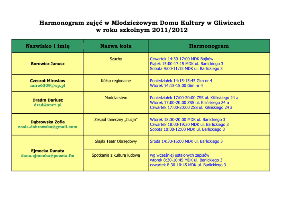harmonogram zajęć - Młodzieżowy Dom Kultury