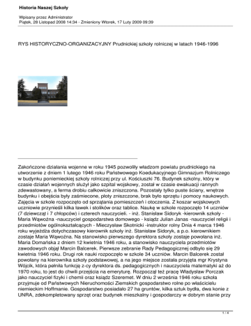 Historia Naszej Szkoły Wpisany przez Administrator Piątek, 28 Listopad 2008 14:34 - Zmieniony Wtorek, 17 Luty 2009 09:39 RYS HISTORYCZNO-ORGANIZACYJNY Prudnickiej szkoły rolniczej w latach 1946-1996 Zakończone działania wojenne w roku 1945 pozwoliły władzom powiatu prudnickiego na utworzenie z dniem 1 lutego 1946 roku Państwowego Koedukacyjnego Gimnazjum Rolniczego w budynku poniemieckiej szkoły rolniczej przy ul. Kościuszki 76. Budynek szkolny, który w czasie działań wojennych służył jako szpital wojskowy, został w czasie ewakuacji rannych zdewastowany, a ferma drobiu całkowicie zniszczona. Pozostały tylko puste ściany, wnętrze budynku i obejścia były zaśmiecone, płoty zniszczone, brak było sprzętu i pomocy naukowych. Zajęcia w szkole rozpoczęto od sprzątania pomieszczeń i otoczenia. Z koszar wojskowych uczniowie przynieśli kilka ławek i stolików oraz tablice. Naukę w szkole rozpoczęło 14 uczniów (7 dziewcząt i 7 chłopców) i czterech nauczycieli. - inż. Stanisław Sidoryk -kierownik szkoły Maria Wąwoźna -nauczyciel gospodarstwa domowego - ksiądz Julian Janas -nauczyciel religii i przedmiotów ogólnokształcących - Mieczysław Skotnicki -instruktor rolny Dnia 4 marca 1946 roku wyjeżdża dotychczasowy kierownik szkoły inż. Stanisław Sidoryk, a p.o. kierownikiem zostaje Maria Wąwoźna. Na stanowisko pierwszego dyrektora szkoły zostaje powołana inż. Maria Domańska z dniem 12 kwietnia 1946 roku, a stanowisko nauczyciela przedmiotów zawodowych objął Marcin Balcerek. Pierwsze zebranie Rady Pedagogicznej odbyło się 29 kwietnia 1946 roku. Drugi rok nauki rozpoczęło w szkole 34 uczniów. Marcin Balcerek został powołany na kierownika szkoły podstawowej, a na jego miejsce została przyjęta mgr Krystyna Wójcik, która pełniła funkcję z-cy dyrektora ds. pedagogicznych i nauczyciela matematyki aż do 1970 roku, to jest do chwili przejścia na emeryturę. Rozpoczął też pracę Władysław Porczak jako nauczyciel fizyki i chemii oraz ksiądz Szeremet. W dniu 2 września 1946 roku szkoła przyjmuje od Państwowych Nieruchomości Ziemskich gospodarstwo rolne po właścicielu niemieckim Hoffmanie. Gospodarstwo posiadało 27 ha gruntów, kilka sztuk bydła, dwa konie z UNRA, zdekompletowany sprzęt oraz budynek mieszkalny i gospodarczy w dobrym stanie przy 1/4 Historia Naszej Szkoły Wpisany przez Administrator Piątek, 28 Listopad 2008 14:34 - Zmieniony Wtorek, 17 Luty 2009 09:39 ul. Piastowskiej. Od 27.09.1946 do 30.09.1946 roku w gmachu Gimnazjum Rolniczego urządzono "Wystawę Ogrodniczą" obejmującą osiągnięcia z zakresu warzywnictwa, sadownictwa i przetwórstwa - powiatów raciborskiego, głubczyckiego i prudnickiego. W następnych latach szkoła przechodziła wiele reorganizacji: - w latach 1946-1949 funkcjonowała jako 3-let. Koedukacyjne Gimnazjum Rolnicze, które w 1949 roku zostało przedłużone o jeden rok i zmieniło nazwę na 4-let. Liceum Rolnicze - w 1951 roku 4-let. Liceum Rolnicze zostało przemianowane na 4-let. Technikum Rolnicze, które w 1953 roku przeniesiono do Namysłowa utworzone w 1951 roku 4-let. Technikum Weterynaryjne zostało przeniesione do Nysy - w latach 1954-1961 realizowano program nauczania w zakresie 5-let. Technikum Rachunkowości Rolnej - w 1958 roku utworzono 5-let. Technikum Rolnicze, które funkcjonuje do dziś - w 1967 roku otwarta zostaje Zasadnicza Szkoła Rolnicza, a w roku 1975 Zasadnicza Szkoła Mechanizacji Rolnictwa-stanowiące podbudowę 3-let. Technikum Rolniczego funkcjonującego w latach 1972-1993 i 3-let. Technikum Hodowlanego funkcjonującego w latach 1974-1980 reorganizacja administracyjna kraju w 1795 roku spowodowała zmianę nazwy szkoły na Zespół Szkół Rolniczych, w skład którego zostały włączone, utworzone w 1971 i 1977 roku 3-zimowe Szkoły Rolnicze w Zielinie i Mochowie. - utworzone w 1978 roku 3-let. Technikum Mechanizacji Rolnictwa zostało w 1982 roku zawieszony w działalności, a następnie reaktywowane w 1992 roku - funkcjonuje nadal - w ramach Zespołu Szkół Rolniczych od 1979 roku, funkcjonuje 4-let. Liceum Ekonomiczne o specjalności: rachunkowość i rynek rolny - realizowano również w latach 1993 - 1995 kształcenie w zakresie programu 3-let. Zasadniczej Szkoły Ogrodniczej. Ponadto w latach 60-tych odbywało się kształcenie w zakresie nauczania w 3-let. Zaocznym Technikum Włókienniczym (brak danych) oraz w latach 1976 - 1983 w 3-let. Zaocznym Technikum Rolniczym i w latach 1977 - 1982 w 3-let. Zaocznym Studiu Rolniczym. W roku 1988 decyzją władz wojewódzkich filialna 3-zimowa Szkoła Rolnicza w Mochowie uzyskała status odrębnej placówki oświatowej. Natomiast 3-zimowa Szkoła Rolnicza w Zielinie ze względów finansowo - organizacyjnych w 1992 roku została zlikwidowana. W latach 1970 - 1973 wydatnie poprawiły się warunki nauki i pracy w szkole. Szkoła otrzymała nowy internat na 150 miejsc, zaplecze rekreacyjno sportowe z salą gimnastyczną i boiskiem sportowym wybudowanym w czynie społecznym przez młodzież z inicjatywy nauczyciela mgr Kazimierza Pałki oraz nowe budynki gospodarcze i garaże. Obecnie w zespole szkół istnieje 15 pracowni przedmiotowych wyposażonych w niezbędny sprzęt i pomoce naukowe, które w miarę potrzeb są stale uzupełniane. Biblioteka szkolna posiada 13.000 tomów literatury pedagogicznej, zawodowej i beletrystycznej. Gospodarstwo szkolne otrzymało 2 września 1946 roku od Państwowych Nieruchomości Rolnych gospodarstwo rolne opuszczone przez właściciela niemieckiego Hoffmana o powierzchni 27 ha gruntów rolnych wraz z zabudowaniami gospodarczymi i budynkami mieszkalnymi przy ul. Piastowskiej. Gospodarstwo zostało powiększone o 90 ha w 1973 roku, a w 1989 roku do 193 ha. Pierwsze sześć lat gospodarstwem zarządzał instruktor Mieczysław Skotnicki. W 1951 roku zatrudniony został kierownik gospodarstwa, a stanowisko to powierzono pierwszemu absolwentowi Państwowego Koedukacyjnego Gimn