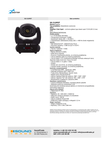 SG CLSPOT Opis produktu: SG CLSPOT Marka:Sagitter Typ produktu: Oświetlenie sceniczne Opis: Sagitter Club Spot - ruchoma głowa typu beam spot 72 W LED 11 kan. DMX. Specyfikacja techniczna: Źródło światła • 1 x 72 W dioda LED Biała • Temperatura barwowa: 5 600K • Żywotność diody LED: > 50.000 h • Częstotliwość odświeżania diody LED: > 400 Hz (brak migotania) Optyka • Kąt świecenia 9,4°, elektroniczny focus • Strumień świetlny: 3 360 lux @ 5 m (9,4°) System kolorów • Tarcza 7 kolorów + biały Opcje urządzenia • Płynny dimmer 0-100% • Efekt tęczy kolorów • Pryzma z możliwością obrotu, ze zmienną prędkością • Tarcza efektów gobo ze zmienną prędkością • Tarcza Gobo 1: 6 z możliwością łatwego montażu własnych tarcz (Rozmiar Gobo 23,9 mm / focus 15 mm) • Tarcza Gobo 2: 11 gobo + biały • Shaker • Strobo od 1 do 25 Hz, ze zmienną prędkością • Losowe strobo i pulsacja, ze zmienną prędkością Kontrola i programowanie • 2 konfiguracje DMX - 14/16 kan. DMX • Obsługa protokołu USITT DMX 512 • Tryby pracy Master/Slave, Sound i Auto. • Wybór pracy Pan/Tilt 8/16 bit • Zakres regulacji PAN (do wyboru): 360° / 540° / 630° • Zakres regulacji TILT (do wyboru): 90° / 180° / 270° • Resetowanie urządzenia z poziomu DMX Obudowa i wykończenie • Czarna metalowa obudowa i wysokiej jakości plastiki • Niebieski graficzny wyświetlacz LCD Automatyczna korekcja pozycji głowicy w momencie przypadkowej manualnej ingerencji. Złącza XLR-3 IN/OUT • Odporność IP: IP20 Zasilanie • Napięcie: AC~100-240 V, 50/60 Hz • Włącznik zasilania dostępny na obudowie • Pobór mocy: 100 W • Złącze prądowe PowerCON • Dołączony kabel zasilający o długości 1,5 m Waga i wymiary • Waga urządzenia: 6 kg • Wymiary: 270 x 149 x 364 mm UWAGA! Pomimo dołożenia wszelkich starań nie gwarantujemy, że umieszczone opisy, zdjęcia i podane ceny nie zawierają uchybień lub błędów. Nie mogą być one jednak podstawą do jakichkolwiek roszczeń. Informujemy też, że zestawienia towarów i cen podane na naszych stronach nie są ofertą w świetle przepisów kodeksu cywilnego. SoundTrade zastrzega sobie prawo do zmiany cen i opisów bez uprzedniego powiadomienia. SoundTrade ul. Kineskopowa 1 05-500 Piaseczno telefon: (+48 22) 632 02 85 www:soundtrade.pl | e-mail: [email protected] NIP: 678 120 08 88