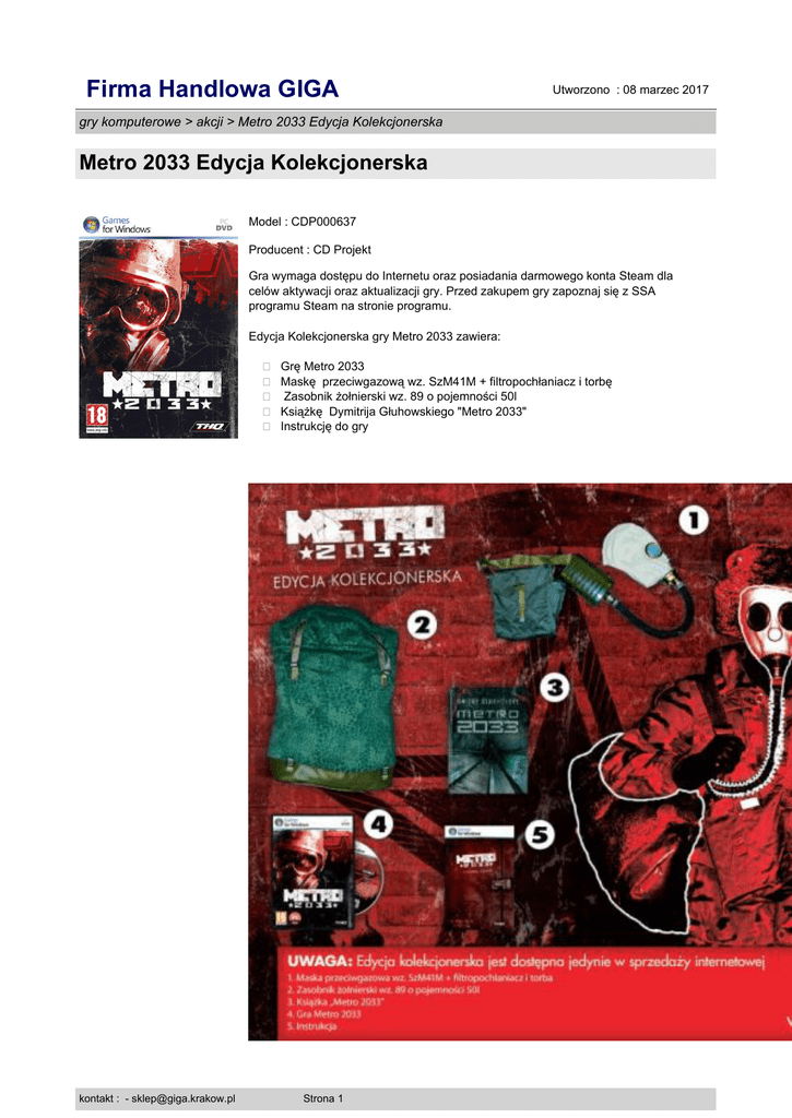 Firma Handlowa GIGA Utworzono : 08 marzec 2017 gry komputerowe > akcji > Metro 2033 Edycja Kolekcjonerska Metro 2033 Edycja Kolekcjonerska Model : CDP000637 Producent : CD Projekt Gra wymaga dostępu do Internetu oraz posiadania darmowego konta Steam dla celów aktywacji oraz aktualizacji gry. Przed zakupem gry zapoznaj się z SSA programu Steam na stronie programu. Edycja Kolekcjonerska gry Metro 2033 zawiera: � � � � � kontakt : - [email protected] Grę Metro 2033 Maskę przeciwgazową wz. SzM41M + filtropochłaniacz i torbę Zasobnik żołnierski wz. 89 o pojemności 50l Książkę Dymitrija Głuhowskiego "Metro 2033" Instrukcję do gry Strona 1 Firma Handlowa GIGA Utworzono : 08 marzec 2017 gry komputerowe > akcji > Metro 2033 Edycja Kolekcjonerska Metro 2033 Edycja Kolekcjonerska W pudełku z Edycją Kolekcjonerską oprócz gry Metro 2033 i instrukcji do gry gracz znajdzie najważniejsze elementy potrzebne do przetrwania nadchodzącej apokalipsy. W wytrzymałym wojskowym plecaku zmieści rzeczy pierwszej potrzeby, które powinien mieć zawsze pod ręką. Maska gazowa uchroni go przed pyłem i trującymi oparami. Nielicznym szczęśliwcom da to wystarczająco dużo czasu na odnalezienie bezpiecznego schronienia. Na najgorsze należy zacząć przygotowywać się już teraz! Dlatego w zestawie znalazła się również książka "Metro 2033" Dymitrija Głuhowskiego - to prawie 600 stron niesamowicie wciągającej lektury, w której w przejmująco realistyczny sposób autor zawarł swoją wizję świata po zagładzie atomowej. Bez niej nie sposób przygotować się na najgorsze. Gra osadzona na zgliszczach zmiecionej atomową apokalipsą Moskwy. Metro 2033 to gwałtowna i przerażająca historia walki o przetrwanie gatunku ludzkiego, który stanął na krawędzi zagłady, a jego los spoczywa w Twoich rękach. W 2013 roku świat został kompletnie zniszczony. Większość ludzkości wyparowała w serii oślepiających błysków, a Ziemia zamieniła się w skażoną, śmiertelnie niebezpieczną pustynię. Nieliczni, którzy przetrwali, schronili się pod powierzchnią, szukając ratunku w tunelach moskiewskiego metra. Pozostałości ludzkiej cywilizacji wkroczyły w nową erę mroku. Jest rok 2033. Całe pokolenie narodziło się i wychowało pod ziemią. W nowym świecie ciągle trwa walka. Miasta-Stacje walczą między sobą o przestrzeń życiową, jednocześnie odpierając ataki zmutowanych bestii, nadchodzących z powierzchni. Wcielasz się w Artema, urodzonego jeszcze przed dniami ognia, ale wychowanego pod ziemią. Nigdy nie opuszczałeś swojej rodzimej stacji, aż do momentu, gdy pewnej pamiętnej nocy zostajesz obarczony misją, która zabierze cię do serca podziemnego kompleksu metra. Twoim zadaniem będzie ostrzec ludzi przed nadchodzącym, śmiertelnym zagrożeniem. W trakcie podróży odwiedzisz wiele niesamowitych miejsc, od podziemnych katakumb po spalone kataklizmem miasto. Los ludzkości spoczywa w Twoich rękach... Metro 2033 to mroczny, klimatyczny shooter z grafiką najnowszej generacji. W pełni wspiera technologię DX 10 i NVIDIA PhysX dostarczając oszałamiających wrażeń wizualnych. Doświadcz trudów życia w społeczeństwie odartym z wyższych wartości i szarpanym szponami strachu Przemierzaj mroczne tunele, w których zabić mogą cię nie tylko zdeformowane bestie, ale też przerażające, niewyjaśnione siły Odkryj spustoszony świat na powierzchni. Przed wyjściem sprawdź filtry w masce i zapas amunicji, bo będzie to Twoja jedyna ochrona. Zbierz w sobie całą odwagę jaką posiadasz, gdyż grozy jaka Cię czeka nie sposób opisać słowami... Wymagania: dwurdzeniowy procesor Core 2 Duo lub lepszy, karta graficzna GeForce 8800, GeForce GT 220 lub nowsza kompatybilna z DirectX 9 i Shader Model 3, 1 GB RAM. � kontakt : - [email protected] Strona 2 Firma Handlowa GIGA gry komputerowe > akcji > Metro 2033 Edycja Kolekcjonerska Metro 2033 Edycja Kolekcjonerska � Cena : 199,00 zł Brutto ( 199,00 zł Netto) kontakt : - [email protected] Strona 3 Utworzono : 08 marzec 2017