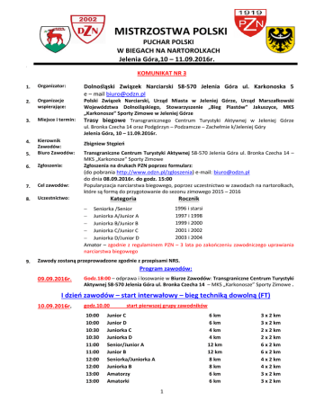 MISTRZOSTWA POLSKI PUCHAR POLSKI W BIEGACH NA NARTOROLKACH Jelenia Góra,10 – 11.09.2016r. KOMUNIKAT NR 3 1. Organizator: Dolnośląski Związek Narciarski 58-570 Jelenia Góra ul. Karkonoska 5 e – mail [email protected] 2. Organizacje wspierające: 3. Miejsce i termin: Polski Związek Narciarski, Urząd Miasta w Jeleniej Górze, Urząd Marszałkowski Województwa Dolnośląskiego, Stowarzyszenie „Bieg Piastów” Jakuszyce, MKS „Karkonosze” Sporty Zimowe w Jeleniej Górze Trasy biegowe Transgranicznego Centrum Turystyki Aktywnej w Jeleniej Górze ul. Bronka Czecha 14 oraz Podgórzyn – Podzamcze – Zachełmie k/Jeleniej Góry Jelenia Góra, 10 – 11.09.2016r. 4. 5. Kierownik Zawodów: Biuro Zawodów: 6. Zgłoszenia: 7. Cel zawodów: 8. Uczestnictwo: Zbigniew Stępień Transgraniczne Centrum Turystyki Aktywnej 58-570 Jelenia Góra ul. Bronka Czecha 14 – MKS „Karkonosze” Sporty Zimowe Zgłoszenia na drukach PZN poprzez formularz: (do pobrania http://www.odzn.pl/zgloszenia) e-mail: [email protected] do dnia 08.09.2016r. do godz. 15:00 Popularyzacja narciarstwa biegowego, poprzez uczestnictwo w zawodach na nartorolkach, które są formą do przygotowanie do sezonu zimowego 2015 – 2016 Kategoria Rocznik 1996 i starsi Seniorka /Senior 1997 i 1998 Juniorka A/Junior A 1999 i 2000 Juniorka B/Junior B 2001 i 2002 Juniorka C/Junior C 2003 i 2004 Juniorka D/Junior D Amator – zgodnie z regulaminem PZN – 3 lata po zakończeniu zawodniczego uprawiania narciarstwa biegowego 9. Zawody zostaną przeprowadzone zgodnie z przepisami NRS. Program zawodów: 09.09.2016r. Godz.18:00 – odprawa i losowanie w Biurze Zawodów: Transgraniczne Centrum Turystyki Aktywnej 58-570 Jelenia Góra ul. Bronka Czecha 14 – MKS „Karkonosze” Sporty Zimowe . I dzień zawodów – start interwałowy – bieg techniką dowolną (FT) 10.09.2016r. godz.10.00 10:00 10:00 10:30 10:30 11:00 11:00 12:00 12:00 13:00 13:00 start pierwszej grupy zawodników Junior C Junior D Juniorka C Juniorka D Senior/Junior A Junior B Seniorka/Juniorka A Juniorka B Amatorzy Amatorki 6 km 6 km 4 km 4 km 12 km 12 km 8 km 8 km 6 km 6 km 1 3 x 2 km 3 x 2 km 2 x 2 km 2 x 2 km 6 x 2 km 6 x 2 km 4 x 2 km 4 x 2 km 3 x 2 km 3 x 2 km II dzień zawodów – start interwałowy – Bieg Pod Górę – 3600 m – bieg techniką klasyczną (CT) 11.09.2016r. 10:00 10:40 11:20 12:00 12:40 Senior/Junior A Seniorka/Juniorka A Junior B/Junior C Juniorka B/Juniorka C Amatorka/Amator Inne ustalenia: Zawodnik musi posiadać aktualne badania lekarskie i ubezpieczenie. W pierwszym dniu zawodów bieg odbędzie się techniką dowolną (F). W drugim dniu zawodów bieg odbywać się będzie techniką klasyczną (CL). Zawodnicy startują na sprzęcie organizatora /losowanie nartorolek/. Nartorolki przygotowane są przez organizatora, przy zgłoszeniach proszę o podanie typu wiązań. Uczestnik zawodów zobowiązany jest do posiadania kasku ochronnego i okularów. Za ubezpieczenie zawodników odpowiada zgłaszający Klub, organizacja lub osobiście zgłoszony zawodnik /Art. 52 ust. O Kult. Fiz. z dnia 19.01.1996r./ Uroczystość dekoracji bezpośrednio po zakończeniu zawodów. 2. Nagrody: I – III miejsce – medal + dyplom + upominki IV – V – VI – dyplomy + upominki 3. Opłata startowa: Obowiązuje opłata startowa w wysokości: 25,00 PLN dla zawodników z licencjami (Seniorka/Senior, Juniorka/Junior A, B, C, D) Zawodnicy z grupy AMATOR – 30,00 PLN – opłata pobierana przy odbiorze numerów startowych. Opłata startowa pobierana przy odbiorze numerów startowych w dniu zawodów. 4. Zgłoszenia do zawodów wyłącznie na obowiązujących drukach PZN. 5. Zawody zostaną przeprowadzone zgodnie z NRS, aktualnymi Wytycznymi i Regulaminem Pucharu Polski 2016 w Biegach na Nartorolkach. 6. Start w zawodach na własną odpowiedzialność. 7. Organizator nie ponosi odpowiedzialności za szkody wynikłe w stosunku do uczestników zawodów, osób trzecich oraz ewentualne nieszczęśliwe wypadki podczas zawodów. 8. Uczestnik imprezy zobowiązany jest do przestrzegania regulaminu zawodów. Nie przestrzeganie oraz niedostosowanie się do uwag i poleceń organizatora zawodów powoduje dyskwalifikacje zawodnika. 9. Zawody będą odbywały się bez względu na panujące warunki atmosferyczne. 10. Wszystkie kwestie sporne dotyczące rozgrywanych zawodów oraz rywalizacji rozstrzyga organizator i Komisja Sędziowska/Jury Zawodów/zgodnie z wytycznymi PZN i NRS. 11. Organizator zastrzega sobie prawo do zmian w programie w przypadku niesprzyjających warunków atmosferycznych. 12. Kontakt i informacje: – Kierownik Zawodów – Stępień Zbigniew – 502 711 686 – e – mail [email protected] ; [email protected] 1. Organizator 2
