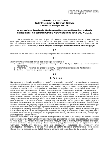 Załącznik Nr 10 do protokołu Nr VI/2007 z sesji Rady Miejskiej w NOWYM STAWIE z dnia 26 lutego 2007r. Uchwała Nr 44/2007 Rady Miejskiej w Nowym Stawie z dnia 26 lutego 2007r. w sprawie uchwalenia Gminnego Programu Przeciwdziałania Narkomanii na terenie Gminy Nowy Staw na lata 2007-2015. Na podstawie art. 18, ust. 2, pkt. 15 ustawy z dnia 08 marca 1990r. o samorządzie gminnym ( tekst jednolity Dz. U z 2001r. Nr 142, poz. 1591 z późn. zmianami) oraz art. 10, ust. 2 i 3 ustawy z dnia 29 lipca 2005r. o przeciwdziałaniu narkomanii ( Dz. U z 2005r. Nr 179, poz. 1485 z późn. zmianami)- Rada Miejska w Nowym Stawie uchwala, co następuje: §1 Uchwala się na lata 2007- 2015 Gminny Program Przeciwdziałania Narkomanii w brzmieniu: § 2 Ilekroć w Programie jest mowa bez bliŜszego określenia o; 1. ustawie – rozumie sie przez to ustawę z dnia 29 lipca 2005r. o przeciwdziałaniu narkomanii, 2. Programie – rozumie się przez to Gminny Program Przeciwdziałania Narkomanii, 3. Gminie – rozumie sie przez to gminę Nowy Staw. § 3 I. W s t ę p Narkomania ( z języka greckiego „ nerke' – odurzenie i „mania” - szaleństwo) to potoczne określenie odnoszące się do uzaleŜnienia od substancji chemicznych wpływających na czynność mózgu. Narkomania charakteryzuje się; tzw; głodem narkotycznym, przymusem zaŜywania środków odurzających i chęcią zdobycia narkotyku za wszelką cenę i wszystkimi sposobami. W zaleŜności od stosowanego środka uzaleŜniającego funkcjonuje podział na;morfinizm – uzaleznienie od zaŜywania morfiny, kokainizm – uzaleŜnienie od zaŜywania kokainy, heroinizm- uzaleŜnienie od zaŜywania heroiny oraz uzaleŜnienie od wziewnych środków odurzających. Według raportu z ogólnopolskich badań ankietowych przeprowadzonych przez Instytut Psychiatrii i Neurologii wśród młodzieŜy w wieku gimnazjalnym, na pierwszym miejscu pod względem rozpowszechnienia znajduje się marihuana, na drugim – leki uspokajające i nasenne przyjmowane bez zlecenia lekarza, a na trzecim – substancje wziewne i amfetamina. Starsza młodzieŜ najczęściej sięga po ecstasy. Narkomania to problem społeczny stanowiący wyzwanie cywilizacyjne o zasięgu ogólnoświatowym, niosący powaŜne ryzyko dla zdrowia ( szczególnie choroby infekcyjne) i Ŝycia ludzkiego. Ryzyko zgonu wsród narkomanów jest kilkakrotnie wyŜsze niŜ w porównywalnej wiekowo populacji. Narkomania ściśle związana jest z wieloma problemami społecznymi, do najczęstszych naleŜą; ubóstwo, bezrobocie, prostytucja, przestępczość i bezdomność. Problem narkomanii nie omija równieŜ naszej Gminy. W roku 2005 Policja w Nowym Stawie przygotowała 3 postępowania przygotowawcze za posiadanie środków odurzających, natomiast w roku 2006 - 2. Powszechna jest styczność młodych ludzi z narkotykami podczas dyskotek, imprez okolicznościowych oraz podczas nauki i przygotowywania się do egzaminów. Pod wpływem narkotyków człowiek staje się agresywny, dopuszcza sie przemocy oraz przestępstwa. Potrzebne, a nawet niezbędne są zatem działania profilaktyczne, które nasza Gmina kieruje szczególnie do Szkół. Istnieje ponadto potrzeba dotarcia do osób dorosłych - 2 /-/ m.innymi do rodziców, wychowawców i opiekunów. Wszystkie posiadane środki i narzędzia oprócz Gimny winny uruchomić równieŜ organa ścigania oraz lekarze w zakresie umiejętności wczesnego rozpoznania sygnałów wskazujących na prawdopodobieństwo zaŜycia narkotyków i postępowania z osobami juz uzaleznionymi. II. Zasoby Gminy Nowy Staw w zakresie przeciwdziałania narkomanii. Na terenie Gminy Nowy Staw przeciwdziałaniem narkomanii zajmują się; 1. Burmistrz Miasta Nowy Staw poprzez Gminną Komisję Rozwiązywania Problemów Alkoholowych i podległe jej świetlice socjoterapeutyczne oraz Referat Infratsruktury, 2. Posterunek Policji w Nowym Stawie, 3. Miejski Ośrodek Pomocy Społecznej w Nowym Stawie, 4. Niepubliczny Zespół Opieki Zdrowotnej „NOVAMED” w Nowym Stawie, 5. Stowarzyszenie na Rzecz Bezdomnych, Dom Modlitwy „AGAPE”, Centrum Usług Socjalnych i Wsparcia w Nowym Stawie, 6. Powiatowe Centrum Pomocy Rodzinie w Malborku, 7. Dyrekcja SP nr 2 w Nowym Stawie, SP w Świerkach oraz Gimnazjum w Nowym Stawie, 8. Dyrekcja Zespołu Szkół Ponadgimnazjalnych w Nowym Stawie. III. Cele Programu. Podstawowym celem Programu jest zapobieganie powstawaniu nowych problemów w zakresie stosowania środków odurzających, zmniejszenie problemu uzaleznień, które juŜ występują oraz szeroko rozumianą profilaktykę w zakresie przeciwdziałania narkomanii. Zadania Programu skoncentrowane są w szczególności na rozwijaniu i popieraniu działalności informacyjnej i kulturalnej oraz prowadzeniu działalności wychowawczej polegającej na; promocji zdrowego stylu Ŝycia, wspieraniu działalności placówek prowadzących działalność zapobiegawczą w środowiskach zagroŜonych uzaleŜnieniem od środków odurzających, informowaniu o szkodliwości środków i substancji psychoaktywnych, których uŜywanie moŜe prowadzić do narkomanii oraz o jej skutkach, podejmowaniu i wspieraniu działań lokalnych oraz innych inicjatyw w zakresie profilaktyki na terenie szkół podstawowywch i ponadpodstawowywhch, kierowanych do dzieci, młodzieŜy i ich rodziców. Odbiorcami Programu są: dzieci i młodzieŜ szkolna, rodzice osób uzaleŜnionych, osoby zajmujące sie profilaktyką w szkołach oraz społeczność lokalna. IV. Źródła finansowania. 1. Środki finansowe uzyskane z opłat za korzystanie z zezwoleń na sprzedaŜ napojów alkoholowych w 2007 roku oraz w latach następnych. 2. Kwotę przewidzianą na realizację zadań określa dział 851 „ochrona zdrowia”, rozdział 85153 „ przeciwdziałanie narkomanii” w budŜecie Gminy na 2007 rok; - § 4210 zakup materiałów i wyposaŜenia – 500,- zł, - § 4300 zakup usług pozostałych – 500,- zł 3. W latach następnych nie przewiduje się zmiany Ŝr