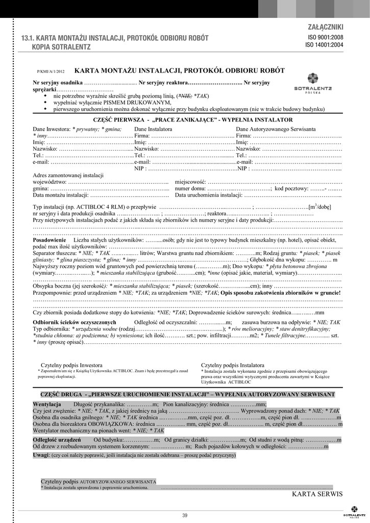 ZAŁĄCZNIKI 13.1. karta montażu instalacji, protokół odbioru robót kopia Sotralentz P/KMI/A/1/2012 ISO 9001:2008 ISO 14001:2004 KARTA MONTAŻU INSTALACJI, PROTOKÓŁ ODBIORU ROBÓT Nr seryjny osadnika ……………................. Nr seryjny reaktora……………………….. Nr seryjny sprężarki………………………… nie potrzebne wyraźnie skreślić grubą poziomą linią, (*NIE; *TAK) wypełniać wyłącznie PISMEM DRUKOWANYM, pierwszego uruchomienia można dokonać wyłącznie przy budynku eksploatowanym (nie w trakcie budowy budynku) CZĘŚĆ PIERWSZA - „PRACE ZANIKAJĄCE” - WYPEŁNIA INSTALATOR Dane Inwestora: * prywatny; * gmina; Dane Instalatora Dane Autoryzowanego Serwisanta * inny…………….…………….………….. Firma: …………………………………….. Firma: ……………………………………….. Imię: ……………………………………….Imię: ……………………………………….Imię: ………………………………………… Nazwisko: ……………………………….... Nazwisko: ………………………………… Nazwisko: …………………………………… Tel.: ………………………………………..Tel.: …………………………………......... Tel.: …………………………………………. e-mail: …………………………………….. e-mail: ………………...................................e-mail: ………………………......................... NIP : ………………………………………..NIP : ………………………………………... Adres zamontowanej instalacji województwo: …………………………………………….. miejscowość: ………………………………….……………………….… gmina: ……………………………………………………... numer domu: …………...……………….; kod pocztowy: ……..- …..… Data montażu instalacji: ……………………..……………. Data uruchomienia instalacji: …………………..……………………….. Typ instalacji (np. ACTIBLOC 4 RLM) o przepływie ……………………………..………….. ; ……………………….[m3/dobę] nr seryjny i data produkcji osadnika …...……………... ; …………………; reaktora…...……………... ; ………………… Przy nietypowych instalacjach podać z jakich składa się zbiorników ich numery seryjne i daty produkcji:…………….…………….….. ………………………………………………...……………………………………………………………………………………………. …………………………………………………………….………….………..….…….………………………………………………….. Posadowienie Liczba stałych użytkowników: ……....osób; gdy nie jest to typowy budynek mieszkalny (np. hotel), opisać obiekt, podać max ilość użytkowników: ……………………...…………………..……………………………………………………………….. Separator tłuszczu: * NIE; * TAK …...…....… litrów; Warstwa gruntu nad zbiornikiem: ………..m; Rodzaj gruntu: * piasek; * piasek gliniasty; * glina piaszczysta; * glina; * inny .…………………..…….………………………; Głębokość dna wykopu: …………. m Najwyższy roczny poziom wód gruntowych pod powierzchnią terenu (…...………m); Dno wykopu: * płyta betonowa zbrojona (wymiary.……..……..…); * mieszanka stabilizująca (grubość…..…...cm); *inne (opisać jakie, materiał, wymiary)…………………... …………………………. …………..………………..……………………………………………………………………………………. Obsypka boczna (jej szerokość): * mieszanka stabilizująca; * piasek; (szerokość…..…….…...cm); inny ……………………………… Przepompownie: przed urządzeniem * NIE; *TAK; za urządzeniem *NIE; *TAK; Opis sposobu zakotwienia zbiorników w gruncie! ……………………………………………………………………………………………………………………………………………… ……………………………………………………………………………………………………………………………………………… Czy zbiornik posiada dodatkowe stopy do kotwienia: *NIE; *TAK; Doprowadzenie ścieków surowych: średnica…..…...…mm Odbiornik ścieków oczyszczonych Odległość od oczyszczalni: ………...…m; zasuwa burzowa na odpływie: * NIE; TAK Typ odbiornika: * urządzenia wodne (rodzaj…….……………………...….……....); * rów melioracyjny; * staw denitryfikacyjny; *studnia chłonna: a) podziemna; b) wyniesiona; ich ilość…….…. szt.; pow. infiltracji……….m2; * Tunele filtracyjne.……….... szt. * inny (proszę opisać)…………….………………………………………………………………………..……………………….……… Czytelny podpis Inwestora * Zapoznałem/am się z Książką Użytkownika ACTIBLOC. Znam i będę przestrzegał/a zasad poprawnej eksploatacji. Czytelny podpis Instalatora * Instalacja została wykonana zgodnie z przepisami obowiązującego prawa oraz wszystkimi wytycznymi producenta zawartymi w Książce Użytkownika ACTIBLOC CZĘŚĆ DRUGA - „PIERWSZE URUCHOMIENIE INSTALACJI” – WYPEŁNIA AUTORYZOWANY SERWISANT Wentylacja Długość przykanalika: ….……….m; Pion kanalizacyjny: średnica …………..mm; Czy jest zwężenie: * NIE; * TAK, z jakiej średnicy na jaką ………………………………. Wyprowadzony ponad dach: * NIE; * TAK Osobna dla osadnika gnilnego: * NIE; * TAK średnica ...…..……...mm, część poz. dł. .…….……..m, część pion dł. ….