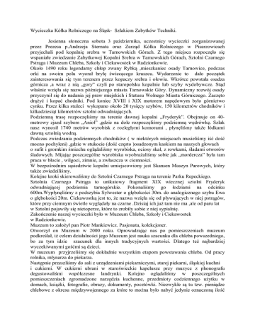 Wycieczka Kółka Rolniczego na Śląsk- Szlakiem Zabytków Techniki. Jesienna słoneczna sobota 3 października, uczestnicy wycieczki zorganizowanej przez Prezesa p.Andrzeja Sternata oraz Zarząd Kółka Rolniczego w Pisarzowicach przyjechali pod kopalnię srebra w Tarnowskich Górach. Z tego miejsca rozpoczęło się wspaniałe zwiedzanie Zabytkowej Kopalni Srebra w Tarnowskich Górach, Sztolni Czarnego Pstrąga i Muzeum Chleba, Szkoły i Ciekawostek w Radzionkowie. Około 1490 roku legendarny chłop zwany Rybką ,mieszkaniec osady Tarnowice, podczas orki na swoim polu wyorał bryłę świecącego kruszcu. Wydarzenie to dało początek zainteresowania się tym terenem przez kopaczy srebra i ołowiu. Wkrótce powstała osadza górnicza ,a wraz z nią „gory” czyli po staropolsku kopalnie lub szyby wydobywcze. Stąd właśnie wzięła się nazwa późniejszego miasta Tarnowskie Góry. Dynamiczny rozwój osady przyczynił się do nadania jej praw miejskich i Statusu Wolnego Miasta Górniczego. Zaczęto drążyć i kopać chodniki. Pod koniec XVIII i XIX motorem napędowym było górnictwo cynku. Przez kilka stuleci wykopano około 20 tysięcy szybów, 150 kilometrów chodników i kilkadziesiąt kilometrów sztolni odwadniających. Podziemną trasę rozpoczęliśmy na terenie dawnej kopalni „Fryderyk”. Obejmuje on 40metrowy zjazd szybem „Anioł” ,gdzie na dole rozpoczęliśmy podziemną wędrówkę. Szlak nasz wynosił 1740 metrów wyrobisk z rozległymi komorami , płynęliśmy także łódkami dawną sztolnią wodną. Podczas zwiedzania podziemnych chodników ( w niektórych miejscach musieliśmy iść dość mocno pochyleni) ,gdzie w stukocie (dość często )osadzonym kaskiem na naszych głowach o sufit i gromkim śmiechu oglądaliśmy wyrobiska, ociosy skał, z rowkami, śladami otworów śladowych. Mijając poszczególne wyrobiska wyobrażaliśmy sobie jak „mordercza” była tam praca w błocie , wilgoci, zimnie, a zwłaszcza w ciemności. W bezpośrednim sąsiedztwie kopalni umiejscowiony jest Skansen Maszyn Parowych, który także zwiedziliśmy. Kolejne kroki skierowaliśmy do Sztolni Czarnego Pstrąga na terenie Parku Repeckiego. Sztolnia Czarnego Pstrąga to unikatowy fragment XIX wiecznej sztolni Fryderyk odwadniającej podziemia tarnogórskie. Pokonaliśmy go łodziami na odcinku 600m.Wypłynęliśmy z podszybia Sylwester o głębokości 30m. do analogicznego szybu Ewa o głębokości 20m. Ciekawostką jest to, że nazwa wzięła się od pływających w niej pstrągów, które przy ciemnym świetle wyglądały na czarne .Dzisiaj ich już tam nie ma ,ale od paru lat w Sztolni pojawiły się nietoperze, które to zrobiły sobie z niej sypialnię. Zakończenie naszej wycieczki było w Muzeum Chleba, Szkoły i Ciekawostek w Radzionkowie. Muzeum to założył pan Piotr Mankiewicz. Pasjonata, kolekcjoner. Otworzył on Muzeum w 2000 roku. Oprowadzając nas po pomieszczeniach muzeum podkreślał, iż celem działalności jego Muzeum jest nauka szacunku dla chleba powszedniego, bo za tym idzie szacunek dla innych tradycyjnych wartości. Dlatego też najbardziej wyczekiwanymi gośćmi są dzieci. W muzeum przyjrzeliśmy się dokładnie wszystkim etapom powstawania chleba. Od pracy rolnika, młynarza do piekarza. Następnie przeszliśmy do sali z urządzeniami piekarniczymi, starej piekarni, śląskiej kuchni i cukierni. W cukierni ubrani w staroświeckie kapelusze przy muzyce z phonografu degustowaliśmi współczesne landrynki. Kolejno oglądaliśmy w poszczególnych pomieszczeniach zgromadzone narzędzia kuchenne, przedmioty codziennego użytku w domach, książki, fotografie, obrazy, dokumenty, pocztówki. Niezwykłe są tu tzw. pieniądze chlebowe z okresu międzywojennego za które to można było nabyć jedynie oznaczoną ilość chleba. Byliśmy w dawnej sali lekcyjnej, siedząc w drewnianych ławkach z oryginalnymi kałamarzami wspominaliśmy nasze lata szkolne. Nie lada atrakcją była możliwość upieczenia własnej strucelki przez każdego uczestnika wycieczki. Kiedy nasze strucelki chlebowe upiekły się , pan Piotr Mankiewicz zaprosił nas do sali biesiadnej, gdzie poczęstowano nas pieczoną kiełbaską z pysznym radzionkowym chlebem. A po zjedzeniu chrupiącej strucelki, pożegnani przez gospodarza pięknym wierszem; A to idzie z łaski Boskiej Chleb prądnicki, chleb krakowski! By u wozu przednie koło Toczy się do dom wesoło, Święć się wielki Boże, w niebie! A na ziemi, polski chlebie! (…) pożegnaliśmy wspaniałego człowieka i pełni wrażeń, wspomnień , z wypiekami na policzkach udaliśmy się w drogę powrotną do Pisarzowic. W imieniu uczestników wycieczki serdecznie dziękujemy tym którzy ją zorganizowali. Cecylia Puzoń