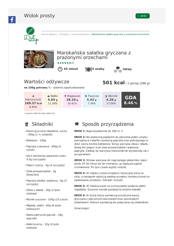 Widok prosty wróć Strona główna Przepisy Lista przepisów Marokańska sałatka gryczana z prażonymi orzechami Marokańska sałatka gryczana z prażonymi orzechami (3) 45 minut 4 osoby Wartości odżywcze łatwy 501 kcal / 1 porcję (296 g) na 100g potrawy % - dzienne zapotrzebowanie Białko Kaloryczność 5.64 169.27 11.28% kcal g Węglowod. 28.10 g 10.41% Tłuszcze 5.43 g 7.76% Błonnik 4.26 g 17.04% GDA 8.46 % 8.46% * wartoś ci GDA dla diety 2000 kcal Składniki Kasza gryczana niepalona, sucha - 300g (1 ½ szklanki) Bakłażan - 240g Papryka czerwona - 400g (2 sztuki) Sól o obniżonej zawartości sodu 0.5g (szczypta) Pieprz czarny - 4g (4 szczypty) Zioła prowansalskie - 3g (łyżeczka) Papryka słodka, wędzona - 6g (3 szczypty) Oliwa z oliwek - 20g (2 łyżki stołowe) Sposób przyrządzenia KROK 1: Nagrzej piekarnik do 180 st. C. KROK 2: Na wyłożonej papierem do pieczenia połóż umytą i pokrojoną w ćwiartki czerwoną paprykę oraz pokrojonego w dość sporą kostkę bakłażana. Skrop warzywa oliwą z oliwek, dodaj sól i pieprz oraz zioła prowansalskie i wędzoną paprykę. Zadbaj, by warzywa równomiernie wymieszały się z przyprawami. KROK 3: Wstaw warzywa do nagrzanego piekarnika i piecz około 25-30 minut lub do momentu, aż będą porządnie zrumienione. Po tym czasie wyjmij i ostudź. KROK 4: W między czasie przepłucz kaszę gryczaną na sicie, a następnie ugotuj ją według przepisu zamieszczonej na opakowaniu produktu. Odcedź i ostudź. KROK 5: W miedzyczasie na suchej patelni podpraż płatki migdałów. Suszone morele posiekaj na drobne kawałki. Morele suszone - 100g (10 sztuk) KROK 6: W dużej misce wymieszaj ostudzona kaszę gryczaną z pieczonymi warzywami oraz pozostałymi składnikami. Dobrze wymieszaj do połączenia się składników. Migdały, płatki - 60g (6 łyżek stołowych) Smacznego! Natka pietruszki pęczek - 18g (pęczek) Kiełki lucerny - 32g (4 łyżki stołowe) Serwis internetowy DietMap wykorzystuje pliki cookies, które umożliwiają i ułatwiają Ci korzystanie z jego zasobów. Korzystając z serwisu wyrażasz jednocześnie zgodę na wykorzystanie plików cookies. Szczegółowe informacje znajdziesz w zakładce Zastrzeżenia Prawne. akceptuję