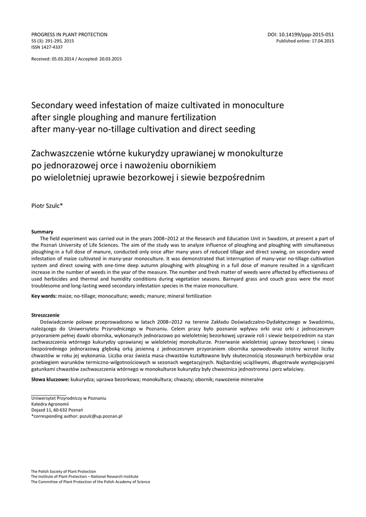 PROGRESS IN PLANT PROTECTION 55 (3): 291-295, 2015 ISSN 1427-4337 DOI: 10.14199/ppp-2015-051 Published online: 17.04.2015 Received: 05.03.2014 / Accepted: 20.03.2015 Secondary weed infestation of maize cultivated in monoculture after single ploughing and manure fertilization after many-year no-tillage cultivation and direct seeding Zachwaszczenie wtórne kukurydzy uprawianej w monokulturze po jednorazowej orce i nawożeniu obornikiem po wieloletniej uprawie bezorkowej i siewie bezpośrednim Piotr Szulc* Summary The field experiment was carried out in the years 2008–2012 at the Research and Education Unit in Swadzim, at present a part of the Poznań University of Life Sciences. The aim of the study was to analyze influence of ploughing and ploughing with simultaneous ploughing-in a full dose of manure, conducted only once after many years of reduced tillage and direct sowing, on secondary weed infestation of maize cultivated in many-year monoculture. It was demonstrated that interruption of many-year no-tillage cultivation system and direct sowing with one-time deep autumn ploughing with ploughing in a full dose of manure resulted in a significant increase in the number of weeds in the year of the measure. The number and fresh matter of weeds were affected by effectiveness of used herbicides and thermal and humidity conditions during vegetation seasons. Barnyard grass and couch grass were the most troublesome and long-lasting weed secondary infestation species in the maize monoculture. Key words: maize; no-tillage; monoculture; weeds; manure; mineral fertilization Streszczenie Doświadczenie polowe przeprowadzono w latach 2008–2012 na terenie Zakładu Doświadczalno-Dydaktycznego w Swadzimiu, należącego do Uniwersytetu Przyrodniczego w Poznaniu. Celem pracy było poznanie wpływu orki oraz orki z jednoczesnym przyoraniem pełnej dawki obornika, wykonanych jednorazowo po wieloletniej bezorkowej uprawie roli i siewie bezpośrednim na stan zachwaszczenia wtórnego kukurydzy uprawianej w wieloletniej monokulturze. Przerwanie wieloletniej uprawy bezorkowej i siewu bezpośredniego jednorazową głęboką orką jesienną z jednoczesnym przyoraniem obornika spowodowało istotny wzrost liczby chwastów w roku jej wykonania. Liczba oraz świeża masa chwastów kształtowane były skutecznością stosowanych herbicydów oraz przebiegiem warunków termiczno-wilgotnościowych w sezonach wegetacyjnych. Najbardziej uciążliwymi, długotrwale występującymi gatunkami chwastów zachwaszczenia wtórnego w monokulturze kukurydzy były chwastnica jednostronna i perz właściwy. Słowa kluczowe: kukurydza; uprawa bezorkowa; monokultura; chwasty; obornik; nawożenie mineralne Uniwersytet Przyrodniczy w Poznaniu Katedra Agronomii Dojazd 11, 60-632 Poznań *corresponding author: [email protected] The Polish Society of Plant Protection The Institute of Plant Protection – National Research Institute The Committee of Plant Protection of the Polish Academy of Science 292 4 Wstęp / Introduction Secondary weed infestation of maize / Zachwaszczenie wtórne kukurydzy Od wielu lat najbardziej rozpowszechnionym systemem przygotowania gleby do siewu roślin uprawnych, niezależnie od warunków glebowych, klimatycznych i ekonomicznych jest uprawa płużna (Radecki i Opic 1991), bardzo kosztowna i czasochłonna (Machul i Księżak 2007). W związku z powyższym coraz więcej uwagi poświęca się poszukiwaniu sposobów zmniejszania nakładów na przygotowanie pola pod zasiew i ochrony upraw przed zachwaszczeniem. Zastąpienie uprawy tradycyjnej uprawą bezorkową i siewem bezpośrednim w ściernisko może być uzasadnione zarówno względami ekonomicznymi, jak i ekologicznymi (Blevins i Frye 1993). W takiej sytuacji należy spodziewać się ciągłych zmian w ilościowym i jakościowym składzie zbiorowisk chwastów, jako efektu wzajemnej ich konkurencji i kompensacji agresywnych taksonów (Domaradzki i Rola 2002). StupnickaRodzynkiewisz i wsp. (2004) twierdzą, że wprowadzenie uproszczeń uprawowych powoduje, że dotychczas stosowane chemiczne metody ograniczania zachwaszczenia mogą stawać się mało efektywne. Zmiany te są tym wyraźniejsze, im dłuższy jest czas stosowania uproszczeń. Dotychczas w Polsce zdaniem Dubasa i wsp. (2012), bezorkowy system uprawy kukurydzy jest stosowany na niewielką skalę. Tym niemniej jest on przedmiotem licznych prac badawczych, których wyniki pozwolą na uzasadnienie celowości jego stosowania (Wrzesińska i wsp. 2003; Owczarzak i wsp. 2009; Księżak i Bojarszczuk 2010; Gołębiowska 2011). Badania dotyczące wieloletniej monokultury kukurydzy uprawianej w systemie bezorkowym są przedmiotem wielu badań prowadzonych w Katedrze Agronomii Uniwersytetu Przyrodniczego w Poznaniu (Menzel i Dubas 2003; Szulc i Dubas 2008; Dubas i wsp. 2012). Celem pracy było wykazanie wpływu przerwania wieloletniej uprawy bezorkowej jednorazową orką i nawożeniem obornikiem na stan zachwaszczenia wtórnego kukurydzy będącego rezultatem niskiej skuteczności zastosowanego przedsiewnie herbicydu Roundup 360 SL. Materiały i metody / Materials and methods Doświadczenie polowe przeprowadzono w latach 2008–2012 na terenie Zakładu Doświadczalno-Dydak- tycznego w Swadzimiu, należącego do Uniwersytetu Przyrodniczego w Poznaniu. Kukurydza uprawiana była w monokulturze. Badanymi obiektami były: A – wieloletnia (od roku 1998) uprawa bezorkowa, siew bezpośredni, B – przerwanie w roku 2007 wieloletniej uprawy bezorkowej jednorazową głęboką orką jesienną (30 cm), C – przerwanie w roku 2007 wieloletniej uprawy bezorkowej jednorazową głęboką orką jesienną (30 cm) i nawożeniem obornikiem. Badania prowadzono jako doświadczenie jednoczynnikowe, statyczne w 4 powtórzeniach polowych. Obornik bydlęcy zastosowano jednorazowo w ilości 30 t/ha pod głęboką orkę jesienną w roku 2007. Zawierał on 4,7 g azotu/kg s.m.; 4,9 g fosforu/kg s.m.; 7,8 g potasu/kg s.m. Wykorzystanie 