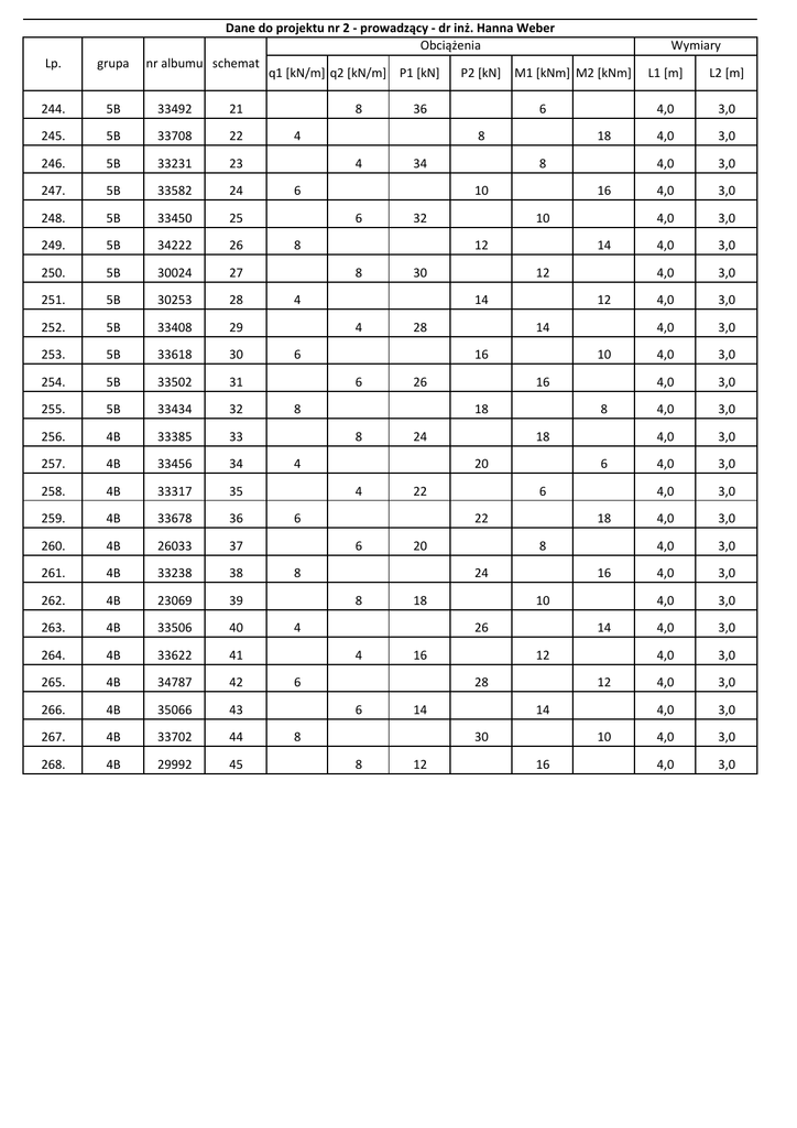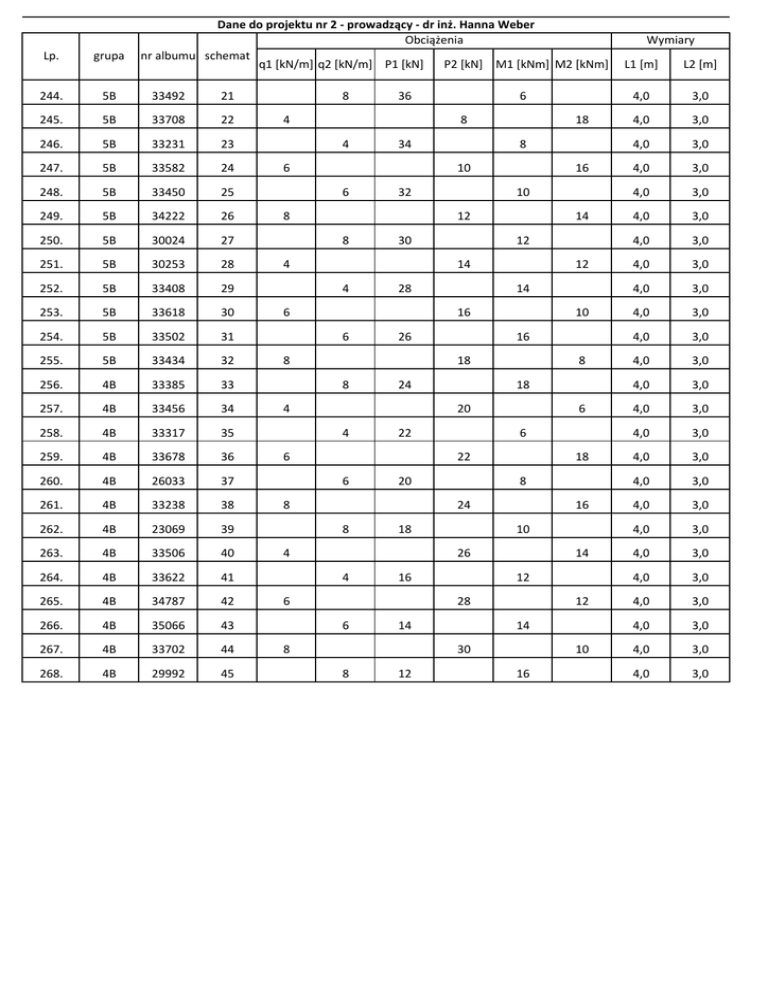 Dane do projektu nr 2 ‐ prowadzący ‐ dr inż. Hanna Weber Obciążenia nr albumu schemat q1 [kN/m] q2 [kN/m] P1 [kN] P2 [kN] M1 [kNm] M2 [kNm] Lp. grupa 244. 5B 33492 21 245. 5B 33708 22 246. 5B 33231 23 247. 5B 33582 24 248. 5B 33450 25 249. 5B 34222 26 250. 5B 30024 27 251. 5B 30253 28 252. 5B 33408 29 253. 5B 33618 30 254. 5B 33502 31 255. 5B 33434 32 256. 4B 33385 33 257. 4B 33456 34 258. 4B 33317 35 259. 4B 33678 36 260. 4B 26033 37 261. 4B 33238 38 262. 4B 23069 39 263. 4B 33506 40 264. 4B 33622 41 265. 4B 34787 42 266. 4B 35066 43 267. 4B 33702 44 268. 4B 29992 45 8 36 4 6 8 4 34 6 18 8 10 6 32 8 16 10 12 8 30 4 14 12 14 4 28 6 12 14 16 6 26 8 10 16 18 8 24 4 8 18 20 4 22 6 6 6 22 6 20 8 18 8 24 8 18 4 16 10 26 4 16 6 14 12 28 6 14 8 12 14 30 8 12 10 16 Wymiary L1 [m] L2 [m] 4,0 3,0 4,0 3,0 4,0 3,0 4,0 3,0 4,0 3,0 4,0 3,0 4,0 3,0 4,0 3,0 4,0 3,0 4,0 3,0 4,0 3,0 4,0 3,0 4,0 3,0 4,0 3,0 4,0 3,0 4,0 3,0 4,0 3,0 4,0 3,0 4,0 3,0 4,0 3,0 4,0 3,0 4,0 3,0 4,0 3,0 4,0 3,0 4,0 3,0