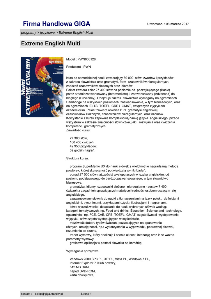 Firma Handlowa GIGA Utworzono : 08 marzec 2017 programy > językowe > Extreme English Multi Extreme English Multi Model : PWN000128 Producent : PWN Kurs do samodzielnej nauki zawierający 80 000 słów, zwrotów i przykładów z zakresu słownictwa oraz gramatyki, form czasowników nieregularnych, znaczeń czasowników złożonych oraz idiomów. Pakiet zawiera zbiór 27 300 słów na poziomie od początkującego (Basic) przez średniozaawansowany (Intermediate) i zaawansowany (Advanced) do biegłego (Prociency). Obejmuje zakres słownictwa wymagany na egzaminach Cambridge na wszystkich poziomach zaawansowania, w tym biznesowych, oraz na egzaminach IELTS, TOEFL, GRE i GMAT, związanych z językiem akademickim. Pakiet zawiera również kurs gramatyki angielskiej, czasowników złożonych, czasowników nieregularnych oraz idiomów. Korzystanie z kursu zapewnia kompleksową naukę języka angielskiego, przede wszystkim w zakresie znajomości słownictwa, jak i rozwijania oraz ćwiczenia kompetencji gramatycznych. Zawartość kursu: 27 300 słów, 160 400 ćwiczeń, 42 950 przykładów, 39 godzin nagrań. Struktura kursu: program SuperMemo UX do nauki słówek z wielokrotnie nagradzaną metodą powtórek, której skuteczność potwierdzają wyniki badań, ponad 27 000 słów najczęściej występujących w języku angielskim, od poziomu podstawowego do bardzo zaawansowanego, w tym słownictwo biznesowe, gramatyka, idiomy, czasowniki złożone i nieregularne - zestaw 7 400 ćwiczeń z zagadnień sprawiających najwięcej trudności osobom uczącym się angielskiego, zaawansowany słownik do nauki z tłumaczeniami na język polski, definicjami angielskimi, synonimami, przykładami użycia, ilustracjami i nagraniami, łatwe wyszukiwanie i dołączanie do nauki wybranych słówek według: kategorii tematycznych, np. Food and drinks, Education, Science and technology, egzaminów, np. FCE, CAE, CPE, TOEFL, GMAT, częstotliwości występowania w języku, słów często występujących w sąsiedztwie, możliwość doboru typów ćwiczeń, pozwalających na opanowanie różnych umiejętności, np.: wykorzystania w wypowiedzi, poprawnej pisowni, rozumienia ze słuchu, trener wymowy, który analizuje i ocenia akcent, intonację oraz inne ważne parametry wymowy, gratisowa aplikacja w postaci słownika na komórkę. Wymagania sprzętowe: Windows 2000 SP3 PL, XP PL, Vista PL, Windows 7 PL, Internet Explorer 7.0 lub nowszy, 512 MB RAM, napęd DVD-ROM, karta dźwiękowa, kontakt : - [email protected] Strona 1 Firma Handlowa GIGA programy > językowe > Extreme English Multi Extreme English Multi do 4 GB miejsca na dysku. Cena : 199,00 zł Brutto ( 199,00 zł Netto) kontakt : - [email protected] Strona 2 Utworzono : 08 marzec 2017