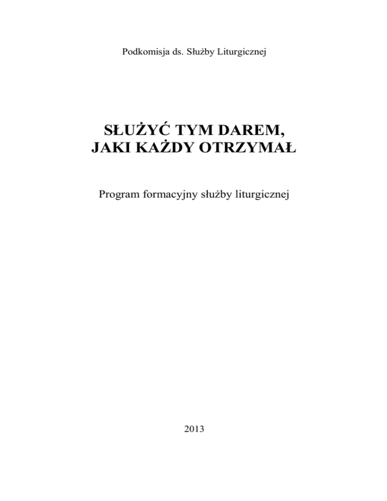 Podkomisja ds. Służby Liturgicznej SŁUŻYĆ TYM DAREM, JAKI KAŻDY OTRZYMAŁ Program formacyjny służby liturgicznej 2013 WSTĘP Dnia 27 listopada 2008 roku, podczas 346. Zebrania Plenarnego Konferencji Episkopatu Polski, biskupi przyjęli Dyrektorium duszpasterstwa służby liturgicznej. Nowy dokument, obowiązujący od tego czasu w polskich diecezjach i parafiach, „ma stanowić pomoc dla duszpasterzy i wiernych świeckich w lepszym rozumieniu funkcji liturgicznych oraz prowadzeniu formacji osób, które je spełniają” (Dyrektorium, nr 4). Formacja służby liturgicznej czerpie swoją inspirację z samej liturgii. Wprowadza w misterium zbawienia, dokonujące się pod osłoną znaków, a także uczy przeżywać liturgię jako źródło i szczyt całego życia chrześcijańskiego. Osoby posługujące w liturgii powinny być wzorem dla wszystkich, którzy służą Bogu i ludziom. To prawdziwi „słudzy Boga”. Pełnią Jego wolę przy ołtarzu i w całym swoim życiu. Dyrektorium DSL, mówiąc o formacji służby liturgicznej, najczęściej odwołuje się do słów z listu św. Piotra Apostoła: „Służcie sobie nawzajem tym darem, jaki każdy z was otrzymał” (1 P 4,10). Słowa te określają istotne elementy formacji posługujących w liturgii. Zmierza ona do okrywania powołania, osobistych talentów i służenia nimi braciom w codzienności życia, a także w liturgii, która jest szczytem i źródłem życia chrześcijańskiego. Fundamentem wieloletniego procesu wychowawczego jest słowo „służcie”. Wprowadza ono w całą głębię ewangelicznego rozumienia służby Bogu i ludziom. Jej najdoskonalszy wzór dał nam Chrystus, który nie przyszedł, aby Mu służono, lecz aby służyć (por. Mt 20,28). Wpatrujemy się również w Maryję, Służebnicę Pańską, która zawsze wiernie wypełniała wolę Boga. Jej „fiat” jest inspiracją i przykładem dla wszystkich członków Kościoła, a szczególnie dla tych, którzy siebie samych nazywają „sługami” („służba liturgiczna”). Kształtowanie postawy służby jest procesem trwającym przez całe życie. Ideał, dany nam przez Chrystusa, jest zaproszeniem do nieustannego przekraczania siebie. Dlatego każdy etap formacji zawiera w sobie wysiłek pogłębienia postawy służby, która w szczególny sposób wyraża się w pełnieniu woli Ojca. Spełniamy ją podejmując służbę w liturgii i czynimy to w każdej chwili naszego życia. Kolejny aspekt formacji służby liturgicznej zawarty jest w wezwaniu, aby służyć Bogu i ludziom tym darem, jaki każdy otrzymał. Wysiłek wychowawczy prowadzi do uznania, że posiadane talenty otrzymaliśmy od Boga, aby służyć nimi braciom. Szczytem tej służby jest spełnianie funkcji liturgicznych, a jej zwyczajną formą jest spełnianie na co dzień woli Ojca. 2 Te ogólne założenia formacji służby liturgicznej, opisane w Dyrektorium DSL, zostają rozwinięte w niniejszym opracowaniu. Jest to Program formacyjny przedstawiający bardziej szczegółowo tematy, które należy podjąć w poszczególnych etapach formacji oraz wymagania, jakie należy postawić członkom służby liturgicznej. Ta poprzeczka w miarę upływu lat rośnie. Im więcej człowiek umie i im bardziej dojrzale przeżywa swoją służbę, tym bardziej angażuje się w to, co robi dla Boga i ludzi. Zgodnie z programem przedstawionym w niniejszym opracowaniu zostaną przygotowane pomoce dla wszystkich grup formacyjnych. Będą to podręczniki dla prowadzących formację, a także zeszyty ćwiczeń dla uczestników spotkań. 3 METODA FORMACJI - MISTAGOGIA Zanim zostaną omówione kolejne etapy formacji służby liturgicznej, wydaje się konieczne zwrócenie uwagi na bardzo istotne elementy metody, którą w tej pracy wychowawczej należy stosować. Powinna to być w każdym przypadku mistagogia, a więc coś więcej niż nauczanie czy szkolenie. Mistagogia odsłania przed człowiekiem świat współpracy z Bogiem. Jest to metoda, której istotną cechą jest wprowadzenie w misterium. Chodzi przede wszystkim o misterium obecności i działania Chrystusa. Służba w liturgii jest udziałem w tym misterium, więc formacja służby liturgicznej musi mieć charakter odsłaniania przed kandydatami rzeczywistości, która kryje się poza zasłoną słów i znaków. Zaproszenie – Wezwanie – Powołanie Pierwszą prawdą, na którą należy zwrócić uwagę na każdym etapie formacji jest inicjatywa Boga, która poprzedza działanie człowieka. Słowa Chrystusa: „Nie wyście Mnie wybrali, ale Ja was wybrałem” (J 15,16), na swój sposób odnoszą się do wszystkich posługujących w Kościele. To jest Kościół Chrystusa, przez Niego utworzony, zrodzony z Jego męki i zmartwychwstania, napełniony przez Niego Duchem Świętym. „Wymiar powołaniowy jest istotną cechą duszpasterstwa Kościoła i należy do jego natury” – pisze bł. Jan Paweł II. „Wynika to z faktu, że powołanie w pewnym sensie określa nie tylko działanie Kościoła, ale przede wszystkim jego najgłębszą istotę. Sama nazwa Kościoła, Ecclesia, wskazuje na jego wewnętrzny charakter powołaniowy; Kościół jest bowiem naprawdę „zwołaniem”, społecznością ludzi wezwanych” (Adh. Pastores dabo vobis 34). Prawda ta określa pierwszy aspekt metody działania Kościoła, zwanej mistagogią. Jest to uwrażliwianie na głos Chrystusa, który zaprasza, wzywa, powołuje. Trzeba o tej prawdzie mówić od samego początku, a potem, w miarę dojrzewania, coraz uważniej wsłuchiwać się w ten głos i coraz bardziej radykalnie iść za nim. W odniesieniu do dzieci mówimy bardziej o zaproszeniu niż powołaniu, choć w tych pierwszych doświadczeniach człowieka jest już ukryty zalążek powołania. Potem to doświadczenie się wzmacnia staje się wyraźniejszym wezwaniem do pójścia za Panem. Wtedy świadomość powołania rośnie. Jednak zazwyczaj dopiero w wieku doro- 4 słym człowiek ma głębszą świadomoś