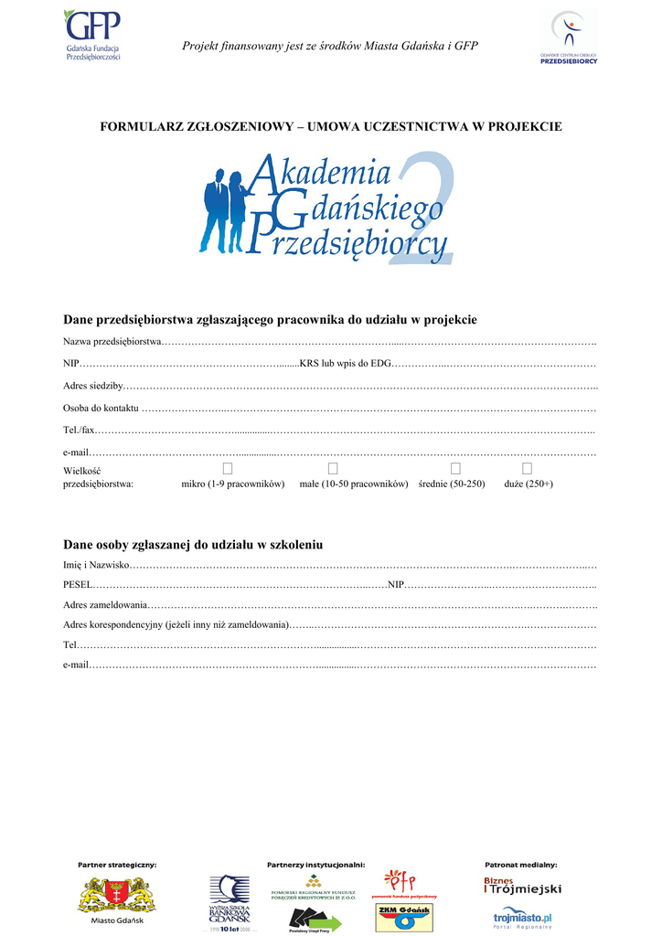 Projekt finansowany jest ze środków Miasta Gdańska i GFP FORMULARZ ZGŁOSZENIOWY – UMOWA UCZESTNICTWA W PROJEKCIE Dane przedsiębiorstwa zgłaszającego pracownika do udziału w projekcie Nazwa przedsiębiorstwa…………………………………………………………….....…………………………………………………. NIP……………………………………………………........KRS lub wpis do EDG……………..……………………………………… Adres siedziby…………………………………………………………………………………………………………………………….. Osoba do kontaktu ……………………..………………………………………………………………………………………………… Tel./fax……………………………………..............…………………………………………………………………………………….. e-mail………………………………………...............…………………………………………………………………………………… Wielkość przedsiębiorstwa: mikro (1-9 pracowników) małe (10-50 pracowników) średnie (50-250) duże (250+) Dane osoby zgłaszanej do udziału w szkoleniu Imię i Nazwisko…………………………………………………………………………………………………….…………………..… PESEL………………………………………………………………………..……NIP……………………...………………………….. Adres zameldowania………………………………………………………………………………………………….….……….………. Adres korespondencyjny (jeżeli inny niż zameldowania)……..……………………………………………………….………………… Tel………………………………………………………………................……………………………………………………………… e-mail……………………………………………………………...............……………………………………………………………… Tytuł szkolenia, do którego następuje zgłoszenie: Zakładanie własnej działalności gospodarczej Prowadzenie działalności gospodarczej w ramach Jednolitego Rynku Europejskiego w Wlk. Brytanii i Irlandii Prowadzenie działalności gospodarczej w ramach Jednolitego Rynku Europejskiego w Niemczech Pozyskiwanie środków z Unii Europejskiej na prowadzenie własnej działalności gospodarczej Finansowanie działalności MŚP Tworzenie biznesplanu Skuteczne negocjacje handlowe Marketing w małej i średniej firmie Rachunkowość i finanse w MŚP - I stopień Rachunkowość i finanse w MŚP - II stopień Prawo podatkowe Kurs komputerowy – MS Excel Kurs komputerowy MS PowerPoint Kurs komputerowy – Podstawy internetu w biznesie Kurs komputerowy – MS Access Kurs komputerowy – MS Word Data szkolenia…………………………………………………………………………………………………...…… Wyrażam zgodę na przetwarzanie (zbieranie, utrwalanie, przechowywanie, opracowywanie, zmienianie, udostępnianie i usuwanie) i wykorzystywanie oraz umieszczenie w bazie danych Gdańskiej Fundacji Przedsiębiorczości i Urzędu Miejskiego w Gdańsku, także w systemach informatycznych, moich danych osobowych w celu świadczenia usługi w zakresie informacji o narzędziach wspierania rozwoju przedsiębiorczości oraz w celach statystycznych. Podstawa prawna: Ustawa o ochronie danych osobowych z 29 sierpnia 1997 roku (tekst jednolity: Dz. U. z 2002 r. Nr 101, poz. 926 z późn. zm.) Oświadczam, że zapoznałem/-am się z regulaminem uczestnictwa w projekcie i zobowiązuje się do jego przestrzegania oraz zaspokojenia zobowiązań wynikających z faktu przystąpienia do projektu i naruszenia warunków uczestnictwa. Oświadczam, iż wszystkie dane zawarte w Formularzu oraz załączonych załącznikach są zgodne ze stanem prawnym i faktycznym. Jestem świadoma/y odpowiedzialności prawnej za zeznanie nieprawdy lub zatajenie prawdy. ……………………………………. PODPIS PRACODAWCY ZAŁĄCZNIK: 1. KRS/ZAŚWIADCZENIE Z EWIDENCJI DZIAŁALNOŚCI GOSPODARCZEJ ………………………………….. UCZESTNIK PROJEKTU Regulamin uczestnictwa w II edycji projektu „Akademia Gdańskiego Przedsiębiorcy” 1. Postanowienia ogólne Niniejszy dokument określa zasady oraz warunki uczestnictwa w II edycji projektu „Akademia Gdańskiego Przedsiębiorcy”. 2. Definicje 2.1 Projekt – oznacza II edycję projektu szkoleniowego pod nazwą „Akademia Gdańskiego Przedsiębiorcy” 2.2 Szkolenie – jedno ze szkoleń organizowanych w ramach II edycji projektu „Akademia Gdańskiego Przedsiębiorcy” 2.2 Organizator Projektu – Gdańska Fundacja Przedsiębiorczości 2.3 Beneficjent – osoba zgłoszona/ zgłaszająca się i zakwalifikowana do uczestnictwa w Projekcie 3. Terytorialny i czasowy zakres Projektu Projekt jest realizowany na terenie Gdańska w okresie od 10.04.2008 r. do 31.12.2008 r. 4. Cel Projektu – przygotowanie i przeprowadzenie cyklu szkoleń przeznaczonych dla gdańskich przedsiębiorców zarejestrowanych na terenie Miasta Gdańska, ich pracowników, oraz osób z Miasta Gdańska planujących podjąć własną działalność gospodarczą (także studentów i absolwentów gdańskich uczelni niezależnie od miejsca stałego zameldowania). 5. Zakres szkoleń – W ramach Projektu odbywać się będą szkolenia wg ustalonego przez Organizatora harmonogramu z następujących tematów: • Zakładanie własnej działalności gospodarczej • Prowadzenie działalności gospodarczej w Wlk. Brytanii i Irlandii w ramach Jednolitego Rynku Europejskiego • Prowadzenie działalności gospodarczej w Niemczech w ramach Jednolitego Rynku Europejskiego • Pozysk