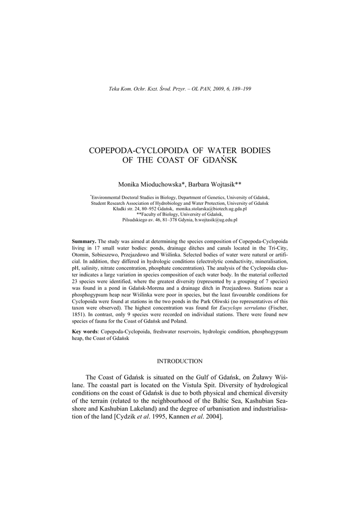 Teka Kom. Ochr. Kszt. Środ. Przyr. – OL PAN, 2009, 6, 189–199 COPEPODA-CYCLOPOIDA OF WATER BODIES OF THE COAST OF GDAŃSK Monika Mioduchowska*, Barbara Wojtasik** * Environmental Doctoral Studies in Biology, Department of Genetics, University of Gdańsk, Student Research Association of Hydrobiology and Water Protection, University of Gdańsk Kładki str. 24, 80–952 Gdańsk, [email protected] **Faculty of Biology, University of Gdańsk, Pilsudskiego av. 46, 81–378 Gdynia, [email protected] Summary. The study was aimed at determining the species composition of Copepoda-Cyclopoida living in 17 small water bodies: ponds, drainage ditches and canals located in the Tri-City, Otomin, Sobieszewo, Przejazdowo and Wiślinka. Selected bodies of water were natural or artificial. In addition, they differed in hydrologic conditions (electrolytic conductivity, mineralisation, pH, salinity, nitrate concentration, phosphate concentration). The analysis of the Cyclopoida cluster indicates a large variation in species composition of each water body. In the material collected 23 species were identified, where the greatest diversity (represented by a grouping of 7 species) was found in a pond in Gdańsk-Morena and a drainage ditch in Przejazdowo. Stations near a phosphogypsum heap near Wiślinka were poor in species, but the least favourable conditions for Cyclopoida were found at stations in the two ponds in the Park Oliwski (no representatives of this taxon were observed). The highest concentration was found for Eucyclops serrulatus (Fischer, 1851). In contrast, only 9 species were recorded on individual stations. There were found new species of fauna for the Coast of Gdańsk and Poland. Key words: Copepoda-Cyclopoida, freshwater reservoirs, hydrologic condition, phosphogypsum heap, the Coast of Gdańsk INTRODUCTION The Coast of Gdańsk is situated on the Gulf of Gdańsk, on Żuławy Wiślane. The coastal part is located on the Vistula Spit. Diversity of hydrological conditions on the coast of Gdańsk is due to both physical and chemical diversity of the terrain (related to the neighbourhood of the Baltic Sea, Kashubian Seashore and Kashubian Lakeland) and the degree of urbanisation and industrialisation of the land [Cydzik et al. 1995, Kannen et al. 2004]. 190 Monika Stolarska and Barbara Wojtasik One of the most important links in the food chain in aquatic ecosystems (salt- and freshwater environments) are Copepoda [Kajak 2001, Piasecki et al. 2004] which are also an important producer of detritus [Kajak 2001, Rybak and Błędzki 2005]. Due to their ubiquitous nature, rapid increase and rapid rate of metabolism, they play an important role in the functioning of the ecosystem. The various species of Copepoda, despite a relatively large degree of tolerance to changes in the values of physical and chemical parameters, can be found in optimal environmental conditions for a species. Thus Copepoda species composition may reflect the overall condition of water bodies [Błędzki 2008]. The purpose of this study was to present, against of the background of physical and chemical parameters and the type of water body, the composition of Copepoda species belonging to the Cyclopoida order [Rybak and Błędzki 2005]. The occurrence of meiobenthos species (among which Copepoda is ranked) depends on the nature of water quality and land immediately adjacent to the water body [Damodaran 1973, Kuczyńska-Kippen et al. 2004]. MATERIAL AND METHODS Study area The area covered by the survey, was the Tri-City (Gdańsk–Sopot–Gdynia) metropolitan area, as well as Otomin, Przejazdowo, Wiślinka and Sobieszewo. Samples were collected from 17 freshwater bodies, consisting of 2 stations of artificial water bodies, created for decoration purposes in Oliwski Park, 6 residential ponds and 1 small reservoir in the area of Gdańsk, 1 residential pond in Gdynia, 1 residential pond in Otomin, 3 drainage ditches – two near the phosphogypsum heaps in Wiślinka and one in Przejazdowo, 1 canal in Wiślinka and 2 small water bodies on the Isle of Sobieszewo (Fig. 1). Copepoda sampling and analytical methods Sampling for quantitative assessments (collected by means of a pipe with a diameter of 2.5 cm from the surface layer of bottom sediment to the depth of 10 cm) and qualitative assessments (with a volume of about 0.5 l collected by means of a manual scoop with a trawl with mesh of 42 μm) was made in the years 2007 (autumn) and 2008 (winter, spring, summer). Together with the sampling, water physical and chemical properties were examined – electrolytic conductivity, mineralisation, pH, salinity, nitrate concentration and phosphate concentration. Mature females were used for the evaluation of Copepoda-Cyclopida taxonomic content, the determination of which was carried out according to the following works: Rylov [1948], Dussart [1969], as well as Rybak and Błędzki [2005]. Nomenclature was given in accordance with the work of Rybak and Błędzki [2005]. COPEPODA-CYCLOPOIDA OF WATER BODIES OF THE COAST OF GDAŃSK... 191 Fig. 1. Research area The calculations covered the relative abundance (D), expressed as a percentage of the number of individuals of i-taxa to the number of all individuals in a given site, and the faunistic similarity coefficient of Bray-Curtis (present/absent), calculated using PRIMER v.5 software [Clarke and Gorley 2001] and presented in the form of cluster graph. RESULTS The tested water bodies had sandy and rocky ground (stations: 1, 2, 3, 4, 6, 10, 11, 15), sandy (stations: 7, 8, 16, 17), muddy (stations: 9, 12, 13, 14) and rocky (station 5), they were natural (stations: 2, 5, 7, 9, 10, 16) or artificial (stations: 1, 3, 4, 6, 8, 11, 12, 13, 14, 15, 17). The performed analysis of hydrological parameters (electrolytic conductivity, mineralisation, pH, salinity, nitrate concentration, phosphate concentration) provided data on the diversity of environmental conditions of the tested water bodies (Tab. 1). Monika