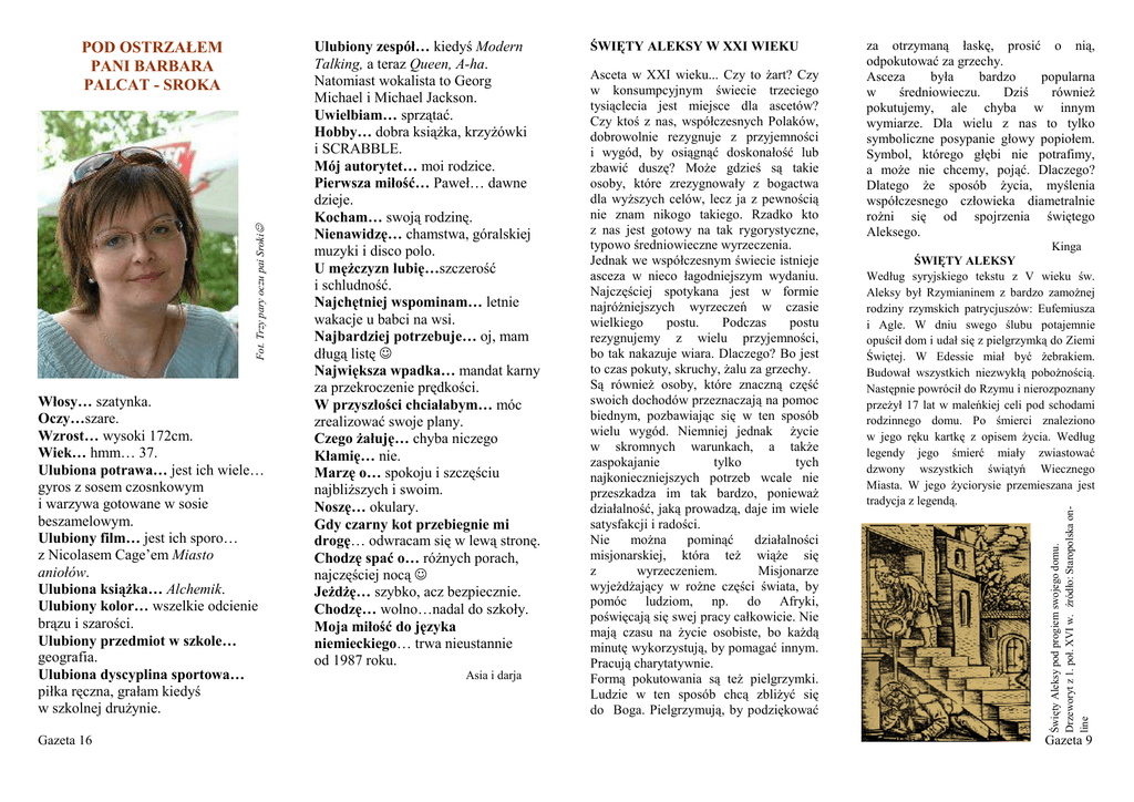 Włosy… szatynka. Oczy…szare. Wzrost… wysoki 172cm. Wiek… hmm… 37. Ulubiona potrawa… jest ich wiele… gyros z sosem czosnkowym i warzywa gotowane w sosie beszamelowym. Ulubiony film… jest ich sporo… z Nicolasem Cage’em Miasto aniołów. Ulubiona ksiąŜka… Alchemik. Ulubiony kolor… wszelkie odcienie brązu i szarości. Ulubiony przedmiot w szkole… geografia. Ulubiona dyscyplina sportowa… piłka ręczna, grałam kiedyś w szkolnej druŜynie. Gazeta 16 Ulubiony zespół… kiedyś Modern Talking, a teraz Queen, A-ha. Natomiast wokalista to Georg Michael i Michael Jackson. Uwielbiam… sprzątać. Hobby… dobra ksiąŜka, krzyŜówki i SCRABBLE. Mój autorytet… moi rodzice. Pierwsza miłość… Paweł… dawne dzieje. Kocham… swoją rodzinę. Nienawidzę… chamstwa, góralskiej muzyki i disco polo. U męŜczyzn lubię…szczerość i schludność. Najchętniej wspominam… letnie wakacje u babci na wsi. Najbardziej potrzebuje… oj, mam długą listę ☺ Największa wpadka… mandat karny za przekroczenie prędkości. W przyszłości chciałabym… móc zrealizować swoje plany. Czego Ŝałuję… chyba niczego Kłamię… nie. Marzę o… spokoju i szczęściu najbliŜszych i swoim. Noszę… okulary. Gdy czarny kot przebiegnie mi drogę… odwracam się w lewą stronę. Chodzę spać o… róŜnych porach, najczęściej nocą ☺ JeŜdŜę… szybko, acz bezpiecznie. Chodzę… wolno…nadal do szkoły. Moja miłość do języka niemieckiego… trwa nieustannie od 1987 roku. Asia i darja ŚWIĘTY ALEKSY W XXI WIEKU Asceta w XXI wieku... Czy to Ŝart? Czy w konsumpcyjnym świecie trzeciego tysiąclecia jest miejsce dla ascetów? Czy ktoś z nas, współczesnych Polaków, dobrowolnie rezygnuje z przyjemności i wygód, by osiągnąć doskonałość lub zbawić duszę? MoŜe gdzieś są takie osoby, które zrezygnowały z bogactwa dla wyŜszych celów, lecz ja z pewnością nie znam nikogo takiego. Rzadko kto z nas jest gotowy na tak rygorystyczne, typowo średniowieczne wyrzeczenia. Jednak we współczesnym świecie istnieje asceza w nieco łagodniejszym wydaniu. Najczęściej spotykana jest w formie najróŜniejszych wyrzeczeń w czasie wielkiego postu. Podczas postu rezygnujemy z wielu przyjemności, bo tak nakazuje wiara. Dlaczego? Bo jest to czas pokuty, skruchy, Ŝalu za grzechy. Są równieŜ osoby, które znaczną część swoich dochodów przeznaczają na pomoc biednym, pozbawiając się w ten sposób wielu wygód. Niemniej jednak Ŝycie w skromnych warunkach, a takŜe zaspokajanie tylko tych najkonieczniejszych potrzeb wcale nie przeszkadza im tak bardzo, poniewaŜ działalność, jaką prowadzą, daje im wiele satysfakcji i radości. Nie moŜna pominąć działalności misjonarskiej, która teŜ wiąŜe się z wyrzeczeniem. Misjonarze wyjeŜdŜający w roŜne części świata, by pomóc ludziom, np. do Afryki, poświęcają się swej pracy całkowicie. Nie mają czasu na Ŝycie osobiste, bo kaŜdą minutę wykorzystują, by pomagać innym. Pracują charytatywnie. Formą pokutowania są teŜ pielgrzymki. Ludzie w ten sposób chcą zbliŜyć się do Boga. Pielgrzymują, by podziękować za otrzymaną łaskę, prosić o nią, odpokutować za grzechy. Asceza była bardzo popularna w średniowieczu. Dziś równieŜ pokutujemy, ale chyba w innym wymiarze. Dla wielu z nas to tylko symboliczne posypanie głowy popiołem. Symbol, którego głębi nie potrafimy, a moŜe nie chcemy, pojąć. Dlaczego? Dlatego Ŝe sposób Ŝycia, myślenia współczesnego człowieka diametralnie roŜni się od spojrzenia świętego Aleksego. Kinga ŚWIĘTY ALEKSY Według syryjskiego tekstu z V wieku św. Aleksy był Rzymianinem z bardzo zamoŜnej rodziny rzymskich patrycjuszów: Eufemiusza i Agle. W dniu swego ślubu potajemnie opuścił dom i udał się z pielgrzymką do Ziemi Świętej. W Edessie miał być Ŝebrakiem. Budował wszystkich niezwykłą poboŜnością. Następnie powrócił do Rzymu i nierozpoznany przeŜył 17 lat w maleńkiej celi pod schodami rodzinnego domu. Po śmierci znaleziono w jego ręku kartkę z opisem Ŝycia. Według legendy jego śmierć miały zwiastować dzwony wszystkich świątyń Wiecznego Miasta. W jego Ŝyciorysie przemieszana jest tradycja z legendą. Święty Aleksy pod progiem swojego domu. Drzeworyt z 1. poł. XVI w. źródło: Staropolska online Fot. Trzy pary oczu pai Sroki☺ POD OSTRZAŁEM PANI BARBARA PALCAT - SROKA Gazeta 9