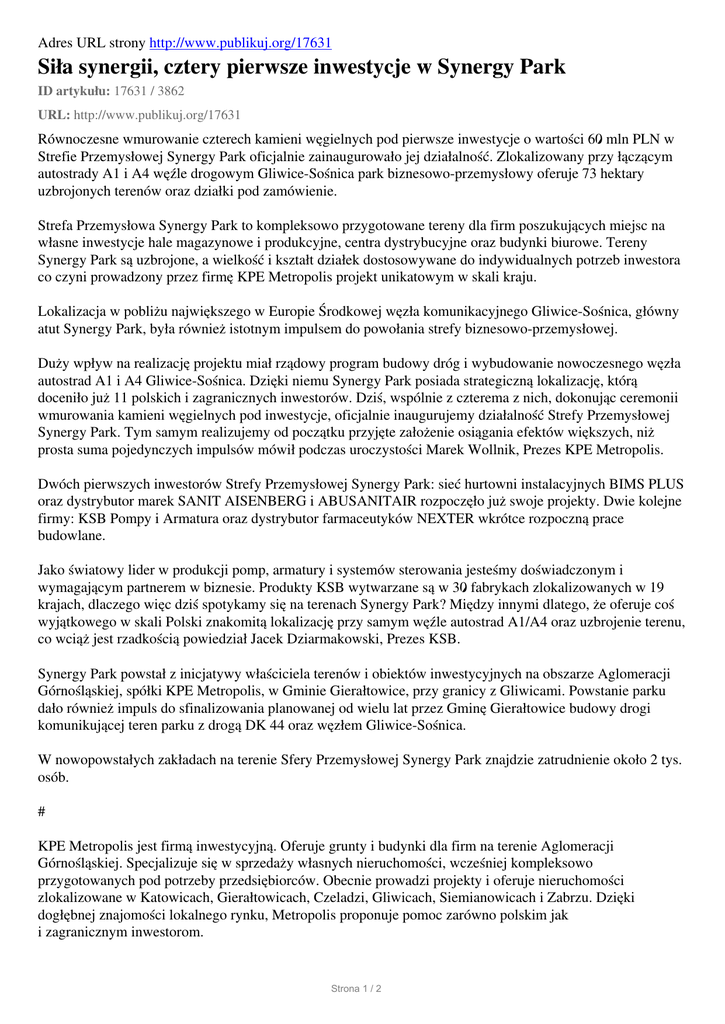 Adres URL strony http://www.publikuj.org/17631 Siła synergii, cztery pierwsze inwestycje w Synergy Park ID artykułu: 17631 / 3862 URL: http://www.publikuj.org/17631 Równoczesne wmurowanie czterech kamieni węgielnych pod pierwsze inwestycje o wartości 60 mln PLN w Strefie Przemysłowej Synergy Park oficjalnie zainaugurowało jej działalność. Zlokalizowany przy łączącym autostrady A1 i A4 węźle drogowym Gliwice-Sośnica park biznesowo-przemysłowy oferuje 73 hektary uzbrojonych terenów oraz działki pod zamówienie. Strefa Przemysłowa Synergy Park to kompleksowo przygotowane tereny dla firm poszukujących miejsc na własne inwestycje hale magazynowe i produkcyjne, centra dystrybucyjne oraz budynki biurowe. Tereny Synergy Park są uzbrojone, a wielkość i kształt działek dostosowywane do indywidualnych potrzeb inwestora co czyni prowadzony przez firmę KPE Metropolis projekt unikatowym w skali kraju. Lokalizacja w pobliżu największego w Europie Środkowej węzła komunikacyjnego Gliwice-Sośnica, główny atut Synergy Park, była również istotnym impulsem do powołania strefy biznesowo-przemysłowej. Duży wpływ na realizację projektu miał rządowy program budowy dróg i wybudowanie nowoczesnego węzła autostrad A1 i A4 Gliwice-Sośnica. Dzięki niemu Synergy Park posiada strategiczną lokalizację, którą doceniło już 11 polskich i zagranicznych inwestorów. Dziś, wspólnie z czterema z nich, dokonując ceremonii wmurowania kamieni węgielnych pod inwestycje, oficjalnie inaugurujemy działalność Strefy Przemysłowej Synergy Park. Tym samym realizujemy od początku przyjęte założenie osiągania efektów większych, niż prosta suma pojedynczych impulsów mówił podczas uroczystości Marek Wollnik, Prezes KPE Metropolis. Dwóch pierwszych inwestorów Strefy Przemysłowej Synergy Park: sieć hurtowni instalacyjnych BIMS PLUS oraz dystrybutor marek SANIT AISENBERG i ABUSANITAIR rozpoczęło już swoje projekty. Dwie kolejne firmy: KSB Pompy i Armatura oraz dystrybutor farmaceutyków NEXTER wkrótce rozpoczną prace budowlane. Jako światowy lider w produkcji pomp, armatury i systemów sterowania jesteśmy doświadczonym i wymagającym partnerem w biznesie. Produkty KSB wytwarzane są w 30 fabrykach zlokalizowanych w 19 krajach, dlaczego więc dziś spotykamy się na terenach Synergy Park? Między innymi dlatego, że oferuje coś wyjątkowego w skali Polski znakomitą lokalizację przy samym węźle autostrad A1/A4 oraz uzbrojenie terenu, co wciąż jest rzadkością powiedział Jacek Dziarmakowski, Prezes KSB. Synergy Park powstał z inicjatywy właściciela terenów i obiektów inwestycyjnych na obszarze Aglomeracji Górnośląskiej, spółki KPE Metropolis, w Gminie Gierałtowice, przy granicy z Gliwicami. Powstanie parku dało również impuls do sfinalizowania planowanej od wielu lat przez Gminę Gierałtowice budowy drogi komunikującej teren parku z drogą DK 44 oraz węzłem Gliwice-Sośnica. W nowopowstałych zakładach na terenie Sfery Przemysłowej Synergy Park znajdzie zatrudnienie około 2 tys. osób. # KPE Metropolis jest firmą inwestycyjną. Oferuje grunty i budynki dla firm na terenie Aglomeracji Górnośląskiej. Specjalizuje się w sprzedaży własnych nieruchomości, wcześniej kompleksowo przygotowanych pod potrzeby przedsiębiorców. Obecnie prowadzi projekty i oferuje nieruchomości zlokalizowane w Katowicach, Gierałtowicach, Czeladzi, Gliwicach, Siemianowicach i Zabrzu. Dzięki dogłębnej znajomości lokalnego rynku, Metropolis proponuje pomoc zarówno polskim jak i zagranicznym inwestorom. Strona 1 / 2 BIMS PLUS to sieć samoobsługowych hurtowni instalacyjnych kompleksowo obsługujących branże instalacyjną, sanitarną, grzewczą, klimatyzacyjną, wentylacyjną i sieci zewnętrznych. Firma posiada ponad 90 punktów handlowych w całej Polsce. Różnorodna oferta produktów BIMS PLUS pozwala na idealnie dopasowanie oferty do oczekiwań klienta zarówno pod względem wymogów technicznych jak i oczekiwań finansowych. W obecnym kształcie firma istnieje od blisko 15 lat. Export-Import E.M. Dobrzyński dystrybutor czołowych niemieckich marek armatury sanitarnej Sanit Eisenberg i Abusanitair działa na polskim rynku od blisko 20 lat. Do produktów dystrybuowanych przez firmę w Polsce należą m. in. podtynkowe elementy montażowe do przyborów sanitarnych, komory gospodarcze, deski sedesowe, armatura spłukująca i napełniająca, zestawy przelewowo-odpływowe do zlewozmywaków, zasyfonowania do umywalek, pisuarów, brodzików i wanien. KSB Pompy i Armatura to światowy lider w dziedzinie produkcji pomp, armatury i systemów sterowania. Produkty KSB wytwarzane są w 30 fabrykach zlokalizowanych w 19 krajach. Asortyment produkcji obejmuje bardzo szeroki zakres zastosowań poczynając od niewielkich pomp dla domów jednorodzinnych i biurowców, poprzez agregaty przeciwpożarowe, pompy dla wodociągów i kanalizacji oraz różnorodnych instalacji przemysłowych, a kończąc na ogromnych agregatach pompowych dla elektrowni atomowych. NEXTER jest Hurtownią Farmaceutyczną, działającą od 1992 roku. Podstawą działalności firmy jest dystrybucja szczepionek alergenowych firmy Allergopharma Joachim Ganzer KG. Firma ma ogromny wkład w rozpowszechnienie immunoterapii jako jedynej przyczynowej metody leczenia alergii. NEXTER jest również wyłącznym przedstawicielem i dystrybutorem firmy OMEGA PLC, jednej z najszybciej rozwijających się firm na rynku diagnostyki laboratoryjnej. Zapraszamy do odwiedzenia serwisów: www.synergypark.pl www.metropolis.pl. Aktywacja: 28/09/11 18:21, odsłony: 648 Strona 2 / 2