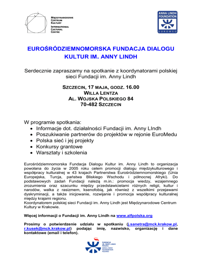 EUROŚRÓDZIEMNOMORSKA FUNDACJA DIALOGU KULTUR IM. ANNY LINDH Serdecznie zapraszamy na spotkanie z koordynatorami polskiej sieci Fundacji im. Anny Lindh SZCZECIN, 17 MAJA, GODZ. 16.00 WILLA LENTZA AL. WOJSKA POLSKIEGO 84 70-482 SZCZECIN W programie spotkania: Informacje dot. działalności Fundacji im. Anny LIndh Poszukiwanie partnerów do projektów w rejonie EuroMedu Polska sieć i jej projekty Konkursy grantowe Warsztaty i szkolenia Eurośródziemnomorska Fundacja Dialogu Kultur im. Anny Lindh to organizacja powołana do życia w 2005 roku celem promocji dialogu międzykulturowego i współpracy kulturalnej w 43 krajach Partnerstwa Eurośródziemnomorskiego (Unia Europejska, Turcja, państwa Bliskiego Wschodu i północnej Afryki). Do podstawowych zadań Fundacji należą m.in.: promocja wiedzy, wzajemnego zrozumienia oraz szacunku między przedstawicielami różnych religii, kultur i narodów, walka z rasizmem, ksenofobią, jak również z wszelkimi przejawami dyskryminacji, a także inicjowanie, rozwijanie i promocja współpracy kulturalnej między krajami regionu. Koordynatorem polskiej sieci Fundacji im. Anny Lindh jest Międzynarodowe Centrum Kultury w Krakowie. Więcej informacji o Fundacji im. Anny Lindh na www.alfpolska.org Prosimy o potwierdzenie udziału w spotkaniu ([email protected], [email protected]) podając imię, nazwisko, organizację i dane kontaktowe (email i telefon).