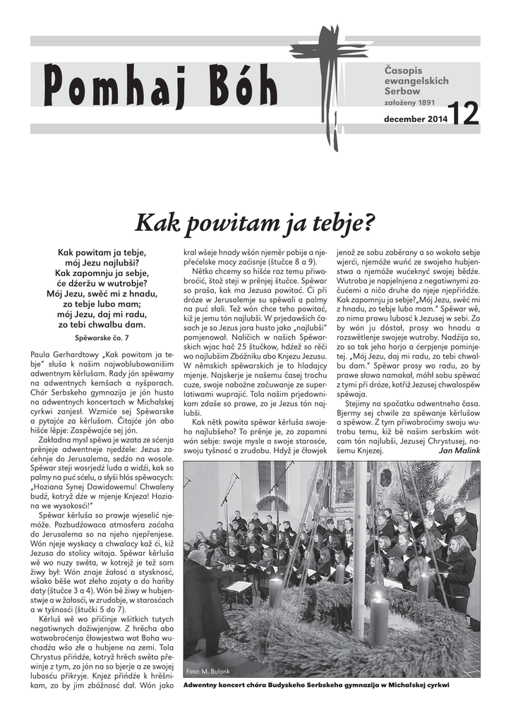 Časopis ewangelskich Serbow załoženy 1891 12 december 2014 Kak powitam ja tebje? Kak powitam ja tebje, mój Jezu najlubši? Kak zapomnju ja sebje, će dźeržu w wutrobje? Mój Jezu, swěć mi z hnadu, zo tebje lubo mam; mój Jezu, daj mi radu, zo tebi chwalbu dam. Spěwarske čo. 7 Paula Gerhardtowy „Kak powitam ja tebje“ słuša k našim najwoblubowanišim adwentnym kěrlušam. Rady jón spěwamy na adwentnych kemšach a nyšporach. Chór Serbskeho gymnazija je jón husto na adwentnych koncertach w Michałskej cyrkwi zanjesł. Wzmiće sej Spěwarske a pytajće za kěrlušom. Čitajće jón abo hišće lěpje: Zaspěwajće sej jón. Zakładna mysl spěwa je wzata ze sćenja prěnjeje adwentneje njedźele: Jezus zaćehnje do Jerusalema, sedźo na wosole. Spěwar steji wosrjedź luda a widźi, kak so palmy na puć sćelu, a słyši hłós spěwacych: „Hoziana Synej Dawidowemu! Chwaleny budź, kotryž dźe w mjenje Knjeza! Hoziana we wysokosći!“ Spěwar kěrluša so prawje wjeselić njemóže. Pozbudźowaca atmosfera zaćaha do Jerusalema so na njeho njepřenjese. Wón njeje wyskacy a chwalacy kaž ći, kiž Jezusa do stolicy witaja. Spěwar kěrluša wě wo nuzy swěta, w kotrejž je tež sam žiwy był: Wón znaje žałosć a stysknosć, wšako běše wot złeho zajaty a do hańby daty (štučce 3 a 4). Wón bě žiwy w hubjenstwje a w žałosći, w zrudobje, w starosćach a w tyšnosći (štučki 5 do 7). Kěrluš wě wo přičinje wšitkich tutych negatiwnych dožiwjenjow. Z hrěcha abo wotwobroćenja čłowjestwa wot Boha wuchadźa wšo złe a hubjene na zemi. Tola Chrystus přińdźe, kotryž hrěch swěta přewinje z tym, zo jón na so bjerje a ze swojej lubosću přikryje. Knjez přińdźe k hrěšnikam, zo by jim zbóžnosć dał. Wón jako kral wšeje hnady wšón njeměr pobije a njepřećelske mocy zaćisnje (štučce 8 a 9). Nětko chcemy so hišće raz temu přiwobroćić, štož steji w prěnjej štučce. Spěwar so praša, kak ma Jezusa powitać. Ći při dróze w Jerusalemje su spěwali a palmy na puć słali. Tež wón chce teho powitać, kiž je jemu tón najlubši. W prjedawšich časach je so Jezus jara husto jako „najlubši“ pomjenował. Naličich w našich Spěwarskich wjac hač 25 štučkow, hdźež so rěči wo najlubšim Zbóžniku abo Knjezu Jezusu. W němskich spěwarskich je to hladajcy mjenje. Najskerje je našemu časej trochu cuze, swoje nabožne začuwanje ze superlatiwami wuprajić. Tola našim prjedownikam zdaše so prawe, zo je Jezus tón najlubši. Kak nětk powita spěwar kěrluša swojeho najlubšeho? To prěnje je, zo zapomni wón sebje: swoje mysle a swoje starosće, swoju tyšnosć a zrudobu. Hdyž je čłowjek jenož ze sobu zaběrany a so wokoło sebje wjerći, njemóže wuńć ze swojeho hubjenstwa a njemóže wućeknyć swojej bědźe. Wutroba je napjelnjena z negatiwnymi začućemi a ničo druhe do njeje njepřińdźe. Kak zapomnju ja sebje?„Mój Jezu, swěć mi z hnadu, zo tebje lubo mam.“ Spěwar wě, zo nima prawu lubosć k Jezusej w sebi. Zo by wón ju dóstał, prosy wo hnadu a rozswětlenje swojeje wutroby. Nadźija so, zo so tak jeho horjo a ćerpjenje pominjetej. „Mój Jezu, daj mi radu, zo tebi chwalbu dam.“ Spěwar prosy wo radu, zo by prawe słowa namakał, móhł sobu spěwać z tymi při dróze, kotřiž Jezusej chwalospěw spěwaja. Stejimy na spočatku adwentneho časa. Bjermy sej chwile za spěwanje kěrlušow a spěwow. Z tym přiwobroćimy swoju wutrobu temu, kiž bě našim serbskim wótcam tón najlubši, Jezusej Chrystusej, našemu Knjezej. Jan Malink Foto: M. Bulank Adwentny koncert chóra Budyskeho Serbskeho gymnazija w Michałskej cyrkwi 2 december 2014 Legenda wo božonócnym zelu Jako zhonichu pastyrjo w Božej nocy, zo běše so Jezus narodźił, prajachu sej mjez sobu: „Pójće, póńdźemy do Betlehema! Pohladajmy na Syna Božeho, kiž je so dźensa narodźił!“ Kóždy z pastyrjow wza dar sobu: měd a butru, karan mloka, jehnjacy kožuch a wołmu. Hwězda na njebju pokaza jim puć. Pastyrjam pomhaše při dźěle tež hólčec. Wón chcyše tež do Betlehema, zo by dźěćatko widźał, ale njeměješe žadyn dar kaž pastyrjo. Pytaše kwětku, kotruž by móhł wotšćipnyć a sobu wzać. Ale žanu jeničku njenamaka. Hólc běše tak zrudny, zo započa płakać. Sylzy kapachu na twjerdu zemju. Tydźenje dołho njeběše so dešćowało. Lědma zo běchu sylzy zemju tróšku namočili, zeschadźachu kwětki, kotrež njesechu kćenja kaž róže. Pjeć kćenjowych łopjenow, běłe a něžne, stejachu kaž keluch, z kotrehož swěćeše so króna z próškowych łopjenow. Zbožowny a połny wjesela zešćipa hólčec kwětki a donjese je Božemu dźěćatku. Z tuteho časa kćěje tuta kwětka kóžde lěto wokoło hód. Mjenuje so božonócne zelo. Gabriela Gruhlowa Pomhaj Bóh Žohnowany adwentny a hodowny čas přeje wšitkim čitarjam, dopisowarjam a dobroćelam redaktorka Pomhaj Bóh Adwentnička na Michałskej Na druhej njedźeli adwenta, 7. decembra, swjeća so serbske kemše w Budyšinje w Michałskej cyrkwi popołdnju w 14 hodź. Po tym zhromadźi so wosada na farje k swačinje z bjesadu a spěwanjom. Koncert w Michałskej cyrkwi Rys.: Florian Gruhl Wo Kašubach w Serbskim muzeju Bliži so hodowny čas a něchtóžkuli z nas so w adwenće rady na dyrdomdejstwa dźěćatstwa dopomina. Najrjeńše zdadźa so nałožki, kotrež su nas z napjatosću napjelnili a so pod hołym njebjom wotměli. Po někotrych lětach drje sy jako mjeztym ani nic wjac tak młody čłowjek kusk zwonka domizny pobył a widźiš we wšelkich kónčinach swěta hustodosć podobnosće, ale tež rozdźěle we wašnjach a nałožkach. Zajimawe su wašnja w pomórskej kónčinje Kašubow, hdźež namakaja so w přirunanju z Łužicu podobnosće kaž tež swojoraznosće. To so hižo w někotrych pomjenowanjach pokazuje. Tak mjenuja Kašubojo hody „Gòdë“, mjeztym zo so pólsce wo „Bożym Narodzeniu“ r