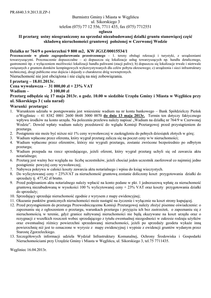 PR.6840.3.9.2013.II.ZP-1 Burmistrz Gminy i Miasta w Węglińcu ul. Sikorskiego 3 telefon (075) 77 12 556, 7711 435, fax (075) 7712551 ogłasza II przetarg ustny nieograniczony na sprzedaŜ niezabudowanej działki gruntu stanowiącej część składową nieruchomości gruntowej połoŜonej w Czerwonej Wodzie Działka nr 764/9 o powierzchni 9 800 m2, KW JG1Z/00015534/1 Przeznaczenie w planie zagospodarowania przestrzennego – 1. tereny obsługi rekreacji i turystyki, z urządzeniami towarzyszącymi. Przeznaczenie dopuszczalne – a) dopuszcza się lokalizacje usług towarzyszących np. handlu detalicznego, gastronomii itp. z wyłączeniem moŜliwości lokalizacji handlu paliwami (stacji paliw); b) dopuszcza się lokalizacje trwale i nietrwale związanych z gruntem domków kempingowych wykorzystywanych dla celów pobytu okresowego; c) urządzenia i sieci infrastruktury technicznej, drogi publiczne oraz dojścia i dojazdy o charakterze dróg wewnętrznych. Nieruchomość nie jest obciąŜona i nie ciąŜą na niej zobowiązania. I przetarg – 18.01.2013r. Cena wywoławcza – 31 000,00 zł + 23% VAT Wadium – 3 100,00 zł Przetarg odbędzie się 17 maja 2013r. o godz. 10.00 w siedzibie Urzędu Gminy i Miasta w Węglińcu przy ul. Sikorskiego 3 ( sala narad) Warunki przetargu: 1. Warunkiem udziału w postępowaniu jest wniesienie wadium na nr konta bankowego – Bank Spółdzielczy Pieńsk o/Węgliniec – 41 8382 0001 2600 0648 3000 0070 do dnia 13 maja 2013r. Termin ten dotyczy faktycznego wpływu środków na konto urzędu. Na poleceniu przelewu naleŜy napisać „Wadium na działkę nr 764/9 w Czerwonej Wodzie”. Dowód wpłaty wadium naleŜy przedstawić do wglądu Komisji Przetargowej przed przystąpieniem do przetargu. 2. Postąpienie nie moŜe być niŜsze niŜ 1% ceny wywoławczej w zaokrągleniu do pełnych dziesiątek złotych w górę; 3. Wadium wpłacone przez oferenta, który wygrał przetarg zalicza się na poczet ceny w/w nieruchomości; 4. Wadium wpłacone przez oferentów, którzy nie wygrali przetargu, zostanie zwrócone bezpośrednio po odbytym przetargu; 5. Wadium przepada na rzecz sprzedającego, jeŜeli oferent, który wygrał przetarg uchyli się od zawarcia aktu notarialnego; 6. Przetarg jest waŜny bez względu na liczbę uczestników, jeŜeli chociaŜ jeden uczestnik zaoferował co najmniej jedno postąpienie powyŜej ceny wywoławczej; 7. Nabywca pokrywa w całości koszty zawarcia aktu notarialnego i wpisu do ksiąg wieczystych. 8. Do wylicytowanej ceny + 23%VAT za nieruchomość gruntową zostanie doliczony koszt przygotowania działki do sprzedaŜy tj. 477,42 zł brutto. 9. Przed podpisaniem aktu notarialnego naleŜy wpłacić na konto podane w pkt. 1 jednorazową wpłatę za nieruchomość gruntową niezabudowaną w wysokości 100 % wylicytowanej ceny + 23% VAT oraz koszty przygotowania działki do sprzedaŜy; 10. Sprzedający sprzedaje nieruchomość zgodnie z wyrysem z mapy ewidencyjnej; 11. Okazanie punktów granicznych nieruchomości moŜe nastąpić na Ŝyczenie i wyłącznie na koszt strony kupującej. 12. Przed przystąpieniem do przetargu Przewodniczącemu Komisji Przetargowej naleŜy złoŜyć pisemne oświadczenie: o zapoznaniu się z ogłoszeniem o przetargu, warunkach przetargu i przyjęciu ich bez zastrzeŜeń, o zapoznaniu się z nieruchomością w terenie, gdyŜ granice nabywanej nieruchomości nie będą okazywane na koszt urzędu oraz o rezygnacji z wszelkich roszczeń wobec sprzedającego z tytułu ewentualnej niezgodności w zakresie rodzaju uŜytków oraz ewentualnej róŜnicy powierzchni sprzedawanej nieruchomości, jeŜeli po sprzedaŜy geodeta wykaŜe inną powierzchnię niŜ jest to oznaczone w wyrysie z mapy ewidencyjnej i wypisie z ewidencji gruntów wydanym przez Starostę Zgorzeleckiego. 13. Szczegółowych informacji udziela Wydział Infrastruktury Komunalnej, Ochrony Środowiska i Gospodarki Nieruchomościami przy Urzędzie Gminy i Miasta w Węglińcu, ul. Sikorskiego 3, tel.75 7711435. Węgliniec 16.04.2013r.