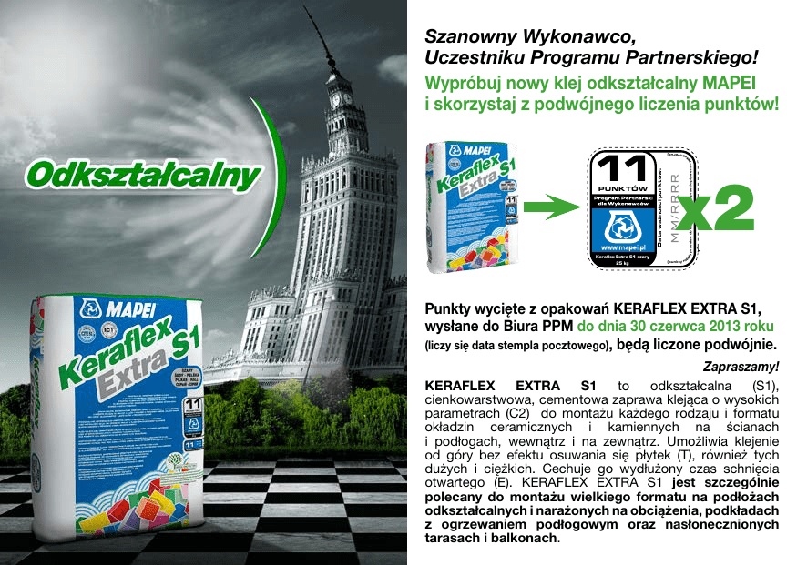 Szanowny Wykonawco, Uczestniku Programu Partnerskiego! Wypróbuj nowy klej odkształcalny MAPEI i skorzystaj z podwójnego liczenia punktów! Data ważności punktów: eż y przesłać do Biura Programu przed upływem – pa Keraflex Extra S1 szary 25 kg z nadruk) PUNKTÓW tr 11 x2 l (punkty na Punkty wycięte z opakowań KERAFLEX EXTRA S1, wysłane do Biura PPM do dnia 30 czerwca 2013 roku (liczy się data stempla pocztowego), będą liczone podwójnie. Zapraszamy! KERAFLEX EXTRA S1 to odkształcalna (S1), cienkowarstwowa, cementowa zaprawa klejąca o wysokich parametrach (C2) do montażu każdego rodzaju i formatu okładzin ceramicznych i kamiennych na ścianach i podłogach, wewnątrz i na zewnątrz. Umożliwia klejenie od góry bez efektu osuwania się płytek (T), również tych dużych i ciężkich. Cechuje go wydłużony czas schnięcia otwartego (E). KERAFLEX EXTRA S1 jest szczególnie polecany do montażu wielkiego formatu na podłożach odkształcalnych i narażonych na obciążenia, podkładach z ogrzewaniem podłogowym oraz nasłonecznionych tarasach i balkonach.