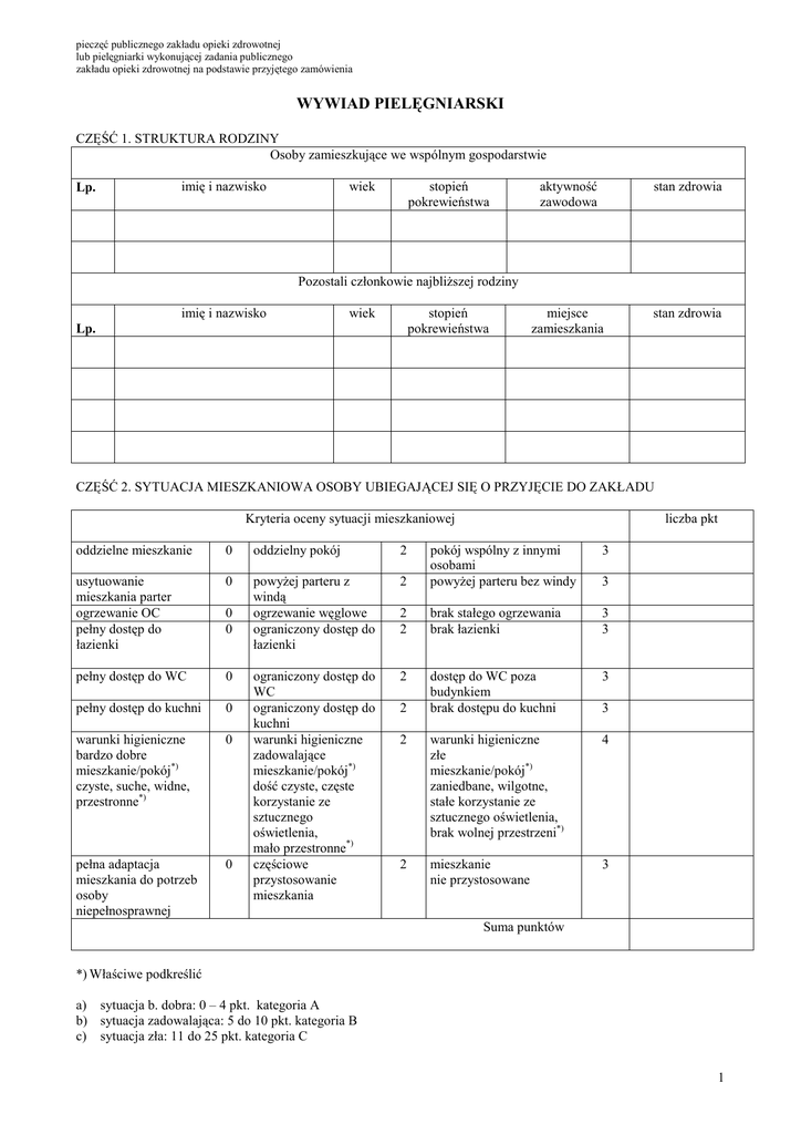 pieczęć publicznego zakładu opieki zdrowotnej lub pielęgniarki wykonującej zadania publicznego zakładu opieki zdrowotnej na podstawie przyjętego zamówienia WYWIAD PIELĘGNIARSKI CZĘŚĆ 1. STRUKTURA RODZINY Osoby zamieszkujące we wspólnym gospodarstwie Lp. imię i nazwisko wiek stopień pokrewieństwa aktywność zawodowa stan zdrowia miejsce zamieszkania stan zdrowia Pozostali członkowie najbliższej rodziny imię i nazwisko wiek stopień pokrewieństwa Lp. CZĘŚĆ 2. SYTUACJA MIESZKANIOWA OSOBY UBIEGAJĄCEJ SIĘ O PRZYJĘCIE DO ZAKŁADU Kryteria oceny sytuacji mieszkaniowej oddzielne mieszkanie 0 oddzielny pokój 2 usytuowanie mieszkania parter ogrzewanie OC pełny dostęp do łazienki 0 powyżej parteru z windą ogrzewanie węglowe ograniczony dostęp do łazienki pełny dostęp do WC 0 pełny dostęp do kuchni 0 warunki higieniczne bardzo dobre mieszkanie/pokój*) czyste, suche, widne, przestronne*) 0 pełna adaptacja mieszkania do potrzeb osoby niepełnosprawnej 0 0 0 ograniczony dostęp do WC ograniczony dostęp do kuchni warunki higieniczne zadowalające mieszkanie/pokój*) dość czyste, częste korzystanie ze sztucznego oświetlenia, mało przestronne*) częściowe przystosowanie mieszkania liczba pkt 2 pokój wspólny z innymi osobami powyżej parteru bez windy 3 2 2 brak stałego ogrzewania brak łazienki 3 3 2 dostęp do WC poza budynkiem brak dostępu do kuchni 3 2 3 3 2 warunki higieniczne złe mieszkanie/pokój*) zaniedbane, wilgotne, stałe korzystanie ze sztucznego oświetlenia, brak wolnej przestrzeni*) 4 2 mieszkanie nie przystosowane 3 Suma punktów *) Właściwe podkreślić a) sytuacja b. dobra: 0 – 4 pkt. kategoria A b) sytuacja zadowalająca: 5 do 10 pkt. kategoria B c) sytuacja zła: 11 do 25 pkt. kategoria C 1 CZĘŚĆ 3. OCENA WYDOLNOŚCI OPIEKUŃCZEJ RODZINY/ŚRODOWISKA Zakres sprawowanej opieki Kategoria*) Pełna wydolność opiekuńcza rodziny A Niepełna wydolność opiekuńcza rodziny (zaangażowanie innych osób) Brak opieki ze strony rodziny - pełna zależność od osób obcych B C *) Właściwe podkreślić CZĘŚĆ 4. ROZPOZNANIE PROBLEMÓW PIELĘGNACYJNYCH ............................................................................................................................................................................... ............................................................................................................................................................................... ............................................................................................................................................................................... ............................................................................................................................................................................... ............................................................................................................................................................................... ............................................................................................................................................................................... Zakres wymaganej opieki Kategoria*) Nie wymaga ciągłej opieki pielęgniarskiej Wymaga ciągłej opieki pielęgniarskiej Wymaga kompleksowej intensywnej opieki pielęgniarskiej A B C *) Właściwe podkreślić ŁĄCZNIE UZYSKANE KATEGORIE W CZĘŚCIACH 2 – 4 ........................................................................ (podpis pielęgniarki przeprowadzającej wywiad) ..................................................... (data) Oświadczenie osoby ubiegającej się o skierowanie do zakładu albo jej przedstawiciela ustawowego *) Wyrażam /nie wyrażam*) zgody na gromadzenie i przechowywanie danych osobowych dotyczących osoby ubiegającej się o skierowanie do zakładu. ....................................................................... (data i podpis osoby kierowanej do zakładu lub jej przedstawiciela ustawowego*)) *) Niepotrzebne skreślić 2