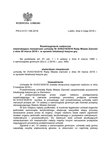 WOJEWODA LUBELSKI PN-II.4131.158.2016 Lublin, dnia 4 maja 2016 r. Rozstrzygnięcie nadzorcze stwierdzające nieważność uchwały Nr XVII/218/2016 Rady Miasta Zamość z dnia 30 marca 2016 r. w sprawie lokalizacji kasyna gry. Na podstawie art. 91 ust. 1 i 3 ustawy z dnia 8 marca 1990 r. o samorządzie gminnym (Dz.U. z 2016 r., poz. 446) stwierdzam nieważność uchwały Nr XVII/218/2016 Rady Miasta Zamość z dnia 30 marca 2016 r. w sprawie lokalizacji kasyna gry. Uzasadnienie Uchwała Nr XVII/218/2016 została doręczona organowi nadzoru w dniu 5 kwietnia 2016 r. Przedmiotową uchwałą Rada Miasta Zamość zaopiniowała pozytywnie lokalizację kasyna gry w Zamościu. Z przeprowadzonego przez organ nadzoru postępowania wyjaśniającego w zakresie przebiegu procedury podjęcia uchwały Nr XVII/218/2016 wynika, iż procedując nad przedmiotową uchwałą radni naruszyli przepis art. 14 ustawy o samorządzie gminnym jak również przepisy obowiązującego Statutu Miasta Zamość. W tym miejscu należy podkreślić, iż kontrola legalności uchwał organów jednostek samorządu terytorialnego obejmuje wszystkie etapy procesu stosowania prawa przez te organy. Organ nadzoru bada zatem zgodność działań organu jednostki samorządu terytorialnego z przepisami ustrojowymi, materialnymi i proceduralnymi. Do istotnych wad uchwał skutkujących stwierdzeniem ich nieważności należy między innymi naruszenie przepisów regulujących procedurę podejmowania uchwał. Zgodnie z art. 14 ustawy o samorządzie gminnym, uchwały rady gminy zapadają zwykłą większością głosów, w obecności co najmniej połowy 2 ustawowego składu rady, w głosowaniu jawnym, chyba że ustawa stanowi inaczej. Głosowanie uchwały jest czynnością, która ma rozstrzygnąć merytorycznie o losie projektu: czy zostanie on przyjęty (tzn. uzyska wymaganą większość głosów i stanie się uchwałą), czy też z uwagi na nieuzyskanie wymaganej większości głosów zostanie oddalony. Przepis art. 14 ustawy o samorządzie gminnym ustanawia podstawowe warunki ważności uchwał, a tym samym rozstrzygnięć rady w podejmowanych przez nią sprawach. Przepis ten ma charakter bezwzględnie obowiązujący, co oznacza, że poza odmiennymi przypadkami określonymi ustawowo – uchwały tego organu gminy podjęte według innego trybu są sprzeczne z prawem. Przechodząc do oceny procedury podjęcia uchwały Nr XVII/218/2016 należy podkreślić, że o ustroju gminy stanowi jej statut (art. 3 ust. 1 ustawy o samorządzie gminnym), który jest aktem prawa miejscowego, podlegającym ogłoszeniu w wojewódzkim dzienniku urzędowym (art. 40 ust. 2 pkt 1 w zw. z art. 22 ust. 2 ustawy). Statut gminy określa organizację wewnętrzną oraz tryb pracy organów gminy (art. 22 ust. 1 ustawy). Do tego zakresu należą przepisy normujące przebieg posiedzeń rady gminy, w tym dopuszczalność i zasady zarządzania przerw w obradach rady. Statut Miasta Zamość, przyjęty uchwałą Nr XVIII/186/2012 Rady Miasta Zamość z dnia 26 kwietnia 2012 r., precyzyjnie reguluje kwestię sposobu głosowania radnych Rady Miasta Zamość. Jak stanowi § 24 ust. 3 załącznika Nr 2 do Statutu Miasta Zamość stanowiącego Regulamin Rady Miasta Zamość, głosowanie jawne odbywa się poprzez podniesienie ręki oraz przyciśnięcie odpowiedniego przycisku przy pulpicie elektronicznego systemu do głosowania. W przypadku, gdy głosowanie przy pomocy elektronicznego systemu do głosowania jest niemożliwe, głosowanie jawne odbywa się wyłącznie poprzez podniesienie ręki. Głosowanie takie nie ma charakteru imiennego. Głosowanie jawne przeprowadza Przewodniczący obrad (ust. 4). Wyniki głosowania jawnego ogłasza Przewodniczący obrad (ust. 5). Jak wynika z projektu protokołu z sesji Rady Miasta Zamość, która odbyła się w dniu 30 marca 2016 r. na ustawowy skład 23 radnych Rady Miasta Zamość obecnych było 22 radnych. Przewodniczący Rady Miasta Zamość poddał pod głosowanie projekt uchwały w sprawie lokalizacji kasyna gry w Zamościu. Należy zaznaczyć, iż w związku z awarią elektronicznego systemu do głosowania głosowanie odbywało się wyłącznie poprzez podniesienie ręki. W głosowaniu nad uchwałą wzięło udział 22 radnych. W projekcie protokołu zapisano, iż 12 radnych było za przyjęciem uchwały, przeciwko głosowało 10 radnych, nie było głosów wstrzymujących się. Z powyższego wynika, iż uchwała została przyjęta 12 głosami „za” przy 10 głosach „przeciw”. 3 Głosowanie odbyło się w sposób jawny, a więc taki, który umożliwiał pozostałym członkom organu (a także osobom trzecim, jeżeli były świadkami tego aktu) poznanie treści głosu radnych obecnych na sesji. Zgodnie z powołanym na wstępie art. 14 ustawy o samorządzie gminnym uchwały zapadają zwykłą większością głosów w obecności co najmniej połowy ustawowego składu rady, w głosowaniu jawnym, chyba że ustawa stanowi inaczej. Z omawianego przepisu wynika, iż uchwała zostaje podjęta w chwili, w której uzyska odpowiednią liczbę głosów oddanych w obecności wymaganej liczby radnych. Zwykła większość głosów w przypadku, gdy treść wniosku stanowi opcja dychotomiczna (biegunowa), a więc taka, przy której - pomijając możliwość wstrzymania się od zajęcia stanowiska (wstrzymania się od głosu) - należy się opowiedzieć "za wnioskiem" lub "przeciw niemu", oznacza przewagę głosów oddanych "za wnioskiem" nad głosami oddanymi "przeciw wnioskowi". Głosów osób wstrzymujących się od zajęcia stanowiska nie bierze się pod uwagę. Po dokonaniu analizy nagrania przebiegu sesji Rady Miasta Zamość utrwalonego na elektronicznym nośniku informacji (płyta dvd), należy stwierdzić, iż w nieprawidłowy sposób policzone zostały głosy oddane za projektem uchwały Nr XVII/218/2016. W ocenie organu nadzoru przebieg głosowania nad projektem uchwały w sprawie lokalizacji kasyna gry oraz sposób liczenia g