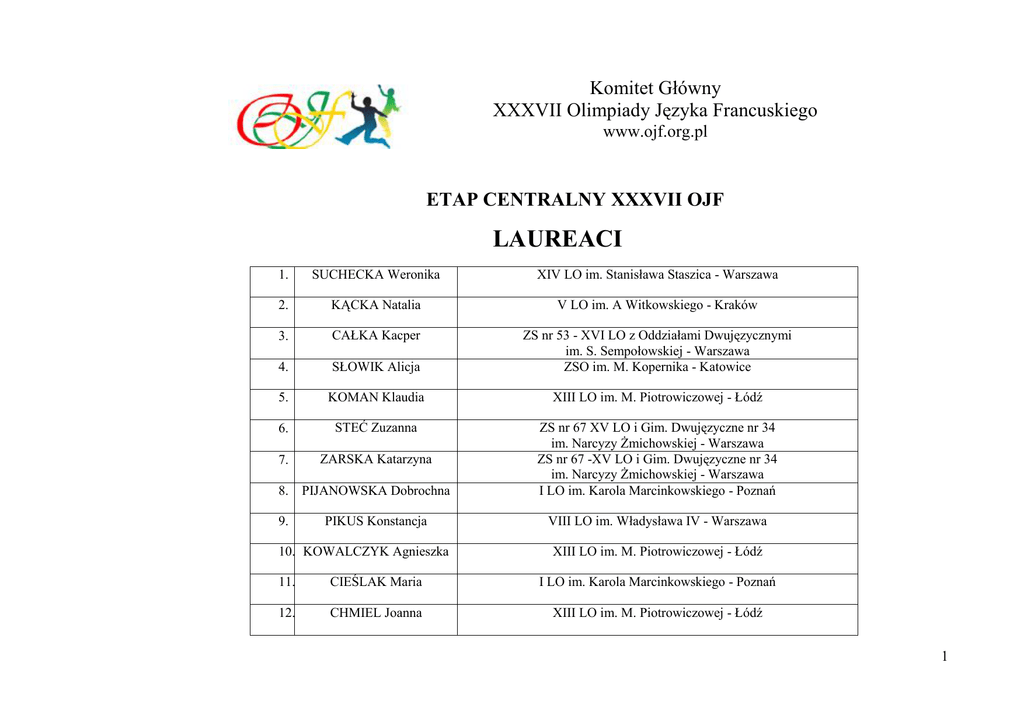 Komitet Główny XXXVII Olimpiady Języka Francuskiego www.ojf.org.pl ETAP CENTRALNY XXXVII OJF LAUREACI 1. SUCHECKA Weronika XIV LO im. Stanisława Staszica - Warszawa 2. KĄCKA Natalia V LO im. A Witkowskiego - Kraków 3. CAŁKA Kacper 4. SŁOWIK Alicja ZS nr 53 - XVI LO z Oddziałami Dwujęzycznymi im. S. Sempołowskiej - Warszawa ZSO im. M. Kopernika - Katowice 5. KOMAN Klaudia XIII LO im. M. Piotrowiczowej - Łódź 6. STEĆ Zuzanna 7. ZARSKA Katarzyna ZS nr 67 XV LO i Gim. Dwujęzyczne nr 34 im. Narcyzy Żmichowskiej - Warszawa ZS nr 67 -XV LO i Gim. Dwujęzyczne nr 34 im. Narcyzy Żmichowskiej - Warszawa I LO im. Karola Marcinkowskiego - Poznań 8. PIJANOWSKA Dobrochna 9. PIKUS Konstancja 10. KOWALCZYK Agnieszka VIII LO im. Władysława IV - Warszawa XIII LO im. M. Piotrowiczowej - Łódź 11. CIEŚLAK Maria I LO im. Karola Marcinkowskiego - Poznań 12. CHMIEL Joanna XIII LO im. M. Piotrowiczowej - Łódź 1 13. KRZEWSKA Julia LXIV LO im. St. I. Witkiewicza - Warszawa 14. ADAMSKA Michalina Prywatne LO im. Królowej Jadwigi - Lublin 15. LIKUS Nikodem ZSO im. M. Kopernika - Katowice 16. SZYMCZAK Paulina 17. AIMEUR Malik XXXIII LO Dwujęzyczne im. M. Kopernika przy ZS nr 117 Warszawa Akademicki ZSO - I LO im. Juliusza Słowackiego - Chorzów 18. BISCH Sophie LO Towarzystwa Ewangelickiego - Cieszyn 19. GÓRNY Anna Maria ZS nr 53 - XVI LO z Oddziałami Dwujęzycznymi im. S. Sempołowskiej - Warszawa LXVII LO im. Jana Nowaka Jeziorańskiego - Warszawa 20. LACHAISE Fryderyk Filip FINALIŚCI 21. BIERNACKA Barbara I LO im. Karola Marcinkowskiego - Poznań 22. BOBER Zofia 23. BOINEAU Joséphine 24. CORNILY Victor ZS nr 67 - XV LO i Gim. Dwujęzyczne nr 34 im. Narcyzy Żmichowskiej - Warszawa ZS nr 53 - XVI LO z Oddziałami Dwujęzycznymi im. S. Sempołowskiej - Warszawa I LO im. M. Kopernika - Łódź 25. CZACHOR Dorota II LO - Gdańsk 26. CZEKAJ Anna Maria V LO im. Ks. J.Poniatowskiego - Warszawa 27. CZYNCIEL Kinga VII Prywatne LO im. Mikołaja Reja - Kraków 2 28. DADASIEWICZ Klaudia II LO z Oddziałami Dwujęzycznymi im. Stefana Batorego - Warszawa V LO im. A Witkowskiego - Kraków 29. DYLĄG Alexandre 30. GÓRSKA Katarzyna 31. GRAJEK Julia ZS nr 67 -XV LO i Gim. Dwujęzyczne nr 34 im. Narcyzy Żmichowskiej - Warszawa XXVII LO im. Tadeusza Czackiego - Warszawa 32. HACHOUD Martina XIII LO im. M. Piotrowiczowej - Łódź 33. JUNGER Leo VIII LO - Wrocław 34. KOŁODZIEJ Wojciech I LO im. St. Staszica - Lublin 35. KONOPKA Joanna 36. KOPEĆ Dobrochna ZS nr 53 - XVI LO z oddziałami dwujęzycznymi im. S. Sempołowskiej - Warszawa I LO im. Karola Marcinkowskiego - Poznań 37. KUC Weronika 38. KURZAWSKA Barbara XXXIII LO Dwujęzyczne im. M. Kopernika przy ZS nr 117 Warszawa I LO im. Karola Marcinkowskiego - Poznań 39. KWIATEK Ines ZSO im. M. Kopernika - Katowice 40. LESZEK Aleksandra III LO im. Marynarki Wojennej RP - Gdynia 41. I LO im. Karola Marcinkowskiego - Poznań 42. LEWANDOWSKA Marcelina LIPMAN Ada 43. MORAWSKA Vanessa III LO im. Marynarki Wojennej RP - Gdynia 44. MOTYKA Justyna IV LO nr 15 - Sosnowiec 45. NOWIKOWSKA Julia IV LO im. Adama Mickiewicza - Warszawa ZSO im. M. Kopernika - Katowice 3 46. PAWLACZYK Michał PIECHURAVELYCHENKO Catherine 48. PIECZKA Maja 47. III LO - Gdańsk XXXIII LO Dwujęzyczne im. M. Kopernika przy ZS nr 117 Warszawa VIII Prywatne Akademickie LO - Kraków 49. POPCZYK Maria II LO im. Romualda Traugutta - Częstochowa 50. ROGOZIŃSKA Karolina II LO z Oddziałami Dwujęzycznymi im A. Mickiewicza - Gdynia 51. RUSIN Katarzyna X LO im. I. J. Paderewskiego - Katowice 52. RYCHTER Nicole 53. SADOWSKI Mirosław Społeczne Językowe LO im. Alberta Einsteina Wolnego Stowarzyszenia Edukacyjnego Regionu Opolskiego - Opole XII LO im. Bolesława Chrobrego - Wrocław 54. STAWIŃSKI Jan 55. STÜTZ Natalia 56. SZAFRAN Estelle II LO im. M. Kopernika w Lesznie z Oddziałami Dwujęzycznymi i Międzynarodowymi - Leszno ZSO nr 7 - Szczecin 58. TENEROWICZ Paweł 59. WOJTASZUK Natalia XVII LO im. Młodej Polski - Kraków I LO im. Karola Marcinkowskiego - Poznań II LO z Oddziałami Dwujęzycznymi im A. Mickiewicza - Gdynia I LO im. Stefana Czarnieckiego - Chełm 60. WOŹNIAK Anna XIII LO im. M. Piotrowiczowej - Łódź 57. SZYMKOWIAK Krzysztof 61. ZIÓŁKOWSKI Sebastian 62. ŻAK Zuzanna Zespół Szkół im. C.K. Norwida - Nowe Miasto Lubawskie II LO im. Gen. Zamoyskiej i H.Modrzejewskiej - Poznań 4