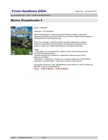 Firma Handlowa GIGA Utworzono : 08 marzec 2017 gry komputerowe > akcji > Marine Sharpshooter 4 Marine Sharpshooter 4 Model : Cit000029 Producent : City Interactive Marine Sharpshooter 4. Świat stanął przed obliczem zagłady nuklearnej. Zostajesz przydzielony do rozprawienia się z prywatną organizacją paramilitarną odpowiedzialną za zaistniałą sytuację. Wciel się w jednego z członków drużyny do zadań specjalnych i pokieruj strzelcem wyborowym lub obserwatorem. Niezauważony zakradnij się na pozycję, namierz cel i zdejmij nieprzyjaciela z chirurgiczną precyzją. Cechy: - Weź udział w 10 rozbudowanych misjach w Iranie, Rosji, Północnej Korei oraz Stanach Zjednoczonych. - Używaj autentycznych karabinów snajperskich, takich jak słynny M14 Sopmod czy M4OA1. - Skorzystaj z noktowizora i rozpraw się z wrogiem czając się w ciemnościach Ulepszone AI przeciwników - uważaj aby nie zostać zauważonym! Wymagania: Pentium III 1GH, 256 MB RAM, Nvidia GeForce 3 lub ATI Radon 64 MB RAM, Windows 98/ME/2000/XP Cena : 9,90 zł Brutto ( 9,90 zł Netto) kontakt : - [email protected] Strona 1