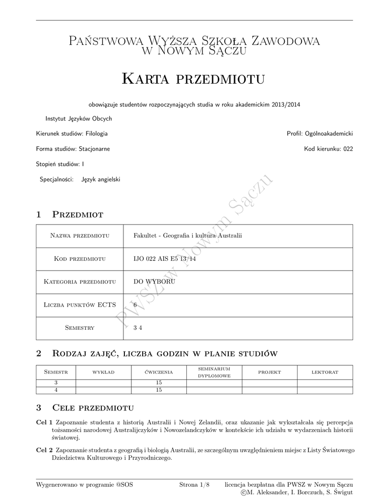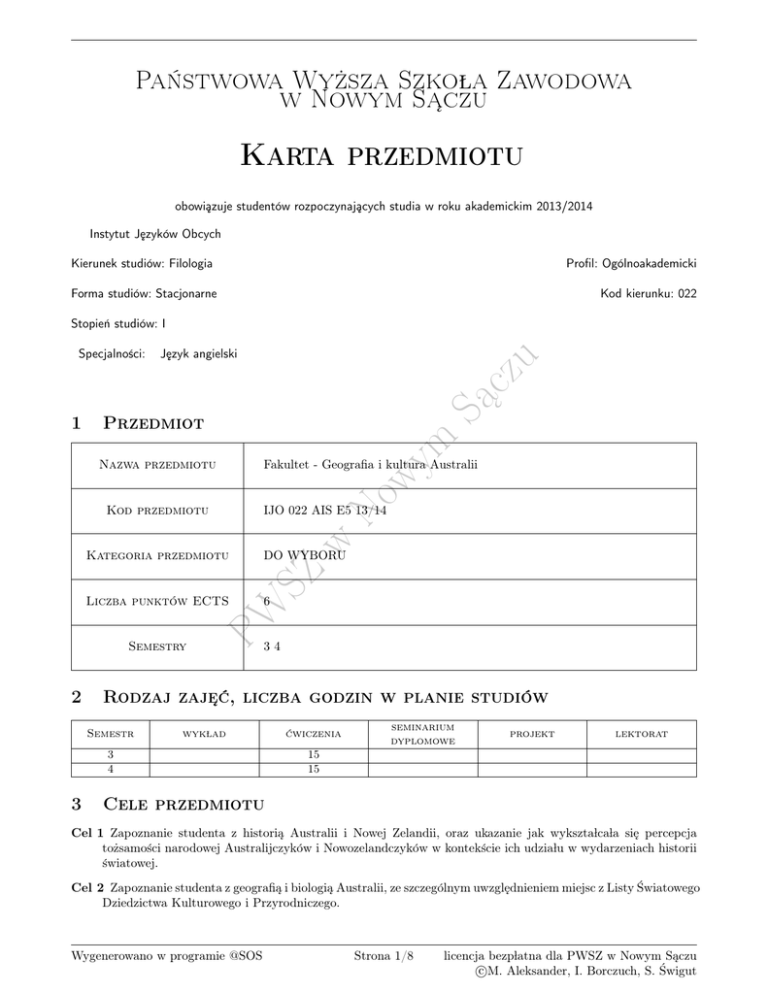 Państwowa Wyższa Szkola Zawodowa w Nowym Sa˛czu Karta przedmiotu obowia˛zuje studentów rozpoczynaja˛cych studia w roku akademickim 2013/2014 Instytut Je˛zyków Obcych Kierunek studiów: Filologia Profil: Ogólnoakademicki Forma studiów: Stacjonarne Kod kierunku: 022 Stopień studiów: I Przedmiot Nazwa przedmiotu w 6 PW Liczba punktów ECTS DO WYBORU SZ Kategoria przedmiotu 2 Fakultet - Geografia i kultura Australii IJO 022 AIS E5 13/14 Kod przedmiotu Semestry No wy m 1 Je˛zyk angielski Sa˛ cz u Specjalności: 34 Rodzaj zaje˛ć, liczba godzin w planie studiów Semestr wyklad 3 4 3 ćwiczenia seminarium dyplomowe projekt lektorat 15 15 Cele przedmiotu Cel 1 Zapoznanie studenta z historia˛ Australii i Nowej Zelandii, oraz ukazanie jak wyksztalcala sie˛ percepcja tożsamości narodowej Australijczyków i Nowozelandczyków w kontekście ich udzialu w wydarzeniach historii światowej. Cel 2 Zapoznanie studenta z geografia˛ i biologia˛ Australii, ze szczególnym uwzgle˛dnieniem miejsc z Listy Światowego Dziedzictwa Kulturowego i Przyrodniczego. Wygenerowano w programie @SOS Strona 1/8 licencja bezplatna dla PWSZ w Nowym Sa˛czu c M. Aleksander, I. Borczuch, S. Świgut Państwowa Wyższa Szkola Zawodowa w Nowym Sa˛czu Cel 3 Zapoznanie studenta ze wspólczesnymi realiami życia w Australii (system polityczny, gospodarka, szkolnictwo, religia, mniejszości narodowe, sporty narodowe itp.) Cel 4 Zapoznanie studenta z wytworami kultury australijskiej (literatura, teatr, film, telewizja, muzyka, malarstwo itp.) ze szczególnym uwzgle˛dnieniem wplywów sztuki i kultury Aborygenów. Cel 5 Wyksztalcenie umieje˛tności wykrywania zależności mie˛dzy procesami kulturowymi i spolecznymi w historii Australii a wyodre˛bnieniem sie˛ je˛zyka australijskiego i jego odmian (cultivated, general, broad). Cel 6 Wyksztalcenie świadomości znaczenia i wartości tego obszaru kulturowego w kontekście kultury światowej, oraz aktywne uczestnictwo w propagowaniu historii i kultury Australii i Nowej Zelandii. 4 Wymagania wste˛pne w zakresie wiedzy, umieje˛tności i innych kompetencji a Brak wymagań. Sa˛ cz u Efekty ksztalcenia 5 EK1 Wiedza: Student wymienia i opisuje kluczowe wydarzenia z historii Australii i Nowej Zelandii i osadza je w kontekście historii światowej. Student objaśnia relacje˛ mie˛dzy tymi wydarzeniami a wyksztalcaniem sie˛ poczucia tożsamości narodowej Australijczyków i Nowozelandczyków. No wy m EK2 Wiedza: Student ma uporza˛dkowana˛ wiedze˛ szczególowa˛ z zakresu geografii i środowiska naturalnego Australii. Student potrafi wykorzystać te informacje do scharakteryzowania glównych gale˛zi przemyslu i turystyki. EK3 Wiedza: Student ma uporza˛dkowana˛ widze˛ szczególowa˛ na temat realiów życia we wspólczesnej Australii, a w szczególności: systemu politycznego, gospodarki, szkolnictwa, religii, mniejszości narodowych, sportów narodowych itp. Student dostrzega i wyjaśnia zwia˛zki mie˛dzy tymi procesami spolecznymi a ksztaltowaniem sie˛ tożsamości narodowej Australijczyków. PW SZ w EK4 Wiedza: Student orientuje sie˛ we wspólczesnym życiu kulturalnym Australii, i jest świadomy jego znaczenia, oddzialywania spolecznego i miejsca w procesie historyczno-kulturowym. Student ma uporza˛dkowana˛ wiedze˛ szczególowa˛ z zakresu literatury, teatru, filmu, telewizji, muzyki, malarstwa itp. ze szczególnym uwzgle˛dnieniem wplywów sztuki i kultury Aborygenów. EK5 Umieje˛tności: Student potrafi wymienić i szczególowo scharakteryzować odmiany je˛zyka australijskiego. Student wykrywa zależności mie˛dzy wydarzeniami historycznymi i procesami spoleczno-kulturowymi a konkretnymi zmianami je˛zykowymi. EK6 Kompetencje spoleczne: Student ma świadomość znaczenia i wartości je˛zyka australijskiego i szeroko poje˛tej kultury australijskiej i nowozelandzkiej w kontekście kultury światowej. Student korzysta z wytworów tej kultury (zasoby internetowe, prezentacje audiowizualne, dyskusyjny klub filmu australijskiego itp.) oraz aktywnie ja˛ propaguje biora˛c udzial w prezentacjach przygotowywanych w ramach Dnia Kultury Je˛zyka. 6 Treści programowe ćwiczenia Lp C1 C2 C3 Tematyka zaje˛ć Opis szczególowy bloków tematycznych A: the ABC of Australia, Aussie soul, Australian facts and figures, Adelaide, administration, Aborigines (Sorry Day and Stolen Generation), animation in Australia and New Zealand. B: Bottany Bay, Brisbane, barbecue, beaches, Bondi Beach C: Canberra, convicts and British colonies in Australia, customs, crocodiles, cinema (film industry & film festivals) in Australia and New Zealand (WETA Digital), car fetishism (Holden Commodore vs. Ford XB Falcon) Wygenerowano w programie @SOS Strona 2/8 Liczba godzin 2 1 2 licencja bezplatna dla PWSZ w Nowym Sa˛czu c M. Aleksander, I. Borczuch, S. Świgut Państwowa Wyższa Szkola Zawodowa w Nowym Sa˛czu C9 C10 C11 C12 C13 C14 C15 C16 C17 C18 C19 C20 C21 C22 C23 C24 C25 C26 7 Sa˛ cz u C8 m C7 No wy C6 w C5 SZ C4 PW Lp ćwiczenia Tematyka zaje˛ć Opis szczególowy bloków tematycznych D: Darwin, demographics (ethnic groups), The Great Depression, (tap) dance (Tap Dogs) E: European discovery and the colonisation of Australia, economy, education & (long distance) education (School of the Air), endangered & extinct species, entertainment [modern comedians: Adam Hills, Tim Minchin, Rove McManus, Andrew Denton, Paul McDermott] F: federation, floods & fires, food / cuisine, Flying Doctors (RFDS), free time (TV picks) G: Gold Rush (Sovereign Hill, Ballarat, Victoria), geography, Great Dividing Range, Great Reef Barrier H: history, Hobart,humour (black, anti-authoritarian, self-mocking), high culture (e.g. construction of Sydney Opera House) and ”prestige” cinema I:industry & natural resources, Indigenous cultural heritage, inventions, islands J: jeopardy (dangerous animals, natural disasters) K: kangaroos, kids television, Kings Cross (a loving look at Australian crime scene) L: la