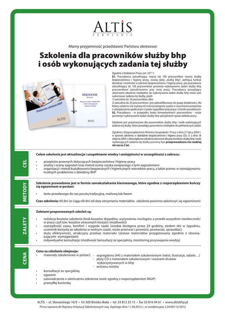 Mamy przyjemność przedstawić Państwu okresowe: Szkolenia dla pracowników służby bhp i osób wykonujących zadania tej służby Zgodnie z Kodeksem Pracy (art. 23711): §1. Pracodawca zatrudniający więcej niż 100 pracowników tworzy służbę bezpieczeństwa i higieny pracy, zwaną dalej „służbą bhp”, pełniącą funkcje doradcze i kontrolne w zakresie bezpieczeństwa i higieny pracy, zaś pracodawca zatrudniający do 100 pracowników powierza wykonywanie zadań służby bhp pracownikowi zatrudnionemu przy innej pracy. Pracodawca posiadający ukończone szkolenie niezbędne do wykonywania zadań służby bhp może sam wykonywać zadania tej służby, jeżeli: 1) zatrudnia do 10 pracowników albo 2) zatrudnia do 20 pracowników i jest zakwalifikowany do grupy działalności, dla której ustalono nie wyższą niż trzecią kategorię ryzyka w rozumieniu przepisów o ubezpieczeniu społecznym z tytułu wypadków przy pracy i chorób zawodowych. §2. Pracodawca - w przypadku braku kompetentnych pracowników - może powierzyć wykonywanie zadań służby bhp specjalistom spoza zakładu pracy. Szkolenie jest przeznaczone dla pracowników służby bhp i osób wykonujących zadania tej służby, które posiadają uprawnienia niezbędne do pełnienia tych zadań. Zgodnie z Rozporządzeniem Ministra Gospodarki i Pracy z dnia 27 lipca 2004 r. w sprawie szkolenia w dziedzinie bezpieczeństwa i higieny pracy (Dz. U. z dnia 18 sierpnia 2004 r.) obowiązkowe szkolenia okresowe dla pracowników służby bhp i osób wykonujących zadania tej służby powinny być przeprowadzane nie rzadziej niż raz na 5 lat. CEL • • • METODY Celem szkolenia jest aktualizacja i uzupełnianie wiedzy i umiejętności w szczególności z zakresu: Szkolenie prowadzone jest w formie samokształcenia kierowanego, które zgodnie z rozporządzeniem kończy się egzaminem w postaci: • przepisów prawnych dotyczących bezpieczeństwa i higieny pracy analizy i oceny zagrożeń oraz metod oceny ryzyka związanego z tymi zagrożeniami organizacji i metod kształtowania bezpiecznych i higienicznych warunków pracy, a także pomoc w rozwiązywaniu trudnych problemów z dziedziny BHP testu przesłanego do nas pocztą tradycyjną, mailową lub faxem Czas szkolenia: 60 dni (w ciągu 60 dni od daty otrzymania materiałów, szkolenie powinno zakończyć się egzaminem) ZALETY Zaletami proponowanych szkoleń są: • • • CENA • redukcja kosztów szkolenia (brak kosztów dojazdów, wyżywienia, noclegów, a przede wszystkim nieobecności w pracy czyli tzw. kosztów utraconych korzyści (możliwości) oszczędność czasu, komfort i wygoda nauki (wiedza dostępna przez 24 godziny, siedem dni w tygodniu, uczestnik korzysta ze szkolenia w wolnym czasie, może przerwać i powrócić, powtarzać, sprawdzać) duża efektywność, atrakcyjny przekaz materiału (zestaw materiałów przygotowany zgodnie z obowiązującymi wymaganiami) indywidualne konsultacje (możliwość konsultacji ze specjalistą, monitoring przyswajania wiedzy) Cena za szkolenie obejmuje: • materiały szkoleniowe w postaci: - segregatora (A4) z materiałem szkoleniowym (tekst, ilustracje, tabele…) - płyty CD z materiałem szkoleniowym i wzorami druków wykorzystywanych w bhp - zestawu testów • konsultacje ze specjalistą • egzamin • zaświadczenie o ukończeniu szkolenia (wzór zgodny z rozporządzeniem MGiP) • przesyłkę kurierską ALTIS • ul. Słowackiego 16/9 • 43-300 Bielsko-Biała • tel. 33 812 35 15 • fax 33 816 94 61 • www.altisbhp.pl Firma wpisana do Rejestru Instytucji Szkoleniowych woj. śląskiego dnia 11.04.2012 r., nr ewidencyjny 2.24/00115/2012