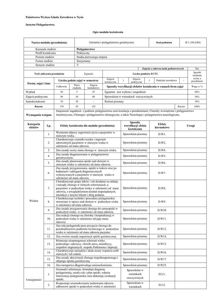 Państwowa Wyższa Szkoła Zawodowa w Nysie Instytut Pielęgniarstwa Opis modułu kształcenia Geriatria i pielęgniarstwo geriatryczne Nazwa modułu (przedmiotu) Kierunek studiów Profil kształcenia Poziom studiów Forma studiów Semestr studiów IP.1./OS-GiPG Kod podmiotu Pielęgniarstwo Praktyczny Studia pierwszego stopnia Stacjonarny V Zajęcia z zakresu nauk podstawowych Formy zajęć i inne Liczba godzin zajęć w semestrze Całkowita - Sposoby weryfikacji efektów kształcenia w ramach form zajęć Waga w % Liczba punktów ECTS Egzamin Tryb zaliczenia przedmiotu Pracy studenta Zajęcia kontaktowe Nie Sposób ustalania oceny z przedmiotu Zajęcia teoretyczne 1 Zajęcia praktyczne 1 Praktyka zawodowa Wykład 50 5 45 Egzamin –test wyboru i uzupełnień 60% Zajęcia praktyczne 90 10 80 Sprawdzian w warunkach rzeczywistych 30% Samokształcenie 30 30 - Referat pisemny 10% 170 45 125 Razem: Wymagania wstępne Kategoria efektów Lp. 1. 2. 3. 4. 5. 6. 7. Wiedza 8. 9. 10. 11. 12. 13. 14. 15. 16. 1. Umiejętności 2. Razem 100% Znajomość zagadnień z podstaw pielęgniarstwa oraz korelacja z przedmiotami: Choroby wewnętrzne i pielęgniarstwo internistyczne, Chirurgia i pielęgniarstwo chirurgiczne, a także Neurologia i pielęgniarstwo neurologiczne. Efekty kształcenia dla modułu (przedmiotu) Wymienia objawy zagrożenia życia u pacjentów w starszym wieku. Charakteryzuje czynniki ryzyka i zagrożeń zdrowotnych pacjentów w starszym wieku w zależności od stanu zdrowia. Zna zasady oceny stanu chorego w starszym wieku. Zna zasady diagnozowania w pielęgniarstwie geriatrycznym. Zna zasady planowania opieki nad chorymi w starszym wieku w zależności od stanu zdrowia. Zna zasady przygotowania, opieki w trakcie oraz po badaniach i zabiegach diagnostycznych wykonywanych u pacjentów w starszym wieku w zależności od stanu zdrowia. Charakteryzuje grupy leków i ich działanie na układy i narządy chorego w różnych schorzeniach, u pacjentów w podeszłym wieku w zależności od stanu zdrowia, z uwzględnieniem działań niepożądanych, interakcji z innymi lekami i dróg podania. Charakteryzuje techniki i procedury pielęgniarskie stosowane w opiece nad chorym w podeszłym wieku w zależności od stanu zdrowia. Zna zasady przygotowania chorego do samoopieki w podeszłym wieku w zależności od stanu zdrowia. Zna reakcje chorego na chorobę i hospitalizację w podeszłym wieku w zależności od jego stanu zdrowia. Zna rolę pielęgniarki przy przyjęciu chorego do przedsiębiorstwa podmiotu leczniczego w podeszłym wieku w zależności od stanu zdrowia pacjenta; Zna swoiste zasady organizacji opieki geriatrycznej. Różnicuje etiopatogenezę schorzeń wieku podeszłego: cukrzycy, chorób serca, miażdżycy, zespołów otępiennych, zespołu Parkinsona i depresji. Charakteryzuje narzędzia i skale oceny wsparcia osób starszych i ich rodzin. Zna zasady aktywizacji chorego niepełnosprawnego i objętego opieką geriatryczną. Zna następstwa długotrwałego unieruchomienia. Gromadzi informacje, formułuje diagnozę pielęgniarską, ustala cele i plan opieki, wdraża interwencje pielęgniarskie oraz dokonuje ewaluacji opieki. Rozpoznaje uwarunkowania zachowania zdrowia odbiorców opieki w podeszłym wieku w zależności Sposoby weryfikacji efektu kształcenia Efekty kierunkowe Sprawdzian pisemny D.W1. Sprawdzian pisemny D.W2. Sprawdzian pisemny D.W4. Sprawdzian pisemny D.W5. Sprawdzian pisemny D.W6. Sprawdzian pisemny D.W7. Sprawdzian pisemny D.W8. Sprawdzian pisemny D.W9. Sprawdzian pisemny D.W10. Sprawdzian pisemny D.W11. Sprawdzian pisemny D.W12. Sprawdzian pisemny D.W14. Sprawdzian pisemny D.W15. Sprawdzian pisemny D.W16. Sprawdzian pisemny D.W17. Sprawdzian pisemny D.W25. Sprawdzian w warunkach rzeczywistych D.U1. Sprawdzian w warunkach D.U2. Uwagi od stanu zdrowia; rzeczywistych 3. Prowadzi poradnictwo w zakresie samoopieki pacjentów w podeszłym wieku, dotyczące wad rozwojowych, chorób i uzależnień; 4. Motywuje chorego i jego opiekunów do wejścia do grup wsparcia społecznego. 5. Prowadzi profilaktykę powikłań w przebiegu chorób. 6. Organizuje izolację chorych zakaźnie w miejscach publicznych i w warunkach domowych; 7. Diagnozuje stopień ryzyka rozwoju odleżyn i dokonuje ich klasyfikacji. 8. Pobiera materiał do badań diagnostycznych. 9. Doraźnie podaje tlen, modyfikuje dawkę stałą insuliny szybko i krótko działającej. 10. Przygotowuje chorego do badań diagnostycznych pod względem fizycznym i psychicznym. 11. Dokumentuje sytuację zdrowotną pacjenta, jej dynamikę zmian i realizowaną opiekę pielęgniarską. 12. Prowadzi edukację w zakresie udzielania pierwszej pomocy w stanach zagrożenia zdrowia. 13. Rozpoznaje stany nagłego zagrożenia zdrowia. 14. Prowadzi żywienie enteralne i parenteralne dorosłych i dzieci z wykorzystaniem różnych technik, w tym pompy obrotowo-perystaltycznej. 15. Rozpoznaje powikłania leczenia farmakologicznego, dietetycznego, rehabilitacyjnego i leczniczopielęgnacyjnego. 16. Prowadzi rozmowę terapeutyczną. Sprawdzian w warunkach rzeczywistych Sprawdzian w warunkach rzeczywistych Sprawdzian w warunkach rzeczywistych Sprawdzian w warunkach rzeczywistych Sprawdzian w warunkach rzeczywistych Sprawdzian w warunkach rzeczywistych Sprawdzian w warunkach rzeczywistych Sprawdzian w warunkach rzeczywistych Sprawdzian w warunkach rzeczywistych Sprawdzian w warunkach rzeczywistych Sprawdzian w warunkach rzeczywistych Sprawdzian w warunkach rzeczywistych Sprawdzian w warunkach rzeczywistych Sprawdzian w warunkach rzeczywistych Sprawdzian w warunkach rzeczywistych 17. 18. Kompetencje społeczne Prowadzi rehabilitację przyłóżkową i usprawnianie ruchowe pacjenta oraz aktywizację z wykorzystaniem elementów terapii zajęciowej; Prowadzi dokumentację opieki nad chorym: kartę obserwacji, zabiegów pielęgniarskich i raportów, kartę rejestru zakażeń szpitalnych, profilaktyki i leczenia odleżyn oraz kartę informacyjną z zalecen