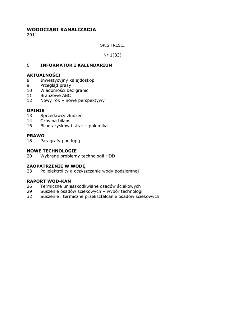 WODOCIĄGI KANALIZACJA 2011 SPIS TREŚCI Nr 1(83) 6 INFORMATOR I KALENDARIUM AKTUALNOŚCI 8 Inwestycyjny kalejdoskop 9 Przegląd prasy 10 Wiadomości bez granic 11 Branżowe ABC 12 Nowy rok – nowe perspektywy OPINIE 13 Sprzedawcy złudzeń 14 Czas na bilans 16 Bilans zysków i strat – polemika PRAWO 18 Paragrafy pod lupą NOWE TECHNOLOGIE 20 Wybrane problemy technologii HDD ZAOPATRZENIE W WODĘ 23 Polielektrolity a oczyszczanie wody podziemnej RAPORT WOD-KAN 26 Termiczne unieszkodliwiane osadów ściekowych 29 Suszenie osadów ściekowych – wybór technologii 32 Suszenie i termiczne przekształcanie osadów ściekowych Nr 2(84) 6 INFORMATOR I KALENDARIUM AKTUALNOŚCI 8 Inwestycyjny kalejdoskop 9 Przegląd prasy 11 Branżowe ABC 12 Co jest trendy? 13 BIBLIOTEKA WOD-KAN OPINIE 14 Gra w monopol 16 Dla wody czystej i trawy zielonej PRAWO 18 Paragrafy pod lupą. Problematyka prawna realizacji budowli przeciwpowodziowych GOSPODARKA WODNA 20 Przydrożne obiekty odwadniające OCZYSZCZANIE ŚCIEKÓW 22 Efektywność fermentacji metanowej osadów RAPORT WOD-KAN 26 Kapilarne membrany i destylacja membranowa 29 Kwasy tłuszczowe i sterole a procesy membranowe 32 Raport-membrany w ochronie środowiska Nr 3(85) 6 INFORMATOR I KALENDARIUM AKTUALNOŚCI 10 Inwestycyjny kalejdoskop 12 Przegląd prasy 13 Wiadomości bez granic 14 Branżowe ABC 15 Produkt czy odpad? 16 BIBLIOTEKA WOD-KAN OPINIE 18 Kozioł ofiarny 20 Gdzie strumyk płynie z wolna...? INFORMATYKA 22 Geograficzne systemy informacyjne 24 Modele symulacyjne sieci wodociągowych PRAWO 28 Paragrafy pod lupą 30 Nowe rozwiązania w ustawie o gospodarce nieruchomościami ZAOPATRZENIE W WODĘ 32 Dobór materiałów rurowych - projekty IVAR i RGA w Norwegii OCZYSZCZANIE ŚCIEKÓW 36 Hybrydowe systemy hydrofitowe w Polsce 38 Współspalanie osadów ściekowych w przemyśle cementowym RAPORT WOD-KAN 42 Beton w kanalizacji - istotne cechy użytkowe 46 Zastosowanie rur betonowych w przewodach wodociągowych 50 Raport - betonowe elementy w kanalizacji Nr 4(86) 6 INFORMATOR I KALENDARIUM AKTUALNOŚCI 10 Inwestycyjny kalejdoskop 12 Przegląd prasy 13 Branżowe ABC 16 Wszystkie drogi wiodą do Białowieży 18 Szkolenie dotyczące technologii bezwykopowych 18 Co z terenami niezurbanizowanymi? OPINIE 20 Kilka słów o emocjach 21 Głos w sprawie marcowej okładki 22 Gotówka potrzebna od zaraz PRAWO 24 Paragrafy pod lupą FINANSE-ZARZĄDZANIE 26 Budżetowanie w PWiK w Bolesławcu ZAOPATRZENIE W WODĘ 30 Technologie membranowe a wody powierzchniowe KANALIZACJA 32 Planowanie przestrzenne - racjonalna gospodarka ściekami OCZYSZCZANIE ŚCIEKÓW 38 Metody zagospodarowania osadów ściekowych RAPORT WOD-KAN 44 Kanalizacja ciśnieniowa - kierunki zmian 48 Przegląd ofert producentów przepompowni i tłoczni ścieków Nr 5(87) 6 INFORMATOR I KALENDARIUM AKTUALNOŚCI 10 Inwestycyjny kalejdoskop 12 Przegląd prasy 14 Wiadomości bez granic 18 Branżowe ABC 20 Tylko w Licheniu 24 Nauka i praktyka 26 Innowacyjnie w Kielcach 28 Targowa tradycja OPINIE 30 Polacy nie gęsi? 32 VAT w kanale 36 O właściwej dokumentacji technicznej 38 Toruńska konferencja opadowa 40 BIBLIOTEKA WOD-KAN WOD-KAN-NET 42 Informatyka w rozkwicie 46 Informowanie o jakości wody w woj. śląskim PRAWO 50 Paragrafy pod lupą 54 Zmiany zasad ustanawiania służebności przesyłu 58 Charakter prawny opomiarowanej cieczy 64 Związki powierzchniowo czynne a stan środowiska - aspekty prawne ZAOPATRZENIE W WODĘ 68 Czynnik alkalizujący w oczyszczaniu wody podziemnej OCZYSZCZANE ŚCIEKÓW 72 Omówienie raportu NIK o realizacji KPOŚK 76 Dezintegracja ultradźwiękowa a współoczyszczanie odcieków RAPORT WOD-KAN 84 Wody opadowe - edukacja i motywacja społeczeństwa 92 Współdziałanie zarządów dróg i urzędów gmin 94 Opłata za deszcz 98 Problemy centrum miasta z wodami opadowymi 104 Przegląd ofert producentów i dystrybutorów systemów odprowadzania wód opadowych Nr 6(88) 6 INFORMATOR I KALENDARIUM AKTUALNOŚCI 10 Inwestycyjny kalejdoskop 11 Kropla świata 14 Branżowe HBC 15 Creme de la creme 16 Czasem słońce, czasem deszcz OPINIE 18 Reguły gry 19 Pamiętajcie o oczyszczalniach 20 Krótka kołdra dla wod-kan 22 Opłaty za ścieki deszczowe POMNIKI TECHNIKI 24 Historia warta poznania PRAWO 26 Paragrafy pod lupą OCZYSZCZANIE ŚCIEKÓW 28 Słońce górą RAPORT WOD-KAN 32 Sieci wod-kan - dobór materiałów 37 Wybrane aspekty dotyczące trwałości rur 41 Zestawienie ofert producentów rur wodociągowych z tworzyw sztucznych Nr 7/8(89/90) 6 INFORMATOR I KALENDARIUM AKTUALNOŚCI 10 Inwestycyjny kalejdoskop 11 Kropla świata 12 Branżowe ABC 13 Zielono mi w Zielonej Górze! 13 Polityka wspierania rozwoju inwestycji OPINIE 14 Według zasług i uznania 15 Montaż małych oczyszczalni ścieków 16 Korytarze - projekt po korekcie PRAWO 18 Paragrafy pod lupą 20 Wpływ leków na stan środowiska - aspekty prawne ZAOPATRZENIE W WODĘ 24 Sporny bilans - atlas rozbiorów sekundowych wody RAPORT WOD-KAN 27 Systemy kanalizacyjne z tworzyw sztucznych 34 Tworzywa sztuczne - aspekty ekonomiczne 40 Zestawienie ofert producentów rur kanalizacyjnych z tworzyw sztucznych Nr 9(91) 6 INFROMATOR I KALENDARIUM AKTUALNOŚCI 10 Inwestycyjny kalejdoskop 12 Kropla świata 14 Na rynku 16 Branżowe ABC 18 Na końcu świata 20 BIBLIOTEKA WOD-KAN OPINIE 22 Powrót do szkoły 24 Co w rurach piszczy? 26 Rady na osady WOD-KAN-NET 28 E-wizytówka PREZENTACJE 32 Bezwykopowa realizacja kolektora w Warszawie PRAWO 36 Paragrafy pod lupą FINANSE-ZARZĄDZANIE 38 Przydomowe oczyszczalnie ścieków w gm. Wierzchlas KANALIZACJA 40 Przeciwdziałanie skutkom zagniwania ścieków OCZYSZCZANIE ŚCIEKÓW 42 Odwrócona osmoza w modułach ST 44 Instalacje membranowe typu „cross flow” 50 Podatność ścieków na rozkład biologiczny RAPORT WOD-KAN 56 Sprzęt do eksploatacji sieci kanalizacyjnej 60 Rozwój sprzętu eksploatacyjnego 64 Zestawienie ofert producentów i dystrybutorów sprzętu eksploatacyjnego sieci wod-kan Nr 10(92) 6