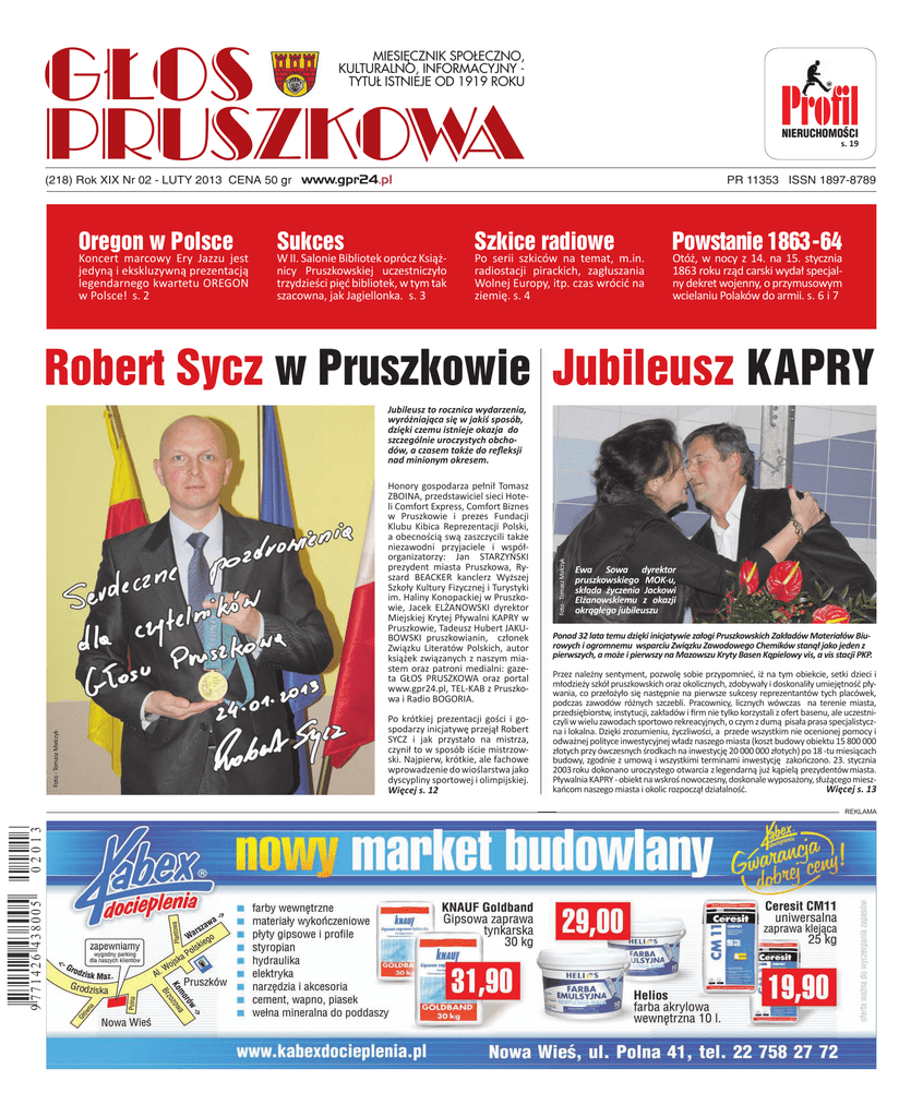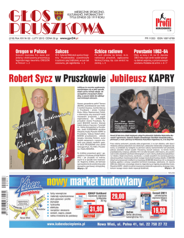 GŁOS PRUSZKOWA MIESIĘCZNIK SPOŁECZNO, KULTURALNO, INFORMACYJNY TYTUŁ ISTNIEJE OD 1919 ROKU Profil NIERUCHOMOŚCI s. 19 (218) Rok XIX Nr 02 - LUTY 2013 CENA 50 gr www.gpr24.pl Oregon w Polsce Koncert marcowy Ery Jazzu jest jedyną i ekskluzywną prezentacją legendarnego kwartetu OREGON w Polsce! s. 2 Sukces W II. Salonie Bibliotek oprócz Książnicy Pruszkowskiej uczestniczyło trzydzieści pięć bibliotek, w tym tak szacowna, jak Jagiellonka. s. 3 PR 11353 ISSN 1897-8789 Szkice radiowe Po serii szkiców na temat, m.in. radiostacji pirackich, zagłuszania Wolnej Europy, itp. czas wrócić na ziemię. s. 4 Powstanie 1863 -64 Otóż, w nocy z 14. na 15. stycznia 1863 roku rząd carski wydał specjalny dekret wojenny, o przymusowym wcielaniu Polaków do armii. s. 6 i 7 Robert Sycz w Pruszkowie Jubileusz KAPRY Foto - Tomasz Malczyk Honory gospodarza pełnił Tomasz ZBOINA, przedstawiciel sieci Hoteli Comfort Express, Comfort Biznes w Pruszkowie i prezes Fundacji Klubu Kibica Reprezentacji Polski, a obecnością swą zaszczycili także niezawodni przyjaciele i współorganizatorzy: Jan STARZYŃSKI prezydent miasta Pruszkowa, Ryszard BEACKER kanclerz Wyższej Szkoły Kultury Fizycznej i Turystyki im. Haliny Konopackiej w Pruszkowie, Jacek ELŻANOWSKI dyrektor Miejskiej Krytej Pływalni KAPRY w Pruszkowie, Tadeusz Hubert JAKUBOWSKI pruszkowianin, członek Związku Literatów Polskich, autor książek związanych z naszym miastem oraz patroni medialni: gazeta GŁOS PRUSZKOWA oraz portal www.gpr24.pl, TEL-KAB z Pruszkowa i Radio BOGORIA. Po krótkiej prezentacji gości i gospodarzy inicjatywę przejął Robert SYCZ i jak przystało na mistrza, czynił to w sposób iście mistrzowski. Najpierw, krótkie, ale fachowe wprowadzenie do wioślarstwa jako dyscypliny sportowej i olimpijskiej. Więcej s. 12 Foto - Tomasz Malczyk Jubileusz to rocznica wydarzenia, wyróżniająca się w jakiś sposób, dzięki czemu istnieje okazja do szczególnie uroczystych obchodów, a czasem także do refleksji nad minionym okresem. Ewa Sowa dyrektor pruszkowskiego MOK-u, składa życzenia Jackowi Elżanowskiemu z okazji okrągłego jubileuszu Ponad 32 lata temu dzięki inicjatywie załogi Pruszkowskich Zakładów Materiałów Biurowych i ogromnemu wsparciu Związku Zawodowego Chemików stanął jako jeden z pierwszych, a może i pierwszy na Mazowszu Kryty Basen Kąpielowy vis, a vis stacji PKP. Przez należny sentyment, pozwolę sobie przypomnieć, iż na tym obiekcie, setki dzieci i młodzieży szkół pruszkowskich oraz okolicznych, zdobywały i doskonaliły umiejętność pływania, co przełożyło się następnie na pierwsze sukcesy reprezentantów tych placówek, podczas zawodów różnych szczebli. Pracownicy, licznych wówczas na terenie miasta, przedsiębiorstw, instytucji, zakładów i firm nie tylko korzystali z ofert basenu, ale uczestniczyli w wielu zawodach sportowo rekreacyjnych, o czym z dumą pisała prasa specjalistyczna i lokalna. Dzięki zrozumieniu, życzliwości, a przede wszystkim nie ocenionej pomocy i odważnej polityce inwestycyjnej władz naszego miasta (koszt budowy obiektu 15 800 000 złotych przy ówczesnych środkach na inwestycję 20 000 000 złotych) po 18 -tu miesiącach budowy, zgodnie z umową i wszystkimi terminami inwestycję zakończono. 23. stycznia 2003 roku dokonano uroczystego otwarcia z legendarną już kąpielą prezydentów miasta. Pływalnia KAPRY - obiekt na wskroś nowoczesny, doskonale wyposażony, służącego mieszWięcej s. 13 kańcom naszego miasta i okolic rozpoczął działalność. REKLAMA 2 GŁOS PRUSZKOWA NR 02/2013 www.gpr24.pl Kultura zaproszenie na Erę Jazzu Legendarny Oregon w Polsce! Koncert marcowy Ery Jazzu jest jedyną i ekskluzywną prezentacją legendarnego kwartetu OREGON w Polsce! OREGON jest ewenementem na jazzowej scenie – rekomenduje koncert Dionizy Piątkowski, szef Ery Jazzu. To bodaj najstarszy zespół, który bez specjalnych przerw i artystycznych zawirowań nagrywa i koncertuje od blisko pół wieku. Charakterystyczna, subtelna muzyka kwartetu na wiele dekad zbliżyła entuzjastów jazzowej tradycji oraz charakterystycznego brzmienia zespołu. To ewenement formalny i stylistyczny w historii muzyki jazzowej, ale także doskonały dowód na wierność artystyczną projektu, znanego na całym świecie jako OREGON. jektów, pracował więc z Artem Landem i Davidem Samuelsem, oraz nawiązał ponownie współpracę przy projekcie Gallery z byłym wiolonczelistą z Consort, Davidem Darlingiem. Basista GLEN MOORE wspólnie koncertował m.in. z Timem Hardinem, Tedem Cursonem, Jake’m Hanną, Zootem Simsem. Nagrywał i koncertował z Nick’em Brignolą (1967) oraz eksperymentalnym zespołem „Synthesizer Show” Paula Bleya (1969-71).Ważnym muzycznym doświadczeniem była także współpraca w „Jazz Consort” Paula Wintera. Jego gra na kontrabasie zaistniała jednak najpełniej w zespole OREGON, Podobnie, jak jego koledzy, Moore bez trudu wypowiadał się językiem muzyki klasycznej, folku, Wschodu i jazzu. Od czasu powstania grupy OREGON w 1970 roku oryginalne brzmienie kontrabasu Moore’a przydawało charakteru każdej z płyt, co więcej, występował na nich także w charakterze altowiolisty i flecisty. Dość chimeryczny styl pracy OREGONu sprawiał, że Moore miał dość czasu by brać regularnie udział w sesjach kierowanych przez innych artystów. Zespół powstał w 1970 roku jako nowoczesna mutacja słynnego warsztatowego Consort Paula Wintera. OREGON utworzyli: gitarzysta i klawiszowiec Ralph Towner, perkusista, sitarzysta, tablista i klarnecista Colin Walcott, basista, skrzypek, pianista i flecista Glen Moore, oraz saksofonista altowy, oboista, klarnecista basowy Paul McCandless. OREGON eksplorował obrzeża jazzu, stapiając w jedną całość elementy klasyki, folku, muzyki hinduskiej i etnicznej. Takie kameralne podejście zmuszało publiczność do ciszy i wielkiej koncentracji, niezbędnych do właściwej percepcji 