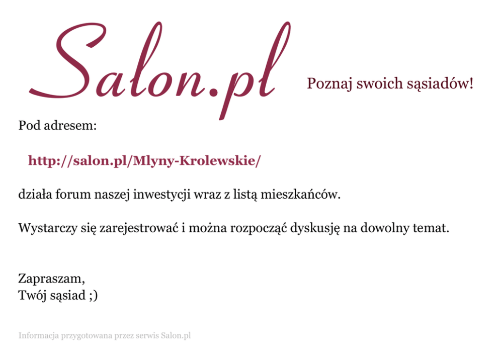 Salon.pl Poznaj swoich sąsiadów! Pod adresem: http://salon.pl/Mlyny-Krolewskie/ działa forum naszej inwestycji wraz z listą mieszkańców. Wystarczy się zarejestrować i można rozpocząć dyskusję na dowolny temat. Zapraszam, Twój sąsiad ;) Informacja przygotowana przez serwis Salon.pl