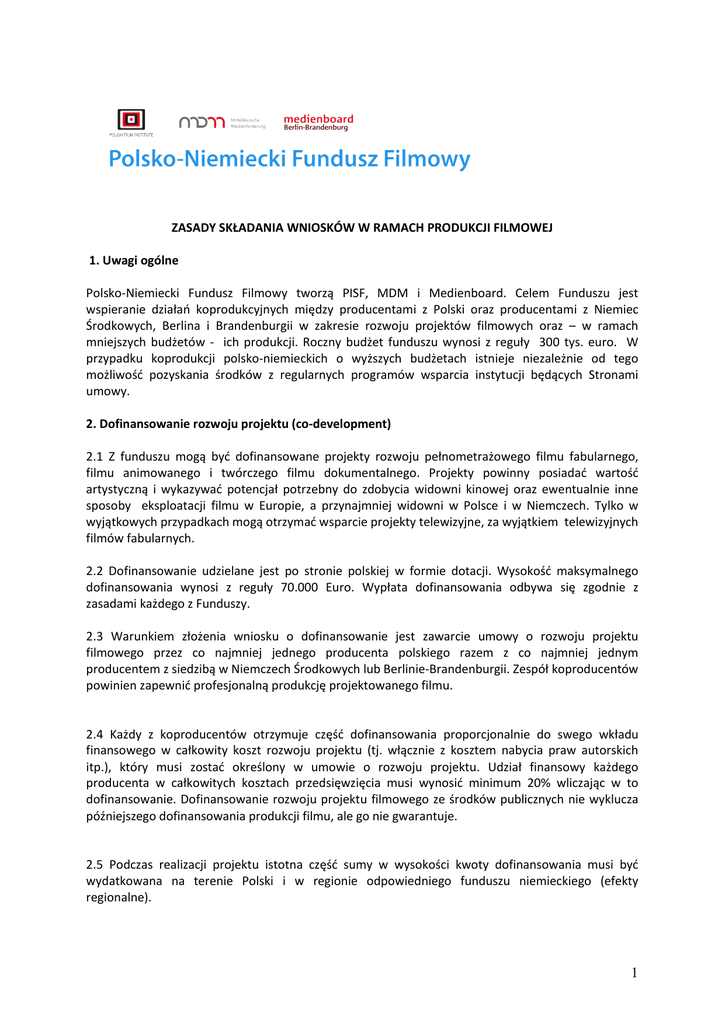 ZASADY SKŁADANIA WNIOSKÓW W RAMACH PRODUKCJI FILMOWEJ 1. Uwagi ogólne Polsko-Niemiecki Fundusz Filmowy tworzą PISF, MDM i Medienboard. Celem Funduszu jest wspieranie działań koprodukcyjnych między producentami z Polski oraz producentami z Niemiec Środkowych, Berlina i Brandenburgii w zakresie rozwoju projektów filmowych oraz – w ramach mniejszych budżetów - ich produkcji. Roczny budżet funduszu wynosi z reguły 300 tys. euro. W przypadku koprodukcji polsko-niemieckich o wyższych budżetach istnieje niezależnie od tego możliwość pozyskania środków z regularnych programów wsparcia instytucji będących Stronami umowy. 2. Dofinansowanie rozwoju projektu (co-development) 2.1 Z funduszu mogą być dofinansowane projekty rozwoju pełnometrażowego filmu fabularnego, filmu animowanego i twórczego filmu dokumentalnego. Projekty powinny posiadać wartość artystyczną i wykazywać potencjał potrzebny do zdobycia widowni kinowej oraz ewentualnie inne sposoby eksploatacji filmu w Europie, a przynajmniej widowni w Polsce i w Niemczech. Tylko w wyjątkowych przypadkach mogą otrzymać wsparcie projekty telewizyjne, za wyjątkiem telewizyjnych filmów fabularnych. 2.2 Dofinansowanie udzielane jest po stronie polskiej w formie dotacji. Wysokość maksymalnego dofinansowania wynosi z reguły 70.000 Euro. Wypłata dofinansowania odbywa się zgodnie z zasadami każdego z Funduszy. 2.3 Warunkiem złożenia wniosku o dofinansowanie jest zawarcie umowy o rozwoju projektu filmowego przez co najmniej jednego producenta polskiego razem z co najmniej jednym producentem z siedzibą w Niemczech Środkowych lub Berlinie-Brandenburgii. Zespół koproducentów powinien zapewnić profesjonalną produkcję projektowanego filmu. 2.4 Każdy z koproducentów otrzymuje część dofinansowania proporcjonalnie do swego wkładu finansowego w całkowity koszt rozwoju projektu (tj. włącznie z kosztem nabycia praw autorskich itp.), który musi zostać określony w umowie o rozwoju projektu. Udział finansowy każdego producenta w całkowitych kosztach przedsięwzięcia musi wynosić minimum 20% wliczając w to dofinansowanie. Dofinansowanie rozwoju projektu filmowego ze środków publicznych nie wyklucza późniejszego dofinansowania produkcji filmu, ale go nie gwarantuje. 2.5 Podczas realizacji projektu istotna część sumy w wysokości kwoty dofinansowania musi być wydatkowana na terenie Polski i w regionie odpowiedniego funduszu niemieckiego (efekty regionalne). 1 2.6 Decyzję o przyznaniu dofinansowania podejmują wspólnie dyrektorzy PISF, MDM i Medienboard, lub wyznaczeni przez nich ich przedstawiciele. Posiedzenia decyzyjne odbywają się dwa razy w roku. 3. Procedura 3.1 Dofinansowanie udzielane jest na podstawie wniosku. Przy składaniu wniosku wykorzystuje się odrębny formularz dla projektów realizowanych w ramach Polsko-Niemieckiego Funduszu Filmowego, który dostępny jest na stronach internetowych PISF, MDM i Medienboard. Aktualne terminy składania wniosków ogłaszane są na w/w stronach. Wniosek wraz ze wszystkimi załącznikami należy złożyć równolegle do wszystkich trzech instytucji – po polsku do PISF, zaś do MDM i Medienboard po niemiecku. Wniosek musi być podpisany przez wszystkich producentów biorących udział w projekcie. Niekompletne wnioski nie będą rozpatrywane. 3.2 Koproducenci wskazują spośród siebie w umowie dot. co-developmentu jednego producenta, który jest odpowiedzialny za złożenie wniosku i rozliczenie dofinansowania. Wniosek i rozliczenie rozpatruje, działając w imieniu wszystkich, jedna z trzech instytucji: PISF, MDM i Medienboard, w zależności od siedziby firmy producenta odpowiedzialnego za wniosek i rozliczenie. 3.3 Stronami umowy o dofinansowaniu są wszyscy producenci i jedna z trzech instytucji: PISF, MDM i Medienboard, odpowiedzialna za rozpatrzenie wniosku i rozliczenie. 3.4 Do wniosku należy dołączyć treatment, przykładową scenę dialogową oraz streszczenie w obu językach: po polsku i po niemiecku (w przypadku filmu dokumentalnego – opis projektu i plan jego realizacji), ponadto szczegółową kalkulację, plan finansowy, podpisaną umowę o co-developmencie, oświadczenie dot. nabycia praw autorskich (włącznie z umowami) i szczegółowe eksplikacje producenckie („producer’s notes”). Pozostałe niezbędne załączniki wynikają z treści formularza wniosku. Niekompletne wnioski nie będą rozpatrywane. 3.5 Dofinansowanie nie może przekraczać 70 % kosztów rozwoju projektu podanych we wniosku, zaś udział wszystkich koproducentów w tych kosztach musi wynosić minimum 30%. 3.6 Plan finansowania powinien uwzględnić odpowiedni wkład własny producenta. 3.7 Polski i niemiecki udział w kosztach rozwoju projektu filmowego musi odpowiadać proporcji przyznanych koproducentom praw w umowie o co-developmencie. Inna proporcja wymaga zgody wszystkich trzech instytucji: PISF, MDM i Medienboard. Z umowy o co-developmencie zawartej między koproducentami musi jednoznacznie wynikać, jaka część kolejnej raty dofinansowania przypadnie każdemu producentowi. 3.8 Dotacja musi zostać spłacona w pierwszym dniu zdjęciowym lub w momencie sprzedaży praw do dofinansowanego projektu. 3.9 Dofinansowanie na rozwój projektu w ramach Priorytetu VI przyznawane jest zarówno dla koprodukcji większościowych jak i mniejszościowych. 4. Pozostałe informacje 4.1 W napisach początkowych i końcowych dofinansowanych filmów, jak również na nośnikach reklamowych w odpowiedniej formie i zgodnie z przyjętymi w branży zasadami musi znaleźć się 2 informacja o współfinansowaniu przez Polsko-Niemiecki Funduszu Filmowy o treści: „Polish-German Film Fund” lub „German-Polish Film Fund”. 4.2 Niniejsze zasady uzupełniają zasady ogólne i regulacje, obowiązujące przy dofinansowywaniu projektów w PISF, MDM oraz Medienboard i są ważne tylko w połączeniu z nimi. 4.3 Przed złożeniem wniosku prosimy o skontaktowanie si