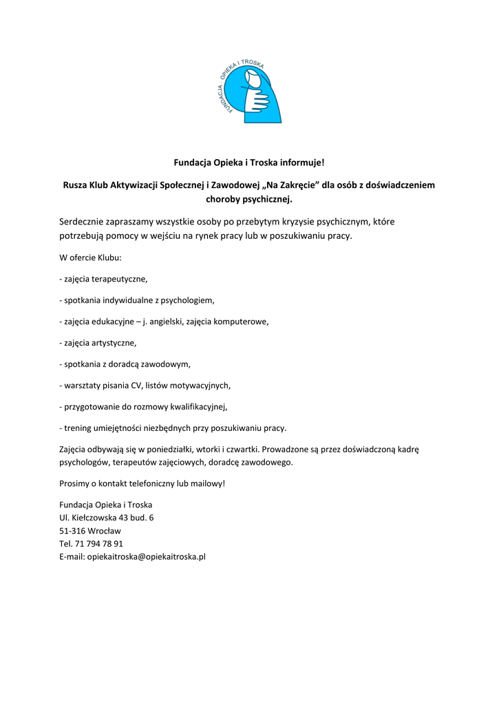 Fundacja Opieka i Troska informuje! Rusza Klub Aktywizacji Społecznej i Zawodowej „Na Zakręcie” dla osób z doświadczeniem choroby psychicznej. Serdecznie zapraszamy wszystkie osoby po przebytym kryzysie psychicznym, które potrzebują pomocy w wejściu na rynek pracy lub w poszukiwaniu pracy. W ofercie Klubu: - zajęcia terapeutyczne, - spotkania indywidualne z psychologiem, - zajęcia edukacyjne – j. angielski, zajęcia komputerowe, - zajęcia artystyczne, - spotkania z doradcą zawodowym, - warsztaty pisania CV, listów motywacyjnych, - przygotowanie do rozmowy kwalifikacyjnej, - trening umiejętności niezbędnych przy poszukiwaniu pracy. Zajęcia odbywają się w poniedziałki, wtorki i czwartki. Prowadzone są przez doświadczoną kadrę psychologów, terapeutów zajęciowych, doradcę zawodowego. Prosimy o kontakt telefoniczny lub mailowy! Fundacja Opieka i Troska Ul. Kiełczowska 43 bud. 6 51-316 Wrocław Tel. 71 794 78 91 E-mail: [email protected]