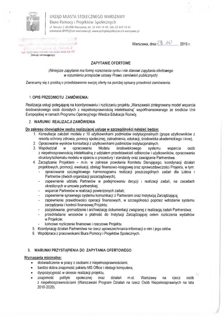 <cr*Ts URZĄD MIASTA STOŁECZNEGO WARSZAWY Biuro Pomocy i Projektów Społecznych ul. Niecała 2,00-098 Warszawa, tel. 22 443 14 40, faks 22 443 14 42 [email protected], www.politykaspoleana.um.warszawa.pl ,VY Warszawa, dnia *?.?/.. A*?.......2016 r. 'CH o* Niecała 2 tel. '(22) 44’3* ■fax>(23) 443- .14.42 (pieczęć zamawianego) ZAPYTANIE OFERTOWE (Niniejsze zapytanie ma formę rozeznania rynku i nie stanowi zapytania ofertowego w rozumieniu przepisów ustawy Prawo zamówień publicznych) Zwracamy się z prośbą o przedstawienie swojej oferty na poniżej opisany przedmiot zamówienia: 1. OPIS PRZEDMIOTU ZAMÓWIENIA: Realizacja usługi polegającej na koordynowaniu i rozliczaniu projektu „Warszawski zintegrowany model wsparcia środowiskowego osób dorosłych z niepełnosprawnością intelektualną” współfinansowanego ze środków Unii Europejskiej w ramach Programu Operacyjnego Wiedza Edukacja Rozwój. 2. WARUNKI REALIZACJI ZAMÓWIENIA Do zakresu obowiązków osoby realizującej usługę w szczególności należeć będzie: 1. Konsultacje założeń modelu z 10 użytkownikami podmiotów instytucjonalnych (grupa użytkowników z resortu ochrony zdrowia, pomocy społecznej, zatrudnienia, edukacji, środowiska akademickiego i inne), 2. Opracowanie wyników konsultacji z użytkownikami podmiotów instytucjonalnych. 3. Współudział w opracowaniu Modelu środowiskowego systemu wsparcia osób z niepełnosprawnością intelektualną z udziałem przedstawicieli odbiorców i użytkowników, opracowaniu struktury/schematu modelu w oparciu o procedury i standardy oraz zawiązanie Partnerstwa. 4. Zarządzanie Projektem - m.in. w zakresie powołania Komitetu Sterującego, koordynacji działań projektowych, promocji, ewaluacji, obsługi finansowo-księgowej oraz sprawozdawczości Projektu, w tym: - opracowanie szczegółowego harmonogramu realizacji poszczególnych zadań dla Lidera i Partnerów (dwóch organizacji pozarządowych), - zapewnienie udziału Partnerów w podejmowaniu decyzji i realizacji zadań, na zasadach określonych w umowie partnerskiej; - wsparcie Partnerów w realizacji powierzonych zadań; - zapewnienie sprawnego systemu komunikacji z Partnerami oraz Instytucją Zarządzającą; - zapewnienie prawidłowości operacji finansowych, w szczególności poprzez wdrożenie systemu zarządzania i kontroli finansowej Projektu; - pozyskiwanie, gromadzenie i archiwizację dokumentacji związanej z realizacją zadań Partnerstwa; - przedkładanie wniosków o płatność do Instytucji Zarządzającej celem rozliczenia wydatków w Projekcie; - końcowe rozliczenie finansowe i rzeczowe Projektu. 5. Koordynację działań Partnerstwa na rzecz upowszechniania informacji o nim i jego celów. 6. Współpraca z pracownikami Biura Pomocy i Projektów Społecznych. 3. WARUNKI PRZYSTĄPIENIA DO ZAPYTANIA OFERTOWEGO Wymagania minimalne: • doświadczenie w pracy z osobami z niepełnosprawnościami, • bardzo dobra znajomość pakietu MS Office i obsługi komputera, • dyspozycyjność w okresie realizacji projektu, • znajomość polityki społecznej oraz działań m.st. Warszawy na rzecz osób z niepełnosprawnościami (Warszawski Program Działań na rzecz OsóbNiepełnosprawnych na lata 2010- 2020). Wymagania oczekiwane: • wyższe wykształcenie, • doświadczenie w realizacji projektów społecznych, w tym doświadczenie w koordynacji projektów społecznych, • doświadczenie we współpracy z organizacjami pozarządowymi, • doświadczenie w pracy w administracji publicznej, • wiedza z zakresu usług i oferty dla osób z niepełnosprawnością intelektualną świadczonych przez różne podmioty, • komunikatywność i umiejętność współpracy w zespole, • sumienność i bardzo dobra organizacja pracy. 4. KRYTERIA OCENY OFERTY: letap - weryfikacja formalna II etap - rozmowa kwalifikacyjna-1 0 0 % w tym: - doświadczenie w realizacji projektów społecznych - 30% wartości oceny, - wiedza w zakresie polityki społecznej oraz działań m.st. Warszawy na rzecz osób z niepełnosprawnościami - 20% wartości oceny, - doświadczenie w pracy z osobami z niepełnosprawnościami - 20% wartości oceny (tabela nr 2) - doświadczenie w opracowywaniu raportów, analiz, prowadzenia badań itp. na rzecz osób z niepełnosprawnościami - 20% wartości oceny, - doświadczenie w pracy w administracji publicznej -10% wartości oceny. 5. TERMIN REALIZACJI ZAMÓWIENIA: od dnia podpisania umowy do 31 stycznia 2017 r., a w przypadku uzyskania zgody od Instytucji Pośredniczącej na zmianę terminu zakończenia realizacji projektu do 28 lutego 2017r. 6. TRYB I TERMIN SKŁADANIA OFERT: 1. Oferta powinna zawierać Formularz ofertowy stanowiący Załącznik nr 1 do zapytania ofertowego, odręcznie podpisane CV z klauzulą zgody na przetwarzanie danych osobowych oraz list motywacyjny. 2. Ofertę należy wysłać pocztą elektroniczną na adres mailowy osoby prowadzącej postępowanie [email protected] do dnia LiSf. .. 2016 r. do godz. 09:00. 7. INNE ISTOTNE WARUNKI ZAMÓWIENIA: a. W przypadku konsorcjum osób fizycznych oferta powinna być podpisana przez osobę wskazaną do reprezentowania konsorcjum. b. Termin płatności za realizację przedmiotu zamówienia: 21 dni od daty złożenia rachunku/ faktury w Biurze, a w przypadku osób fizycznych nieprowadzących działalności gospodarczej do 30 dni od daty złożenia rachunku w Biurze, zgodnie z Umową / zamówieniem. c. Treść umowy z Wykonawcą a w szczególności przedmiot i wysokość wynagrodzenia zostanie opublikowana w Biuletynie Informacji Publicznej m.st. Warszawy. d. Wszystkie materiały przygotowane przez Wykonawcę powinny zostać oznaczone logotypami Zamawiającego oraz zgodnie z zasadami opisanymi w Katalogu Systemu Identyfikacji Wizualnej m.st. Warszawy, a w przypadku projektów współfinansowanych z funduszy europejskich zgodnie z Wytycznymi do tych funduszy e. Wykonawca jest związany ofertą nie dłużej niż 30 dni od dnia 