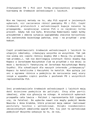 Zrównywanie PO i PiS jest formą propisowskiej propagandy kierowaną do środowisk wolnościowych i laickich. Nie ma lepszej metody na to, aby PiS wygrał w jesiennych wyborach, niż zacieranie różnić pomiędzy PO i PiS. Część środowisk prolaickich i wolnościowych kupuje naiwnie tę propagandę, zwiększając szanse PiS o co najmniej kilka procent. Gdyby tak nie było, Bronisław Komorowski nadal byłby prezydentem i obecna sytuacja wyglądałaby znacznie korzystniej dla zwolenników świeckiego państwa, oraz – na przykład – praw kobiet. Część przedstawicieli środowisk wolnościowych i laickich to utopijni ideolodzy, zrównujący wszystko ze wszystkim. Tak jak nie widzą oni często różnicy między USA i Rosją (tu przemoc i tam przemoc…), tak nie dostrzegają istotnych różnic między Ewą Kopacz a Jarosławem Kaczyńskim (lub na przykład z nie mniej (a może i bardziej?) fanatyczną od Jarosława Kaczyńskiego Beatą Szydło). Dla szkodliwych dla naszych interesów „zrównywaczy” Kopacz to katoliczka i Kaczyński to katolik. Nie pytają już oni o ogromne różnice w podejściu do narzucania swej wiary innym w wypadku części posłów i posłanek PO i wszystkich reprezentantów PiS. Inni przedstawiciele środowisk wolnościowych i laickich mają dość dziecinne podejście do polityki. Chcą albo partii idealnej, albo nie głosują na nikogo. W ostatnich wyborach przepadła cała lewica – Palikot i reprezentanta SLD (zgadzam się, że fatalna). Do wyborów nawet nie mogły podejść Wanda Nowicka i Anna Grodzka, które przecież mają zamiar realizować postulaty laickie i wolnościowe. Dzięki nieobecności zdziecinniałych idealistów wygrał PiS. Czy jest to wartościowe podejście? Wszystko wskazuje na to, że nie… Wyobraźmy sobie, że przyszłość nowoczesnej Polski jest celem, do którego chcielibyśmy dojechać. Chcielibyśmy lecieć tam z prędkością 900 km/g. Ale mamy to co mamy. Czyli PO, które jedzie tam 80 km/h i czasem przystaje, oraz PiS, który jedzie do tyłu pędząc co najmniej jak jakiś antyTGV, czyli 300 km/g, ale do tyłu, w stronę średniowiecza (czego część apologetów PiS wcale nie ukrywa). Złościmy się, że PO nie przegłosowała związków partnerskich. Ale nie widzimy, że liderzy PO to popierają, podobnie jak 70% posłów i posłanek. Do wyboru mamy PiS, gdzie wszyscy są przeciw i chętnie dorzucą do tego całkowity zakaz aborcji, czyli zmuszanie nastolatek do rodzenia po gwałcie, być może w aresztach, aby matka na siłę nie mogła nic zrobić. Złościmy się, że w PO jest dużo ludzi konserwatywnych i wierzących, ale nie widzimy, że mimo to szukają jakiejś platformy porozumienia, uwzględniając postulaty liberalne i prolaickie. Tymczasem aktywiści PiS są dumni czyniąc Polskę jedynie katolicką i opartą na konserwatywnych wartościach. PO aktywnie sprzeciwiła się prof. Chazanowi, PiS może go uczynić ministrem zdrowia. Komorowski podpisał ustawę antyprzemocową, wcześniej posłowie i posłanki PO ją przegłosowali. W przypadku PiS wszyscy byliby przeciwko tej ustawie, nie troszcząc się o pogorszenie stosunków z UE. Irytuje nas obecność polityków PO na uroczystościach religijnych. Tymczasem PiS ma swoje religijne i antysemickie Radio Maryja, na które już, za czasu swoich rządów, próbował przekazywać bezprawnie środki, z częściowym powodzeniem (a byłoby całkowite, gdyby mieli więcej czasu). Andrzej Duda nie tyle pokazywał się na uroczystościach religijnych, co raczej razem z „naszymi kochanymi biskupami” celebrował msze. Nie widziałem, aby Komorowski czy Kopacz robili coś podobnego, choć owszem, pokazywani byli w towarzystwie osób duchownych. Nie dawno odbył się Marsz Równości w Warszawie. Patronowała mu minister do spraw równości Fuszara, związana z rządem PO. Za PiSu takie marsze będą zakazane i tylko samorządy w rękach PO będą w stanie sprzeciwiać się władzom centralnym PiS. Już teraz rysuje się konflikt między prezydentką Warszawy Hanną Gronkiewicz Walc a Andrzejem Dudą, który chce uczcić pełne kłamstw i nienawiści miesiącznice smoleńskie pomnikiem na ich miejscu, przed pałacem prezydenckim. Dla symboliki nienawistnych miesięcznic chce nawet Duda niezależność władz samorządowych Warszawy. ingerować w Członkowie PO zostali nagrani. Teraz tę aferę wygrzebano, aby PiS więcej ugrał. Tymczasem na taśmach mamy głównie mocny język, sąd nie dowiódł przestępstw i pewnie nie dowiedzie zbyt wiele. Dlaczego posłowie i posłanki PiS nie zostali nagrani? Dlaczego wyborcy skrajnie naiwnie łudzą się, że są oni kulturalni w prywatnych rozmowach i odżywiają się jak asceci? Moim zdaniem jesteśmy w ostatniej chwili, aby się zbudzić. Aby uniemożliwić zwycięstwo PiS i nie mniej klerykalnego i konserwatywnego Kukiza. Jeśli nie mamy w zanadrzu jakiejś super partii pędzącej 900 km/g w stronę nowoczesnej i laickiej Polski, pozostaje nam głównie PO. Pamiętajmy, że koalicja PiS – Kukiz może zmienić naszą konstytucję i usunąć z niej wszelkie niekatolickie i niekonserwatywne elementy. Może w nią wpisać też swoje ulubione teorie spiskowe, jak zamach smoleński, czy obowiązek nadzoru PiS nad wyborami, bo przecież „gdy PiS ich nie wygrywa, automatycznie należy uznać je za sfałszowane”…