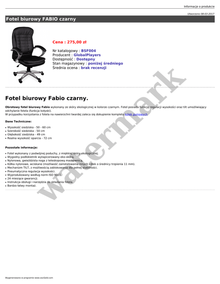 Informacje o produkcie Utworzono 08-03-2017 Fotel biurowy FABIO czarny Cena : 275,00 zł er m ar k Nr katalogowy : BSF004 Producent : GlobalPlayers Dostępność : Dostępny Stan magazynowy : poniżej średniego Średnia ocena : brak recenzji Fotel biurowy Fabio czarny. Obrotowy fotel biurowy Fabio wykonany ze skóry ekologicznej w kolorze czarnym. Fotel posiada funkcję regulacji wysokości oraz tilt umożliwiający odchylanie fotela (funkcja kołyski). W przypadku korzystania z fotela na nawierzchni twardej zaleca się dokupienie kompletu kółek gumowych. Dane Techniczne: ● ● ● ● Wysokość siedziska - 50 - 60 cm Szerokość siedziska - 50 cm Głębokość siedziska - 49 cm Realna wysokość oparcia - 72 cm Pozostałe informacje: ● ● ● ● ● ● ● ● w ● Fotel wykonany z podwójnej poduchy, z miękkiej skóry ekologicznej. Wygodny podłokietnik wytapicerowany eko-skórą. Nylonowa, gwieździsta noga z teleskopową maskownicą. Kółka nylonowe, wciskane (możliwość zainstalowania innych kółek o średnicy trzpienia 11 mm). Mechanizm TILT, z możliwością zablokowania dla pełnej stabilności. Pneumatyczna regulacja wysokości. Wyprodukowany według norm ISO 9001. 24 miesiące gwarancji. Instrukcja obsługi i narzędzia do składania fotela. Bardzo łatwy montaż. at ● Wygenerowano w programie www.oscGold.com