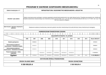 29 PROGRAM W ZAKRESIE GOSPODARKI MIESZKANIOWEJ Zadanie inwestycyjne nr 11 INFRASTRUKTURA I BUDOWNICTWO MIESZKANIOWE w BOGATYNI Charakter i opis zadania Zadanie noworozpoczynane wynikające z potrzeby zaspokojenia potrzeb lokalnej społeczności oraz zadań własnych gminy. Przewiduje się pozyskanie ww. działek pod kompleks budownictwa mieszkaniowego oraz infrastrukturę zieloną :8/13,8/15,AM 3 obr. II,1/6,1/35,1/36,1/37,3/9,3/24,3/25,3/27,AM 4 obr. II,1/177,AM 1 obr.I oraz 1/10 AM 2 obr.I położone w Bogatyni. Opis korzyści i zagrożeń związanych z zadaniem Zwiększenie substancji mieszkaniowej, stworzenie godnych warunków mieszkaniowych dla osób dla których zakup mieszkania jest nieosiągalny HARMONOGRAM FINANSOWANIA ZADANIA CAŁKOWITE WYDATKI W LATACH: 2006 2007 2008 2009 2010 2011 2012 2013 2014 Razem 2006-2014 Badania geologiczne 35 000,00 zł 35 000,00 zł Dokumentacja projektowo kosztorysowa - mieszkania socjalne 25 000,00 zł 25 000,00 zł Dokumentacja projektowo kosztorysowa - mieszkania komunalne 50 000,00 zł 50 000,00 zł Proces inwestycyjny - roboty budowlane Ogółem 0,00 zł 110 000,00 zł 1 000 000,00 zł 2 400 000,00 zł 4 000 000,00 zł 2 000 000,00 zł 2 000 000,00 zł 1 000 000,00 zł 2 400 000,00 zł 4 000 000,00 zł 2 000 000,00 zł 2 000 000,00 zł 11 400 000,00 zł 0,00 zł OSTATECZNE ŹRÓDŁA FINANSOWANIA ŚRODKI WŁASNE GMINY ŚRODKI ZEWNĘTRZNE 9 208 000,00 zł 2 302 000,00 zł 0,00 zł 11 510 000,00 zł