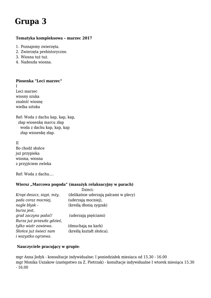 Grupa 3 Tematyka kompleksowa – marzec 2017 1. 2. 3. 4. Poznajemy zwierzęta. Zwierzęta prehistoryczne. Wiosna tuż tuż. Nadeszła wiosna. Piosenka "Leci marzec" I Leci marzec wiosny szuka znaleźć wiosnę wielka sztuka Ref: Woda z dachu kap, kap, kap, złap wiosenkę marcu złap woda z dachu kap, kap, kap złap wiosenkę złap. II Bo chodź słońce już przypieka wiosna, wiosna z przyjściem zwleka Ref: Woda z dachu.... Wiersz „Marcowa pogoda” (masażyk relaksacyjny w parach) Dzieci: Kropi deszcz, siąpi, mży, (delikatnie uderzają palcami w plecy) pada coraz mocniej, (uderzają mocniej), nagle błysk (kreślą dłonią zygzak) burza jest, grad zaczyna padać! (uderzają pięściami) Burza już przeszła gdzieś, tylko wiatr zawiewa. (dmuchają na kark) Słońce już świeci nam (kreślą kształt słońca). i wszystko ogrzewa. Nauczyciele pracujący w grupie: mgr Anna Jedyk - konsultacje indywidualne: I poniedziałek miesiaca od 15.30 - 16.00 mgr Monika Uszakow (zastępstwo za Z. Pietrzak) - konultacje indywidualne I wtorek miesiąca 15.30 - 16.00 mgr Zofia Pietrzak